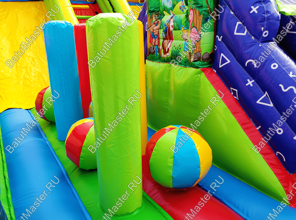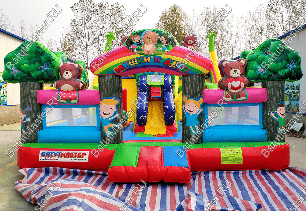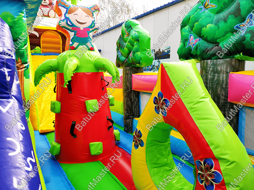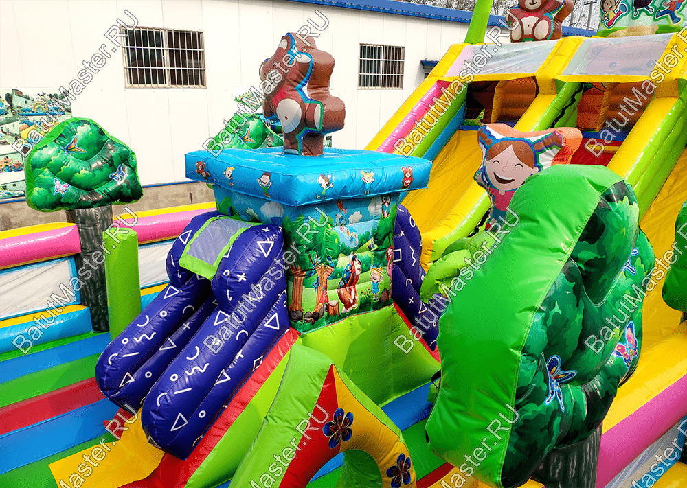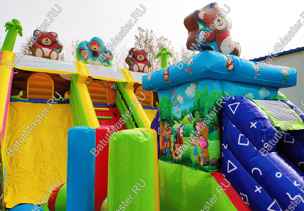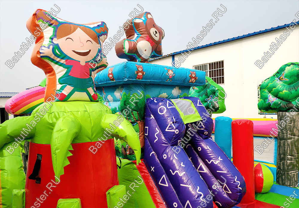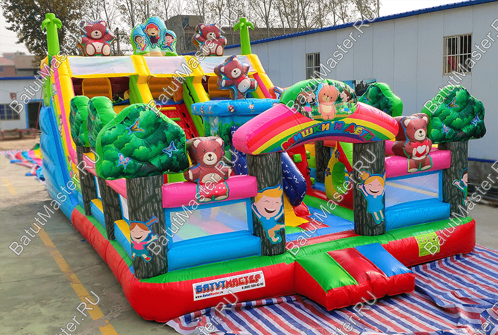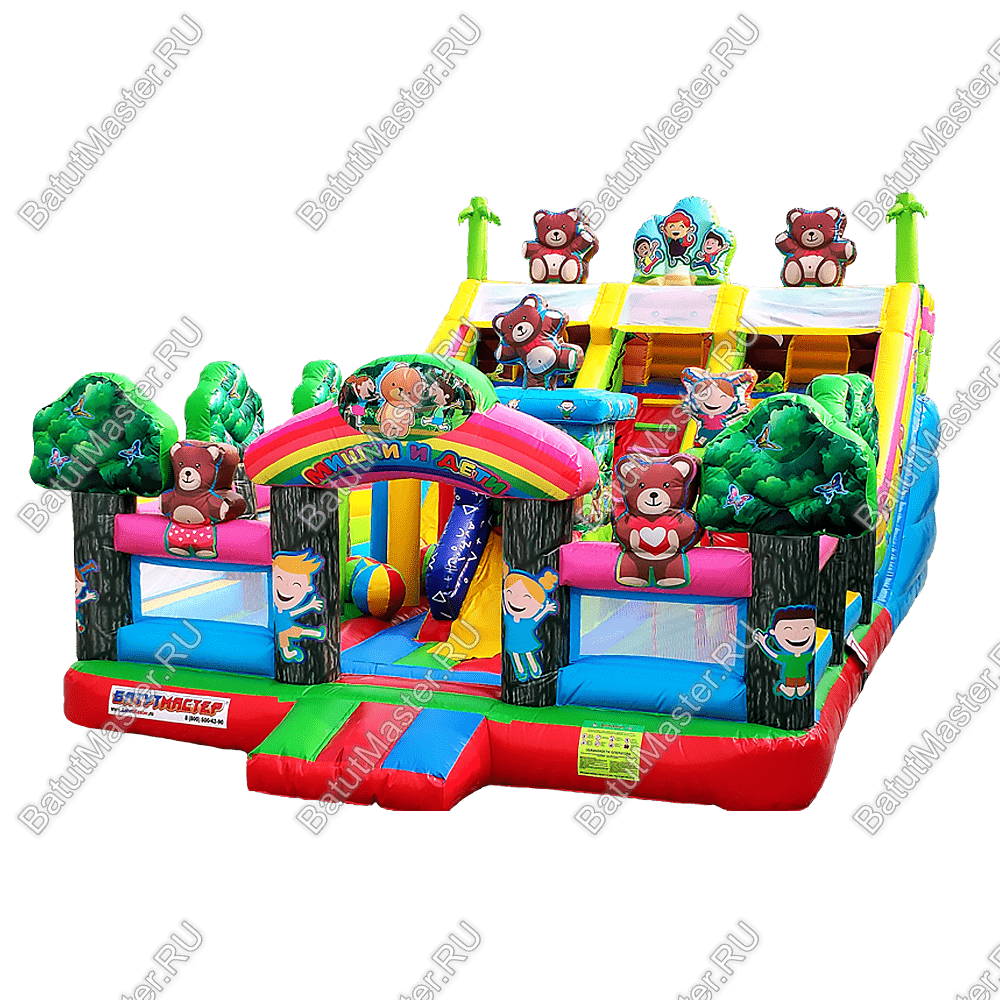 Веселиться, прыгать, карабкаться вверх и спускаться вниз так нравится детям! Надувной батут «Мишкина полянка» ждет маленьких первооткрывателей, чтобы по - настоящему удивить и подарить самые яркие эмоции и незабываемые впечатления. Прямо со входа малыши могут прыгать и подлетать ввысь, ведь тут имеется огромное поле для невероятных прыжков. Веселые надувные модули в виде деревьев, цветов, мишки и его друзей создают атмосферу солнечного игровой поляны. Яркие цвета, интересное наполнение батута сделает его популярным за короткое время среди детей разного возраста. Также он оснащен подъемом и спуском, а наверху имеются домики, где можно уединяться или прятаться друг от друга.По бокам коммерческий батут защищен высокими надувными бортами в рост человека, что предотвращает от выпадения, а также спереди имеется прочная сетка. Так, образом родители смогут наблюдать за детьми.Комплекс предназначен для бизнеса. Он легко устанавливается на ровную поверхность и может использоваться даже на песке. Отлично подойдет в качестве полноценной игровой зоны для детей на территории гостиницы или торгово-развлекательного центра. Занимает не много места в то же время оснащен наполнен самыми интересными модулями и зонами для активных игр.