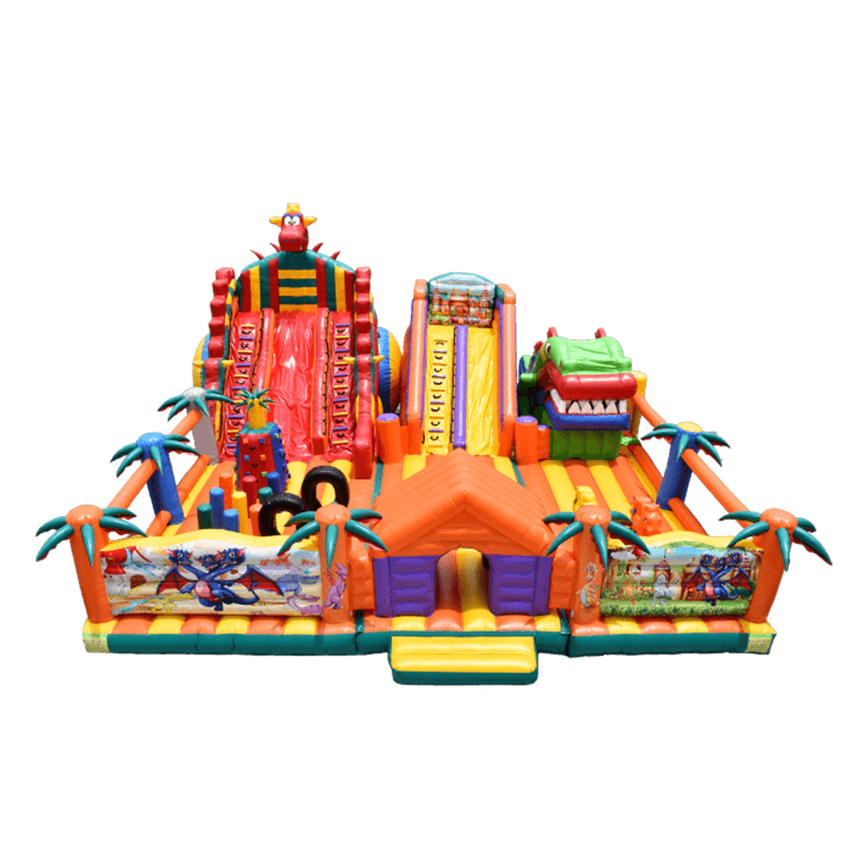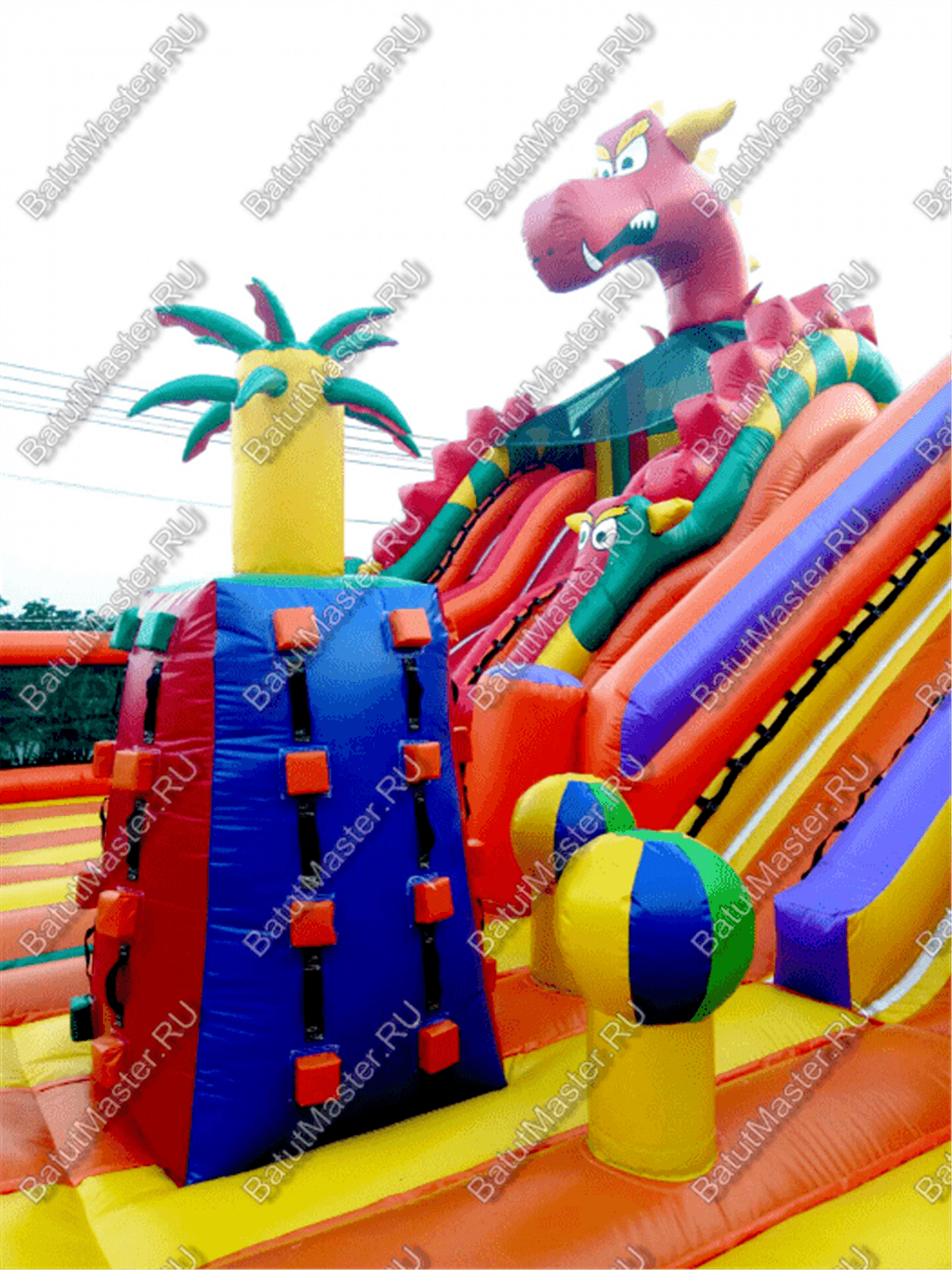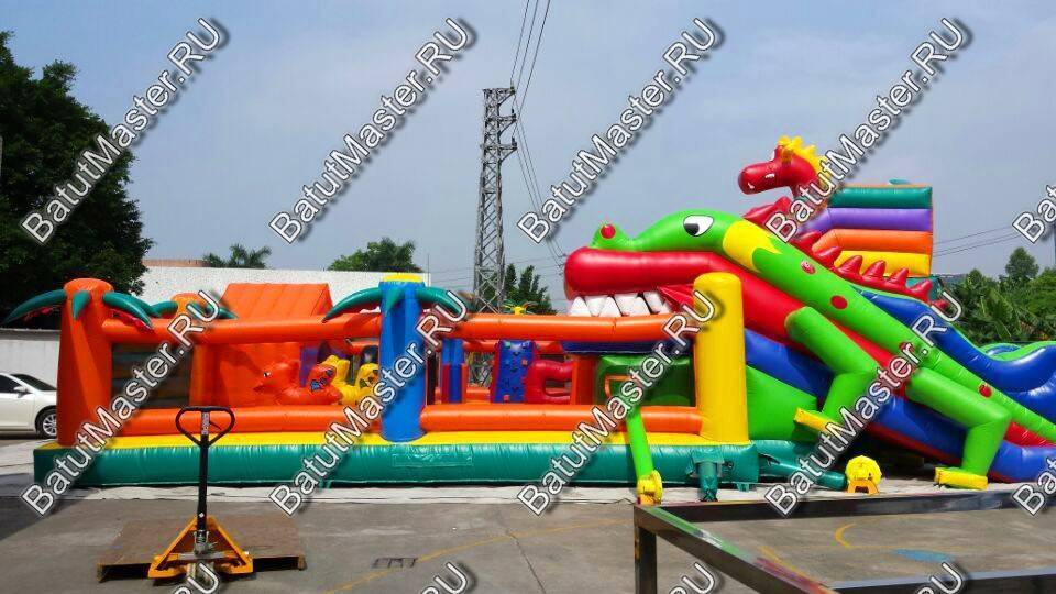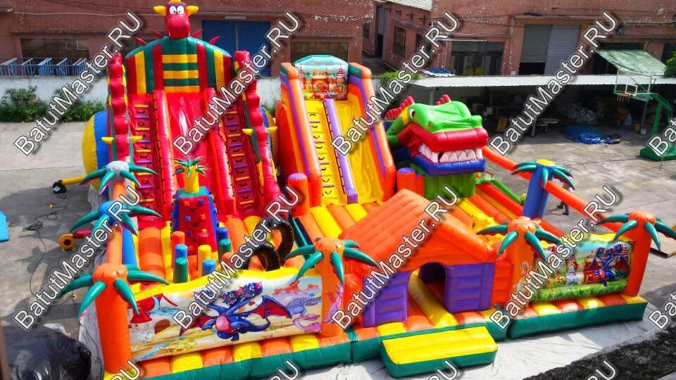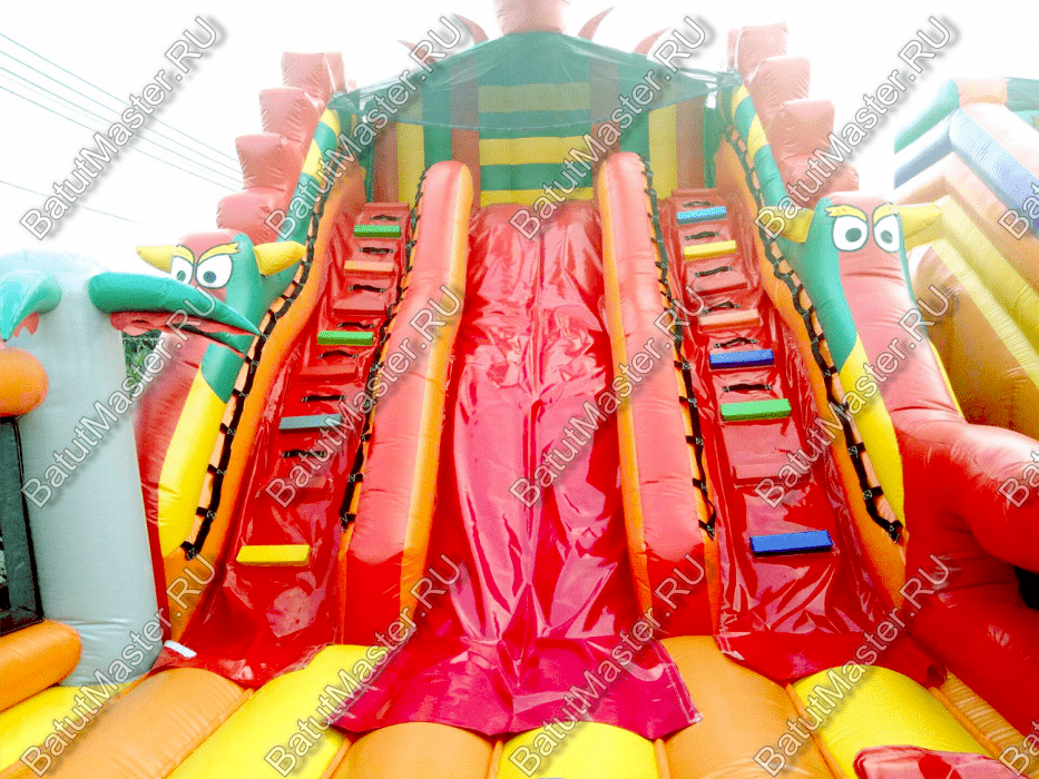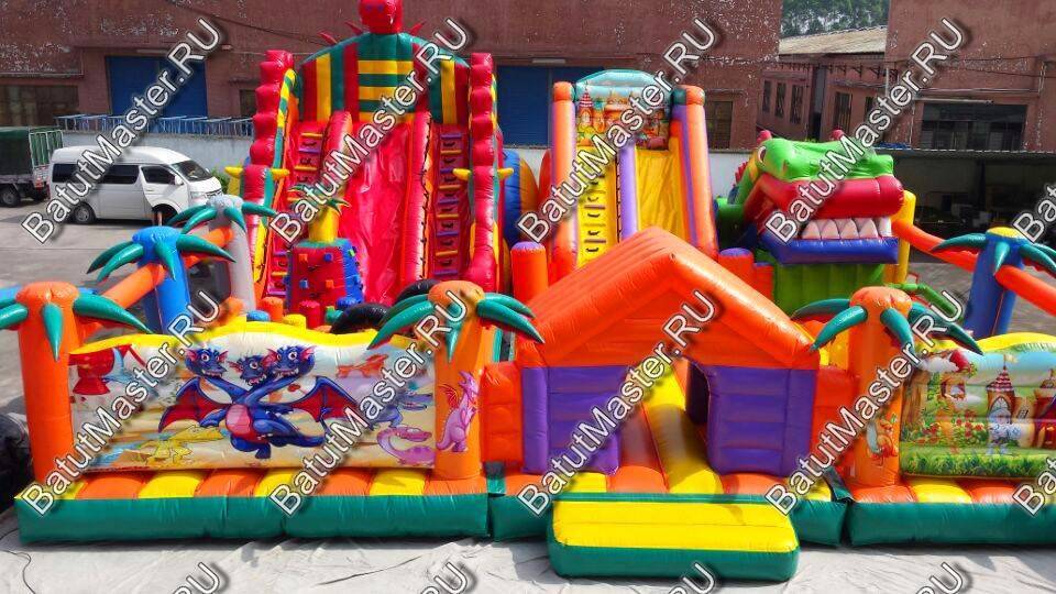 Игровой мягкий батут с игровыми фигурами в виде драконаДетский батут с двумя горками и робот пастью в виде головы драконаНавстречу драконамНи что так не страшит и не завлекает детей одновременно, как сказочные драконы. Они являются популярными и мифическими персонажами еще с давних времен, поэтому ни один ребенок не откажется побывать в обществе этих волшебных существ. Начинается батут с входа в виде надувного домика, за которым дальше расположено достаточно места для прыжков и для бега. По всему периметру вместо опор установлены яркие оранжевые и синие пальмы. Фасадная сторона полностью закрыта надувным ограждением с изображениями драконов, а боковые стенки наоборот - почти прозрачные.У задней стенки установлены две высокие горки желтого и красного цвета, последняя немного больше первой. А с правой стороны размещается огромная голова дракона с робот пастью. Это как раз именно то, что дети воспринимают с особенным восторгом и восхищением. Но чтобы добраться до самых увлекательных игровых фигур, придется преодолеть препятствия в виде скалы, туннеля и других мягких преград. Множество декоративных фигур на батуте помогают поддерживать магическую атмосферу аттракциона.