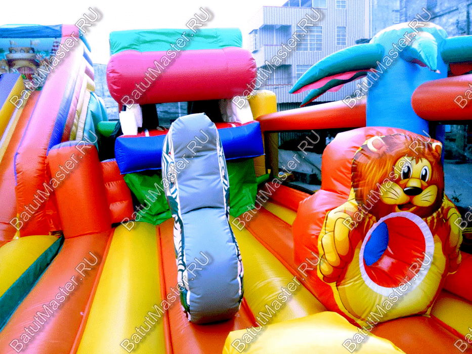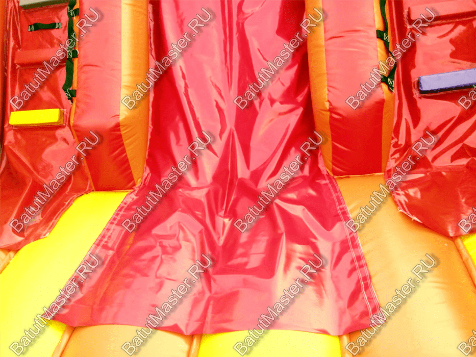 У задней стенки установлены две высокие горки желтого и красного цвета, последняя немного больше первой. А с правой стороны размещается огромная голова дракона с робот пастью. Это как раз именно то, что дети воспринимают с особенным восторгом и восхищением. Но чтобы добраться до самых увлекательных игровых фигур, придется преодолеть препятствия в виде скалы, туннеля и других мягких преград. Множество декоративных фигур на батуте помогают поддерживать магическую атмосферу аттракциона.