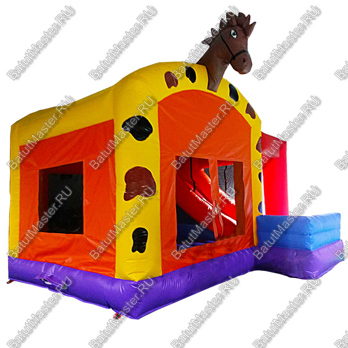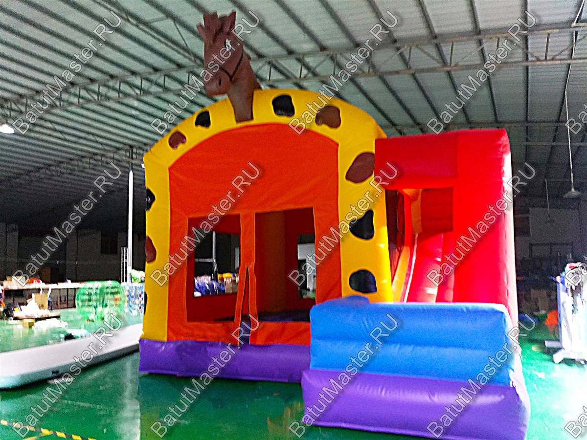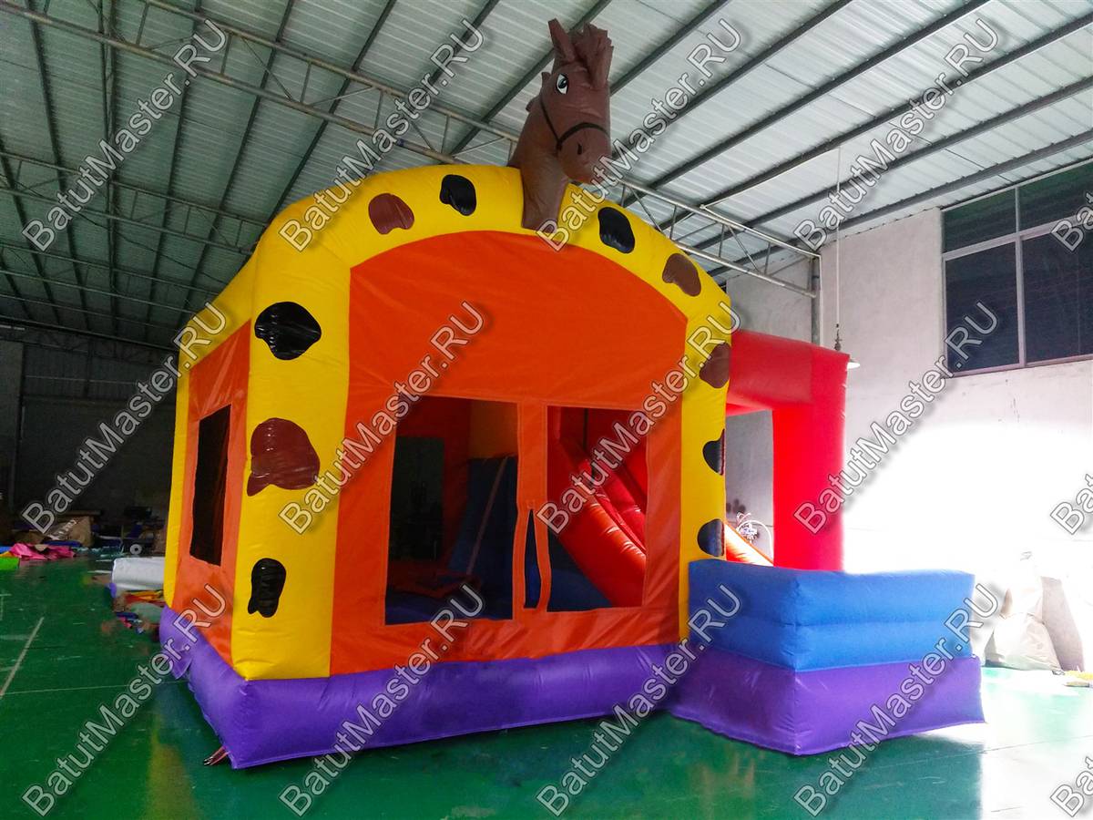 Надувной батут «Ранчо» - это компактный, яркий и стилизованный комплекс. Он несомненно приведет детей в восторг и привлечет их внимание. Внутри батута имеется небольшая горка с подъемом, а также место для прыжков. Наверху комплекс украшает надувная лошадка.