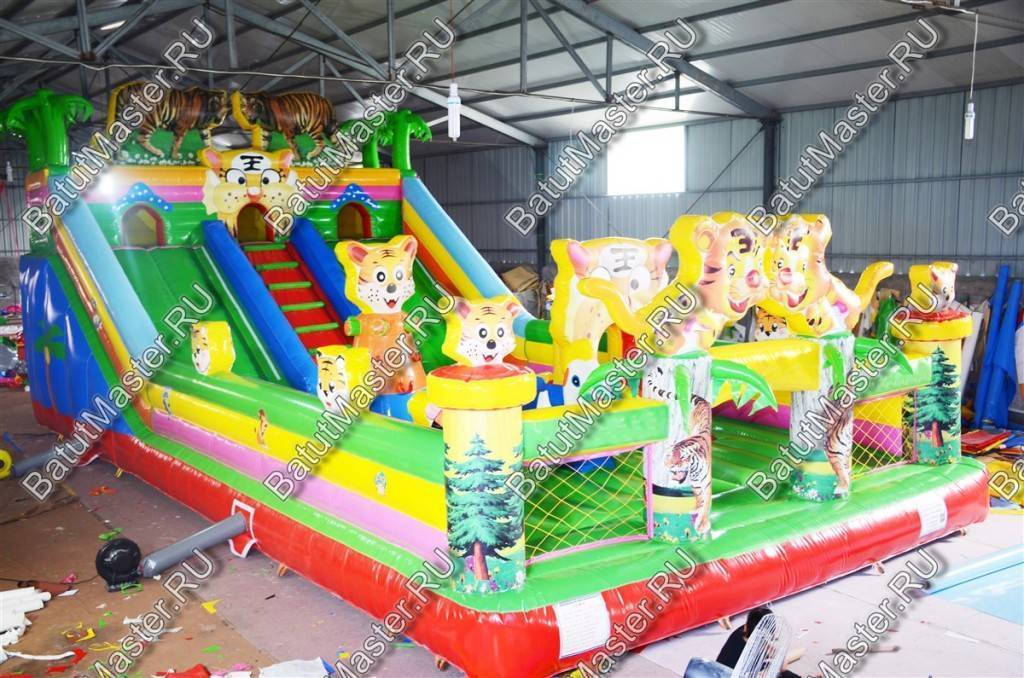 Уличный батут, переполненный самыми разными тиграми: от маленьких и добрых до больших и хищныхКоммерческий батут в виде просторной площадки еще в самом начале оформлен фигурами забавных тигрят, а на высоких горках установлены взрослые и хищные особиОпасные кошкиНи что так не веселит детей, как опасность или страх. А хищные животные, с которыми к тому же можно и попрыгать, привлекут внимание детворы особенно. Коммерческий батут уже в первые дни проката наберет ошеломляющую популярность. Фасадная сторона яркого батута оформлена фигурами веселых и добрых маленьких тигрят, настоящие хищники притаились у задней стенки и ждут посетителей, чтобы устроить им незабываемые спуски с горок.Передняя стенка состоит из арки с пальмами, а угловые пальмы изображают настоящие ели, то есть в уличном батуте переплетаются тигриные особи из разных концов мира – уссурийский из Востока России и африканский из джунглей. По настоящее удовольствие ждет детей у задней стенки, где начинается подъем на две высокие горки. Вход наверх выполнен в виде пасти тигра, с не и начинается путь по удлиненному домику с двумя выходами на правую горку и на левую. Наивысшая точка аттракциона украшена огромными фигурами двух тигров и красочными верхушками пальм.