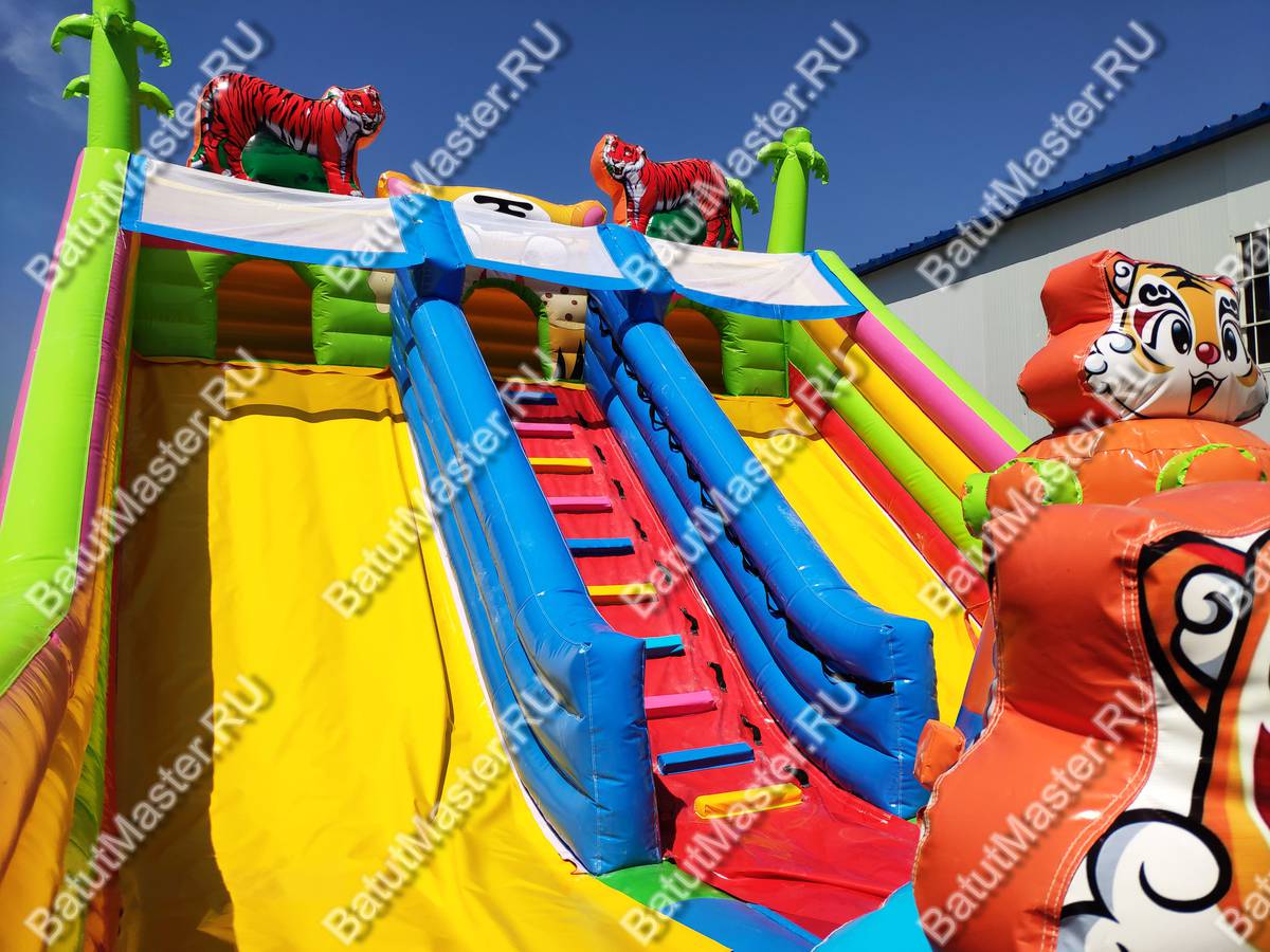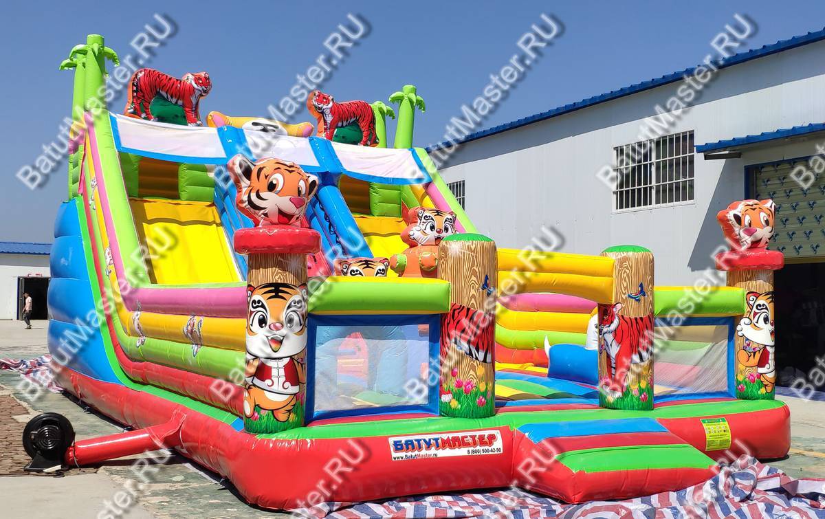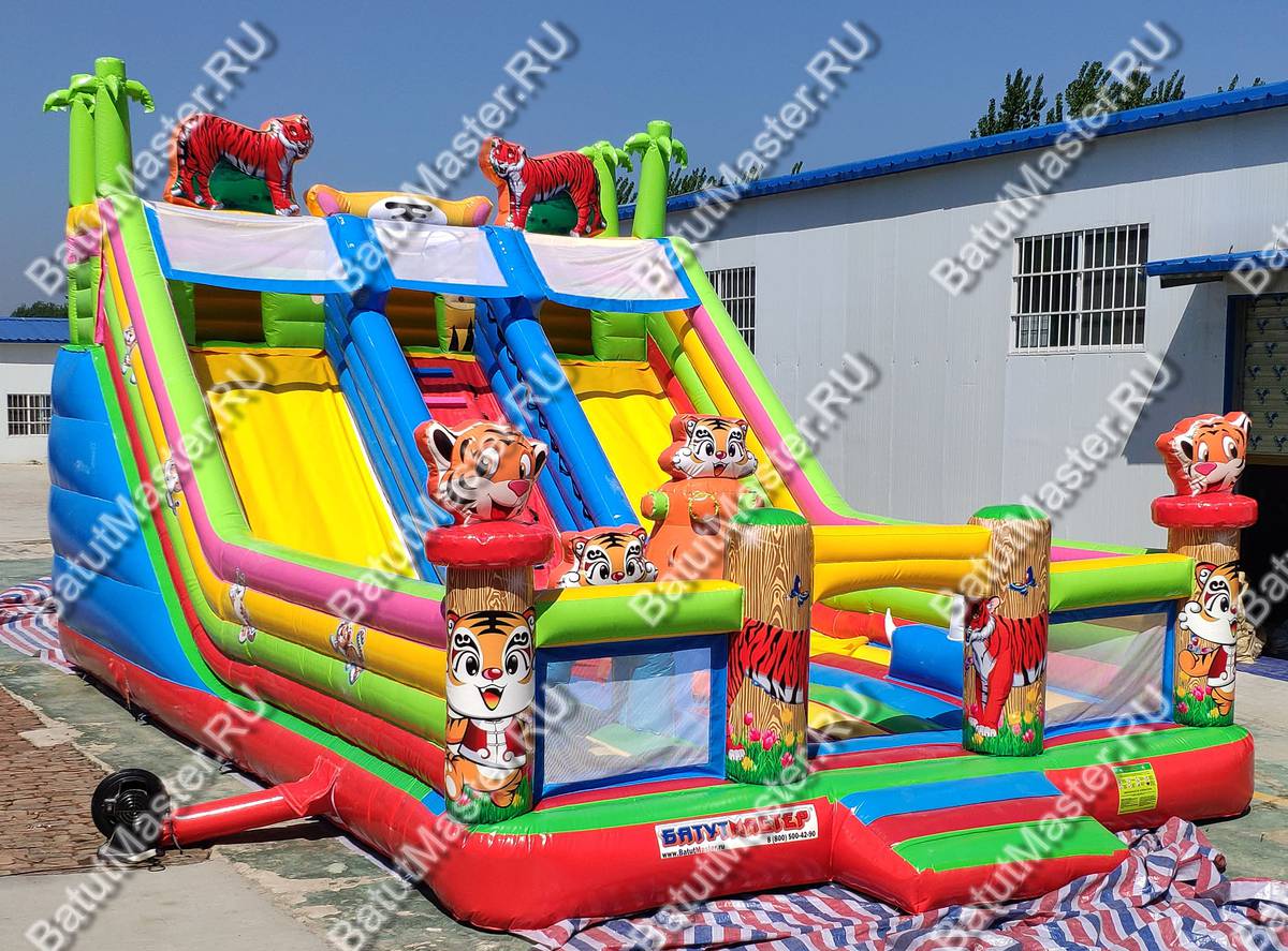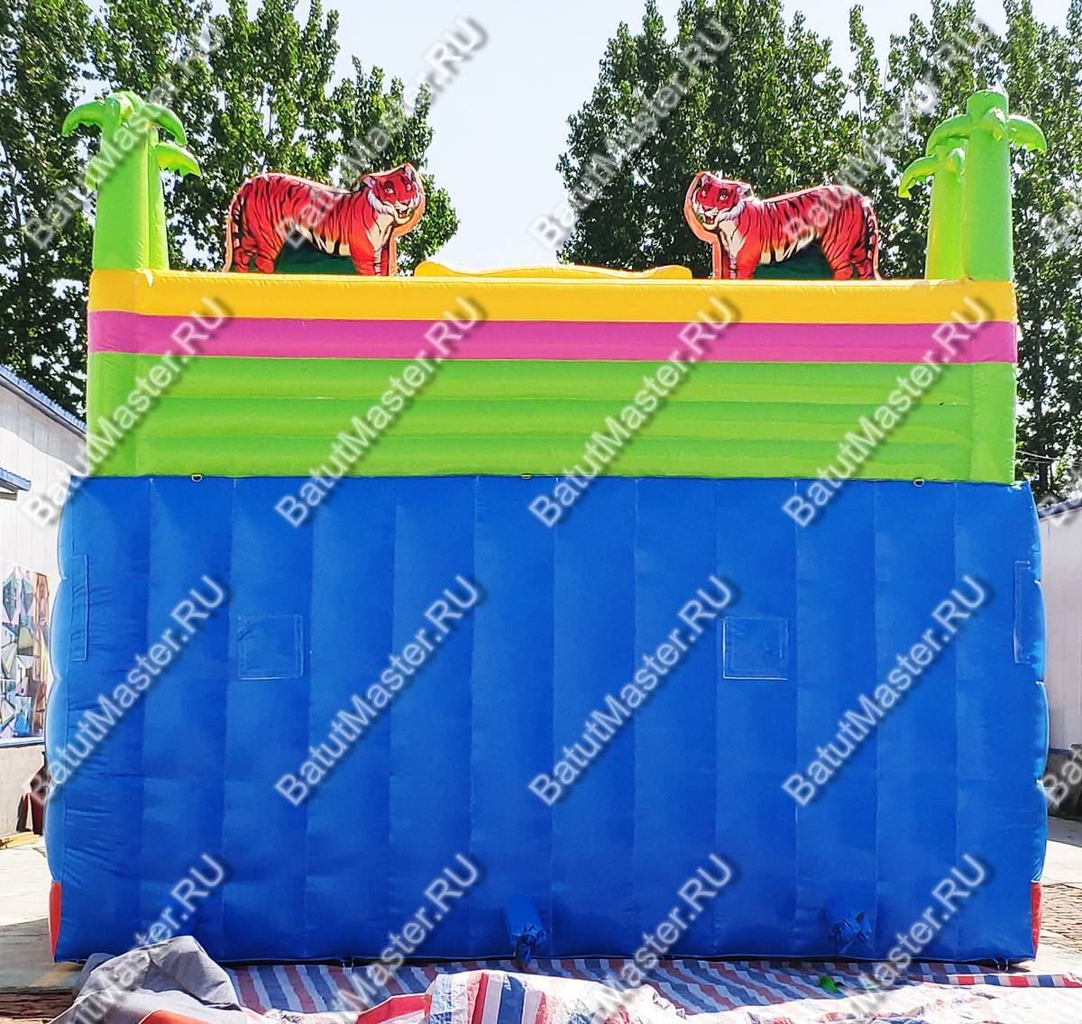 Уличный батут, переполненный самыми разными тиграми: от маленьких и добрых до больших и хищныхКоммерческий батут в виде просторной площадки еще в самом начале оформлен фигурами забавных тигрят, а на высоких горках установлены взрослые и хищные особиОпасные кошкиНи что так не веселит детей, как опасность или страх. А хищные животные, с которыми к тому же можно и попрыгать, привлекут внимание детворы особенно. Коммерческий батут уже в первые дни проката наберет ошеломляющую популярность. Фасадная сторона яркого батута оформлена фигурами веселых и добрых маленьких тигрят, настоящие хищники притаились у задней стенки и ждут посетителей, чтобы устроить им незабываемые спуски с горок.Передняя стенка состоит из арки с пальмами, а угловые пальмы изображают настоящие ели, то есть в уличном батуте переплетаются тигриные особи из разных концов мира – уссурийский из Востока России и африканский из джунглей. По настоящее удовольствие ждет детей у задней стенки, где начинается подъем на две высокие горки. Вход наверх выполнен в виде пасти тигра, с не и начинается путь по удлиненному домику с двумя выходами на правую горку и на левую. Наивысшая точка аттракциона украшена огромными фигурами двух тигров и красочными верхушками пальм.