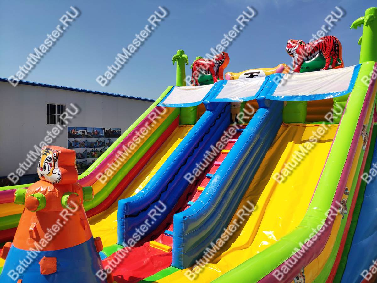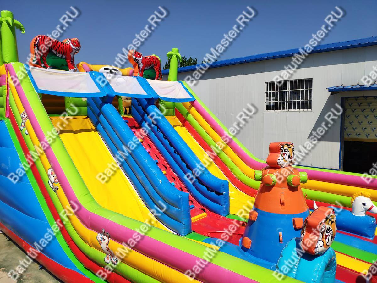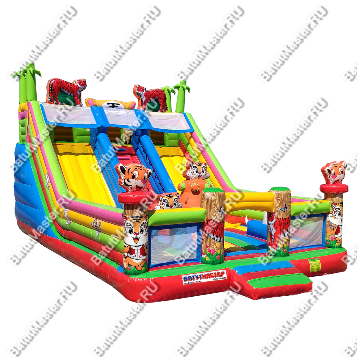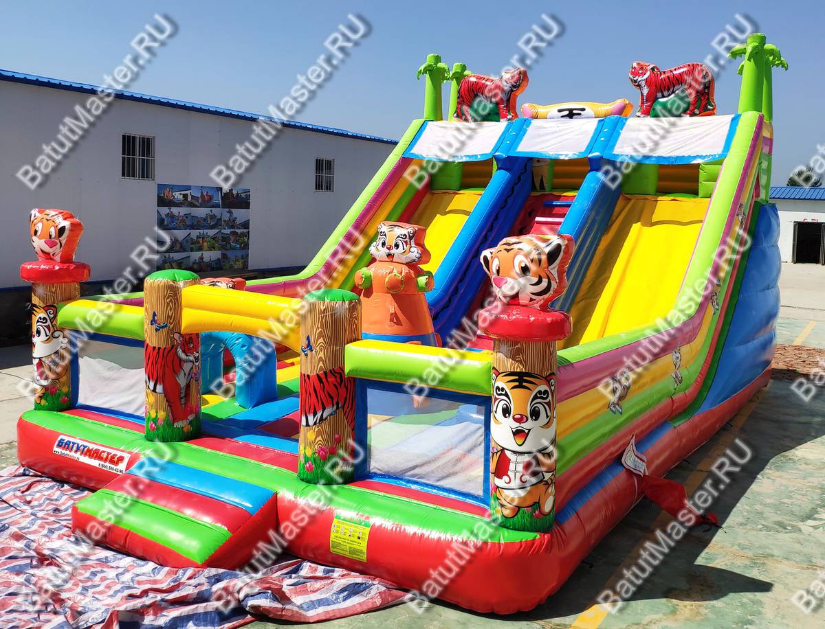 Уличный батут, переполненный самыми разными тиграми: от маленьких и добрых до больших и хищныхКоммерческий батут в виде просторной площадки еще в самом начале оформлен фигурами забавных тигрят, а на высоких горках установлены взрослые и хищные особиОпасные кошкиНи что так не веселит детей, как опасность или страх. А хищные животные, с которыми к тому же можно и попрыгать, привлекут внимание детворы особенно. Коммерческий батут уже в первые дни проката наберет ошеломляющую популярность. Фасадная сторона яркого батута оформлена фигурами веселых и добрых маленьких тигрят, настоящие хищники притаились у задней стенки и ждут посетителей, чтобы устроить им незабываемые спуски с горок.Передняя стенка состоит из арки с пальмами, а угловые пальмы изображают настоящие ели, то есть в уличном батуте переплетаются тигриные особи из разных концов мира – уссурийский из Востока России и африканский из джунглей. По настоящее удовольствие ждет детей у задней стенки, где начинается подъем на две высокие горки. Вход наверх выполнен в виде пасти тигра, с не и начинается путь по удлиненному домику с двумя выходами на правую горку и на левую. Наивысшая точка аттракциона украшена огромными фигурами двух тигров и красочными верхушками пальм.