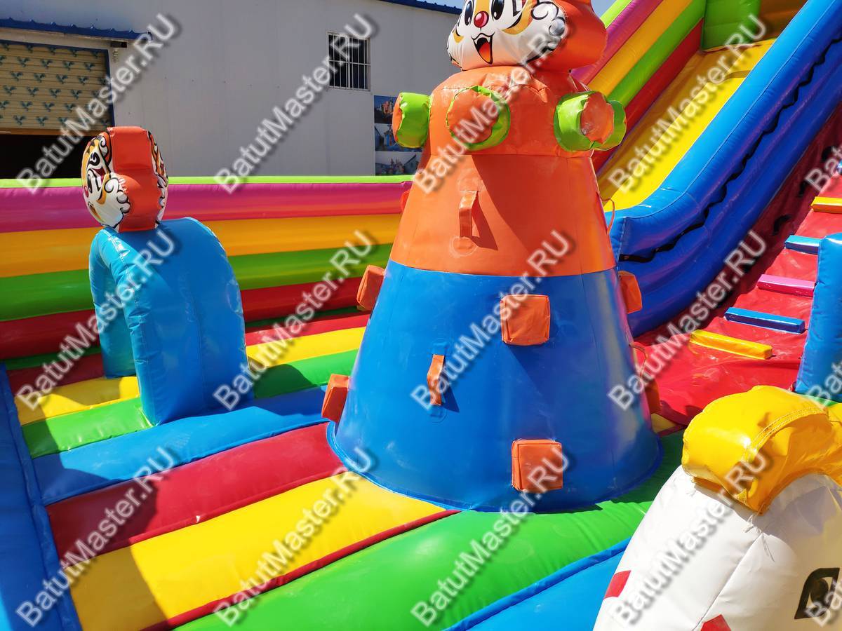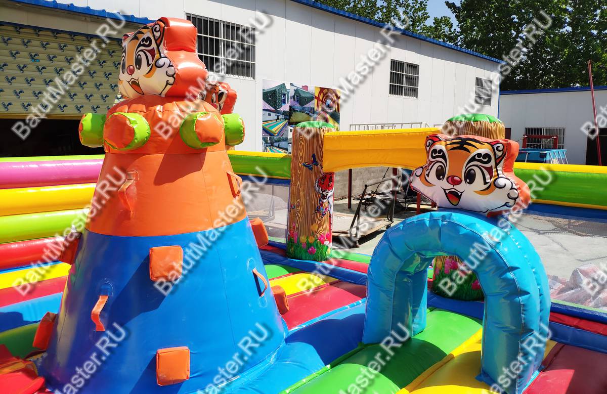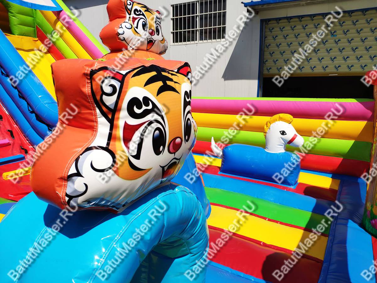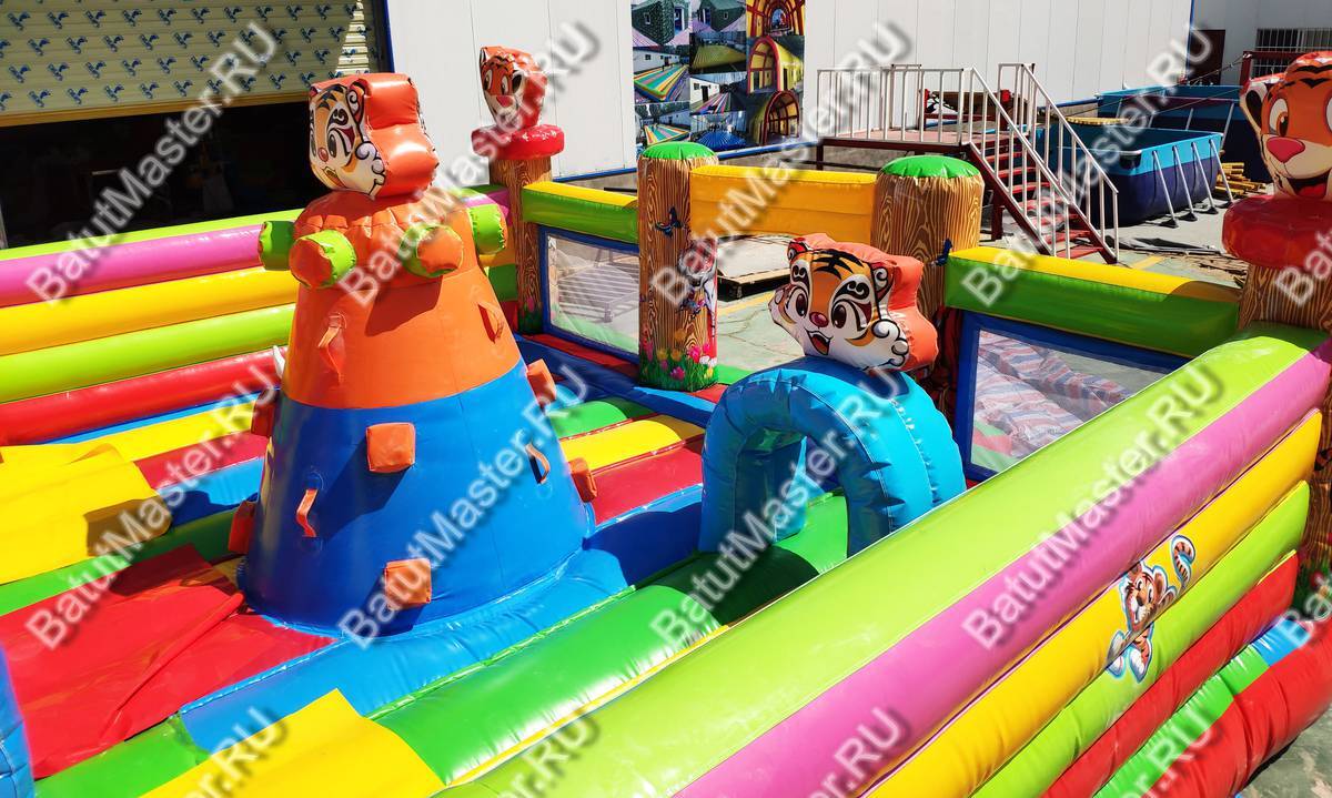 Уличный батут, переполненный самыми разными тиграми: от маленьких и добрых до больших и хищныхКоммерческий батут в виде просторной площадки еще в самом начале оформлен фигурами забавных тигрят, а на высоких горках установлены взрослые и хищные особиОпасные кошкиНи что так не веселит детей, как опасность или страх. А хищные животные, с которыми к тому же можно и попрыгать, привлекут внимание детворы особенно. Коммерческий батут уже в первые дни проката наберет ошеломляющую популярность. Фасадная сторона яркого батута оформлена фигурами веселых и добрых маленьких тигрят, настоящие хищники притаились у задней стенки и ждут посетителей, чтобы устроить им незабываемые спуски с горок.Передняя стенка состоит из арки с пальмами, а угловые пальмы изображают настоящие ели, то есть в уличном батуте переплетаются тигриные особи из разных концов мира – уссурийский из Востока России и африканский из джунглей. По настоящее удовольствие ждет детей у задней стенки, где начинается подъем на две высокие горки. Вход наверх выполнен в виде пасти тигра, с не и начинается путь по удлиненному домику с двумя выходами на правую горку и на левую. Наивысшая точка аттракциона украшена огромными фигурами двух тигров и красочными верхушками пальм.