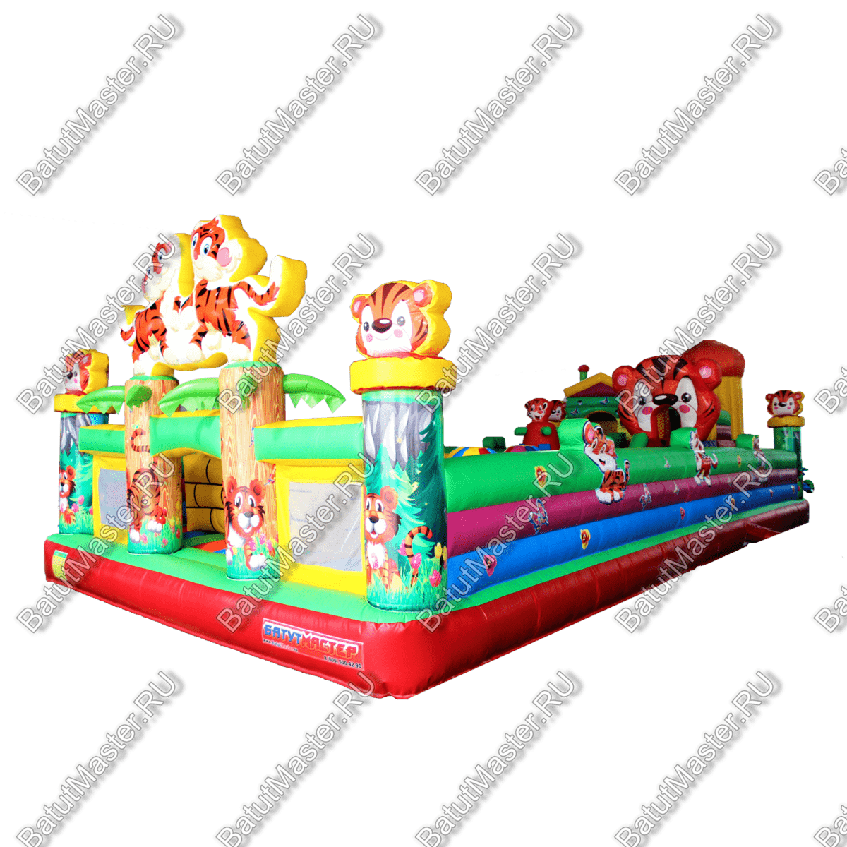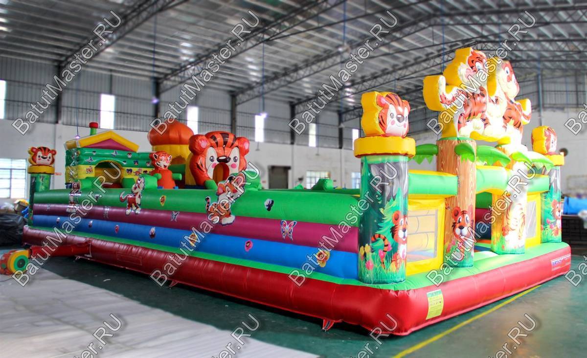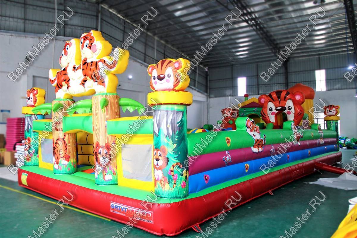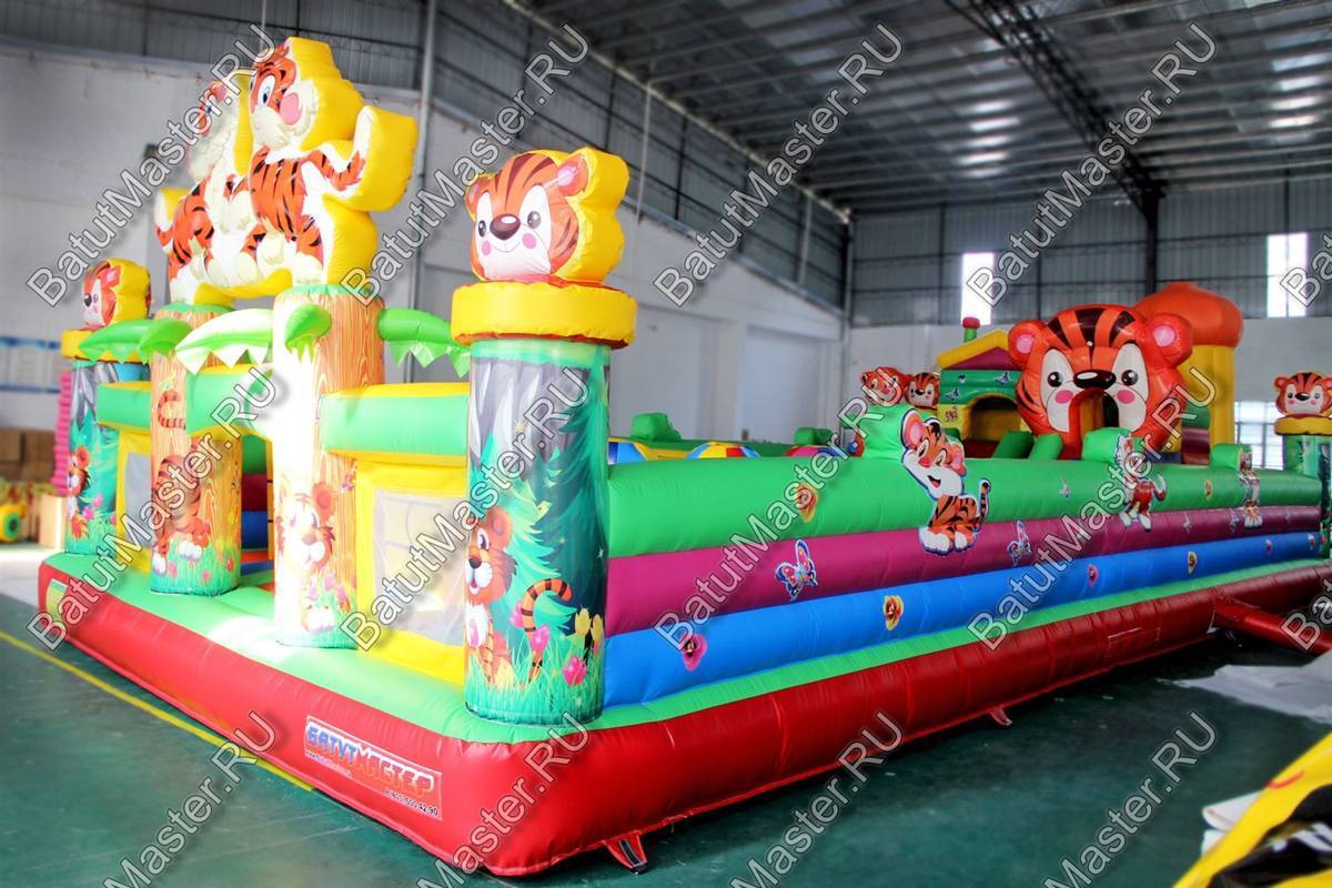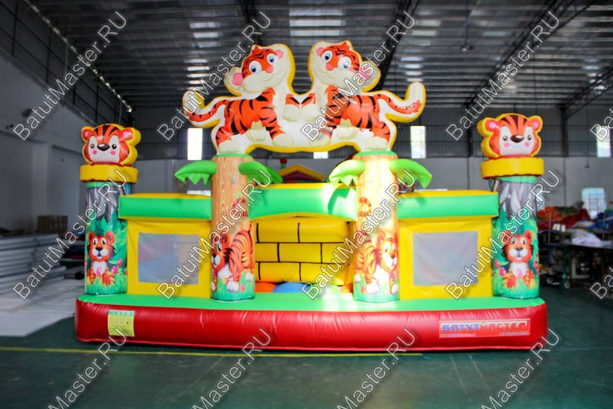Коммерческий батут с достаточно вместительными размерами 12 на 6 м станет идеальной платформой для бизнеса и сможет приносить достойную прибыль, даже существуя самостоятельно. Главным персонажем надувного батута является тигр, а точнее, тигрята, мягкие формы этих животных здесь можно увидеть почти везде, начиная с фасада.