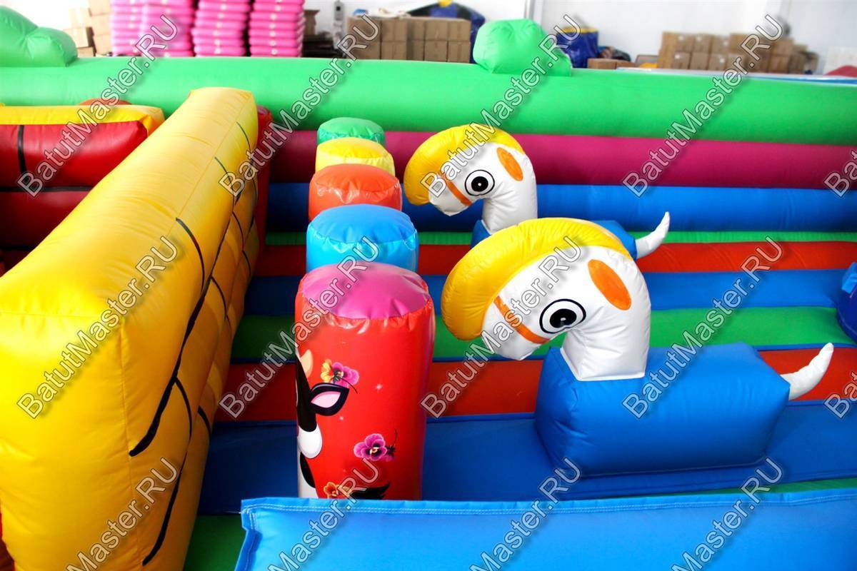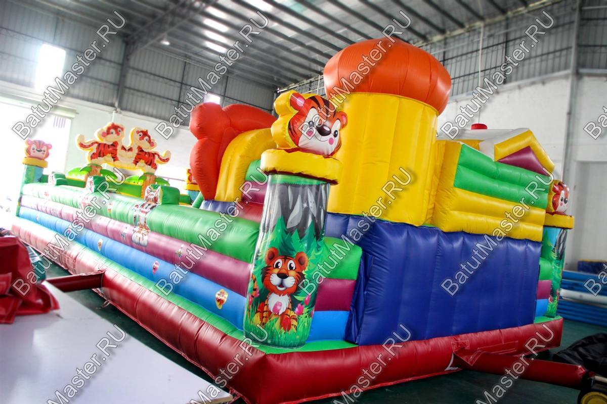 Как только увлекательный лабиринт будет пройден, дети с удовольствием отправятся исследовать остальные игровые фигуры: фламинго и скалодром. Но самое интересное непосед ожидает еще дальше – это г-образный тоннель, начинающийся лестницей в виде домика-тигренка. Пройдя дальше, дети преодолеют невысокий мостик и попадут на стартовую площадку горки. Спуск этой горки выходит из закрытого надувного домика, состоящего из разноцветных сегментов. Помимо этих основных фигур внутри батута есть и более мелкие, например, разноцветные надувные столбики и т. д. С внешних сторон батут украшен изображениями тигрят.