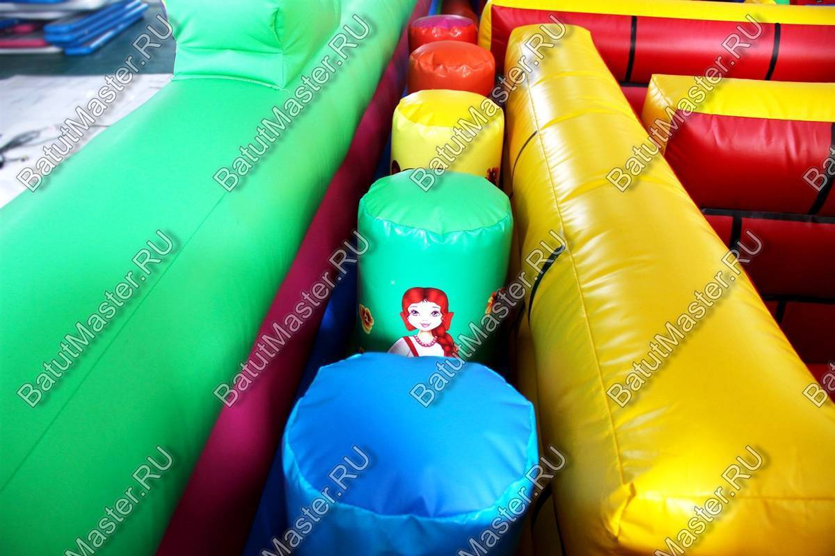 Основная платформа батута – прямоугольник, по периметру которого оборудованы высокие стены из разноцветных ярусов. Фасада из 4 колонн и нескольких фигур тигрят в своем центре имеет вход в виде арки, а за ним – настоящий надувной лабиринт с простейшим маршрутом.