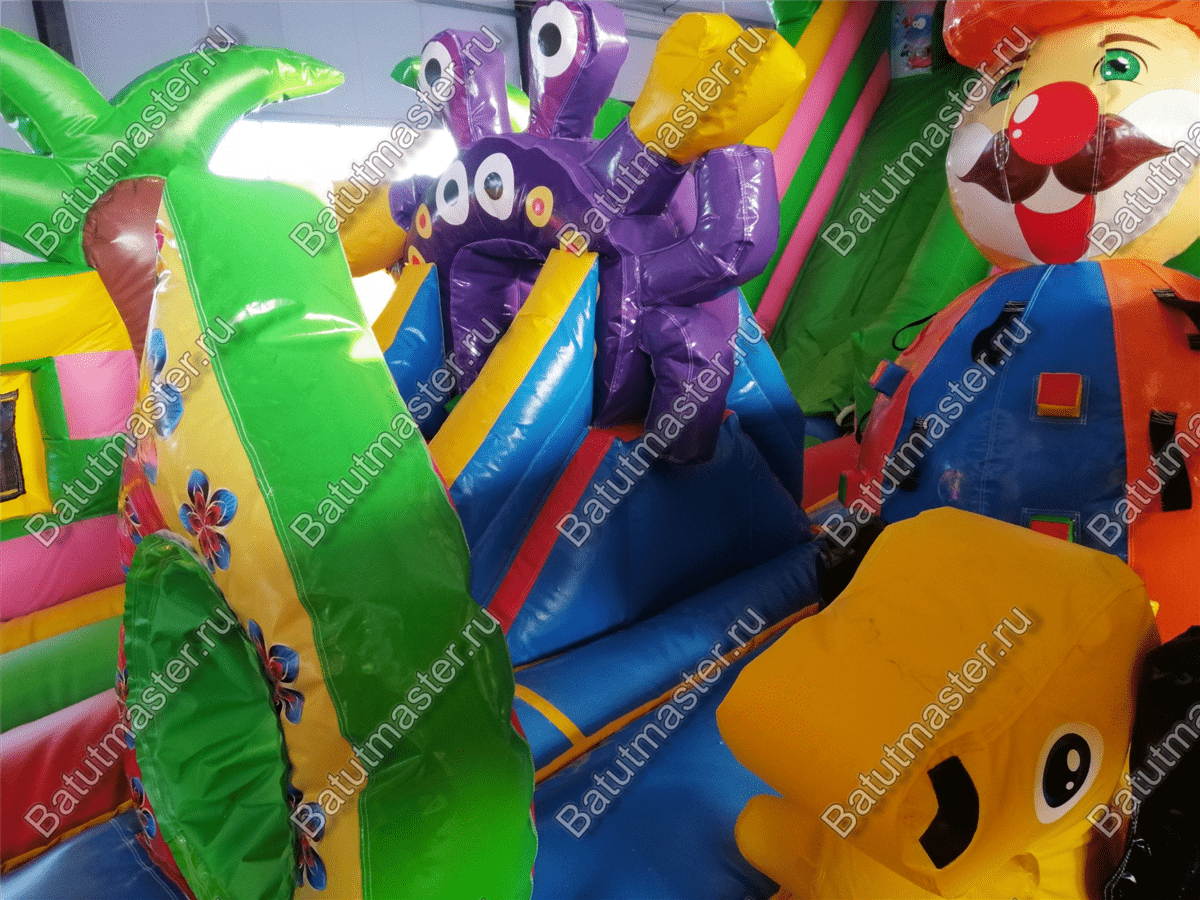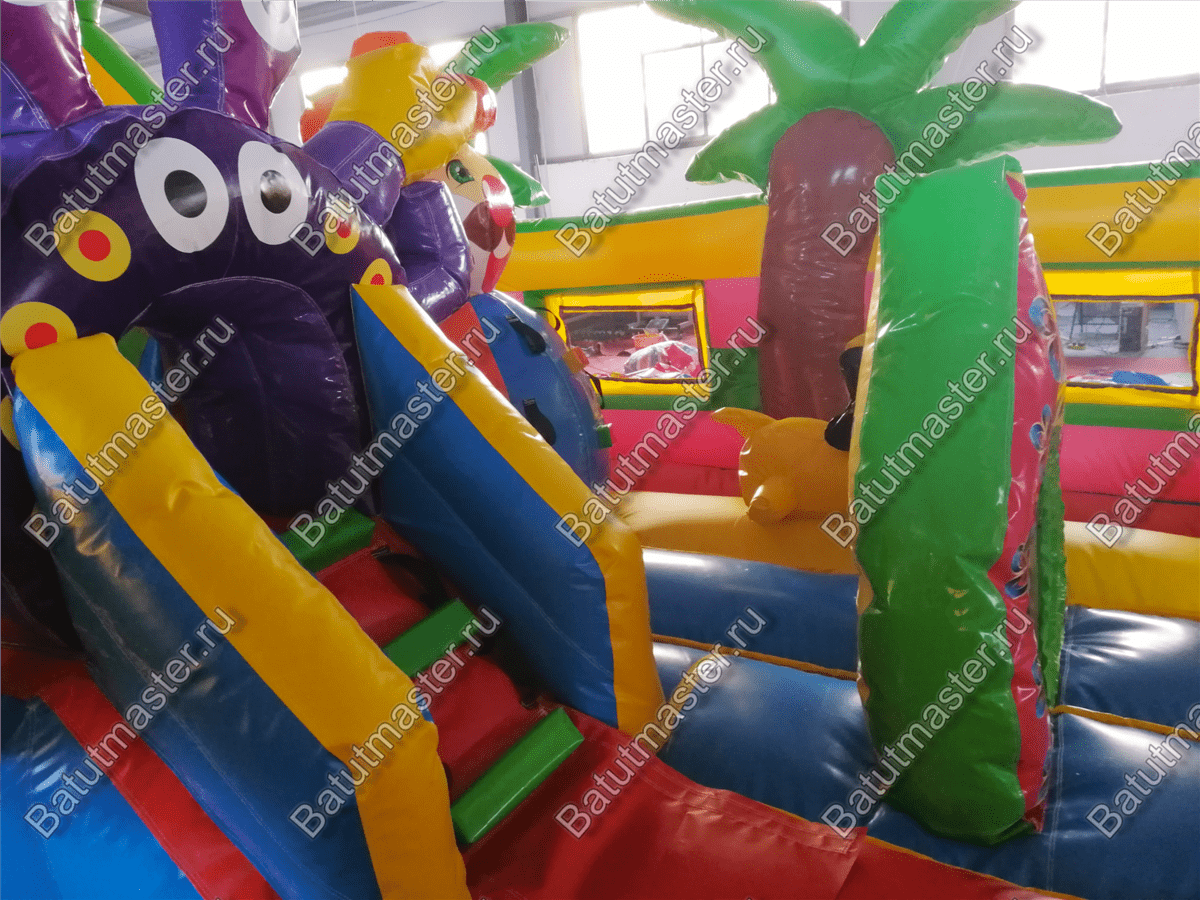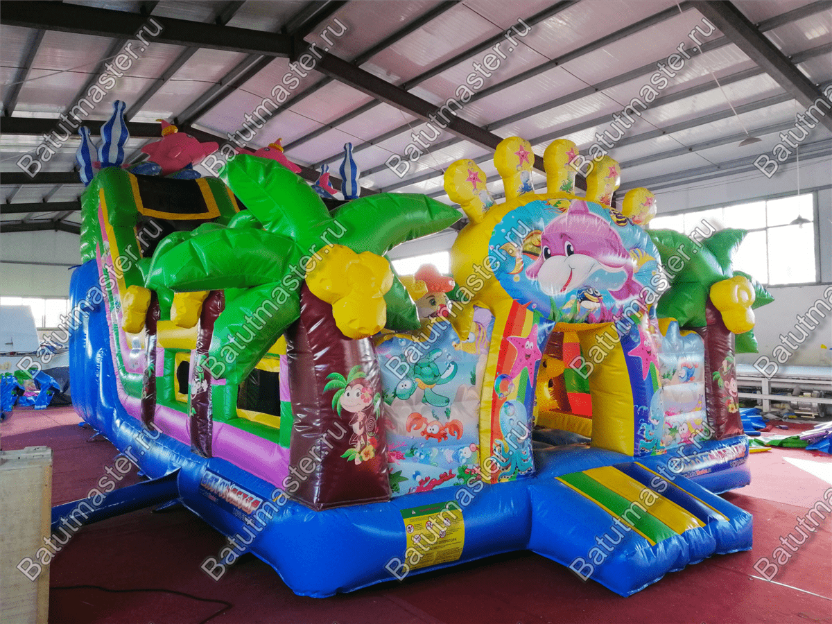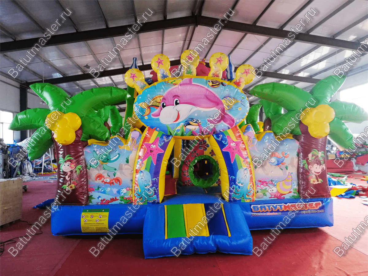Надувной батут «В гостях у дельфинов» - это современный и функциональный игровой комплекс. В нем собраны самые интересные модули и зоны для игр. Здесь есть большие горки, с которых дети могут прокатиться с ветерком, скалодром в виде осьминога, тоннель, надувной краб и многое другое. На такой арене не получится заскучать никому. Все вокруг яркое и притягивает взгляд. В окружении такого пространства дети смогут перенестись в настоящий подводный мир тропиков.