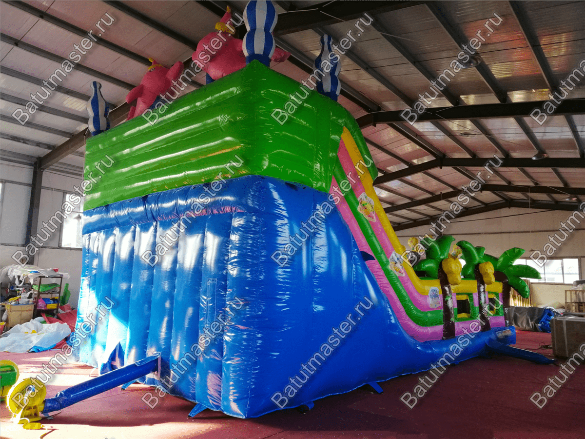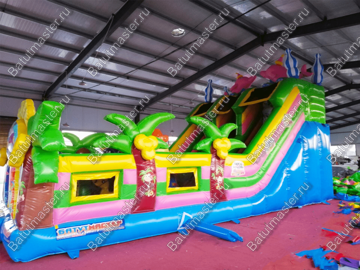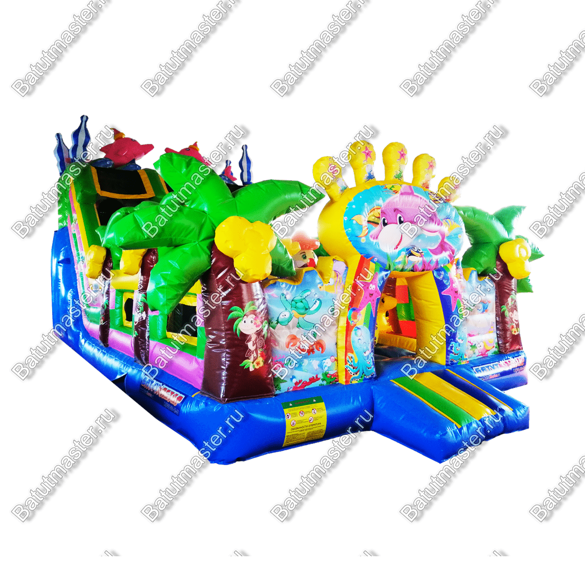 Надувной батут «В гостях у дельфинов» - это современный и функциональный игровой комплекс. В нем собраны самые интересные модули и зоны для игр. Здесь есть большие горки, с которых дети могут прокатиться с ветерком, скалодром в виде осьминога, тоннель, надувной краб и многое другое. На такой арене не получится заскучать никому. Все вокруг яркое и притягивает взгляд. В окружении такого пространства дети смогут перенестись в настоящий подводный мир тропиков.
