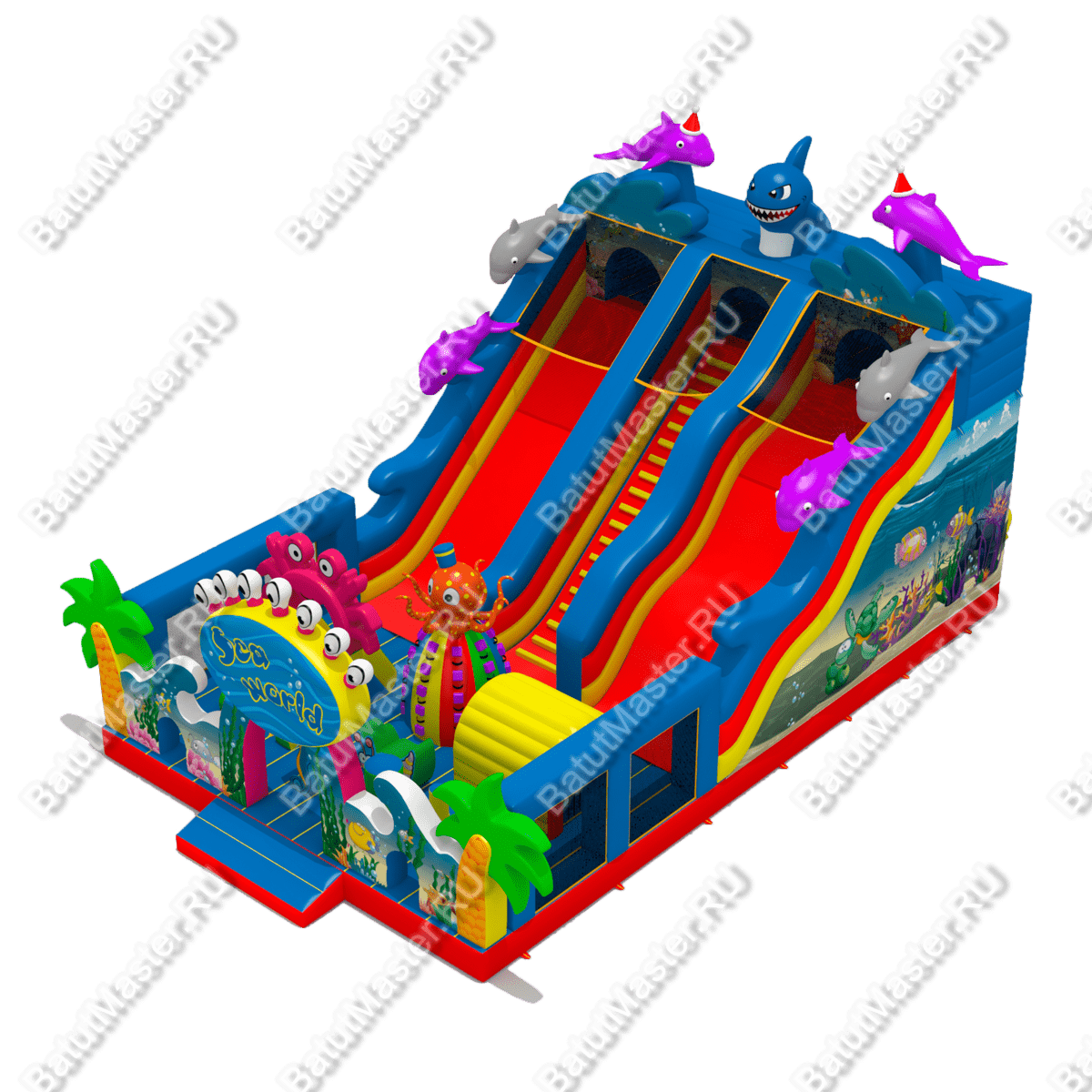 Надувной батут «В гостях у дельфинов 2» - это современный и функциональный игровой комплекс. В нем нет ничего лишнего, только самые интересные модули и зоны для игр. Здесь есть большие горки, с которых дети могут прокатиться с ветерком, скалодром в виде осьминога, тоннель, надувной краб и многое другое. На такой арене не получится заскучать никому. Все вокруг яркое и притягивает взгляд. В окружении такого пространства дети смогут перенестись в настоящий подводный мир.