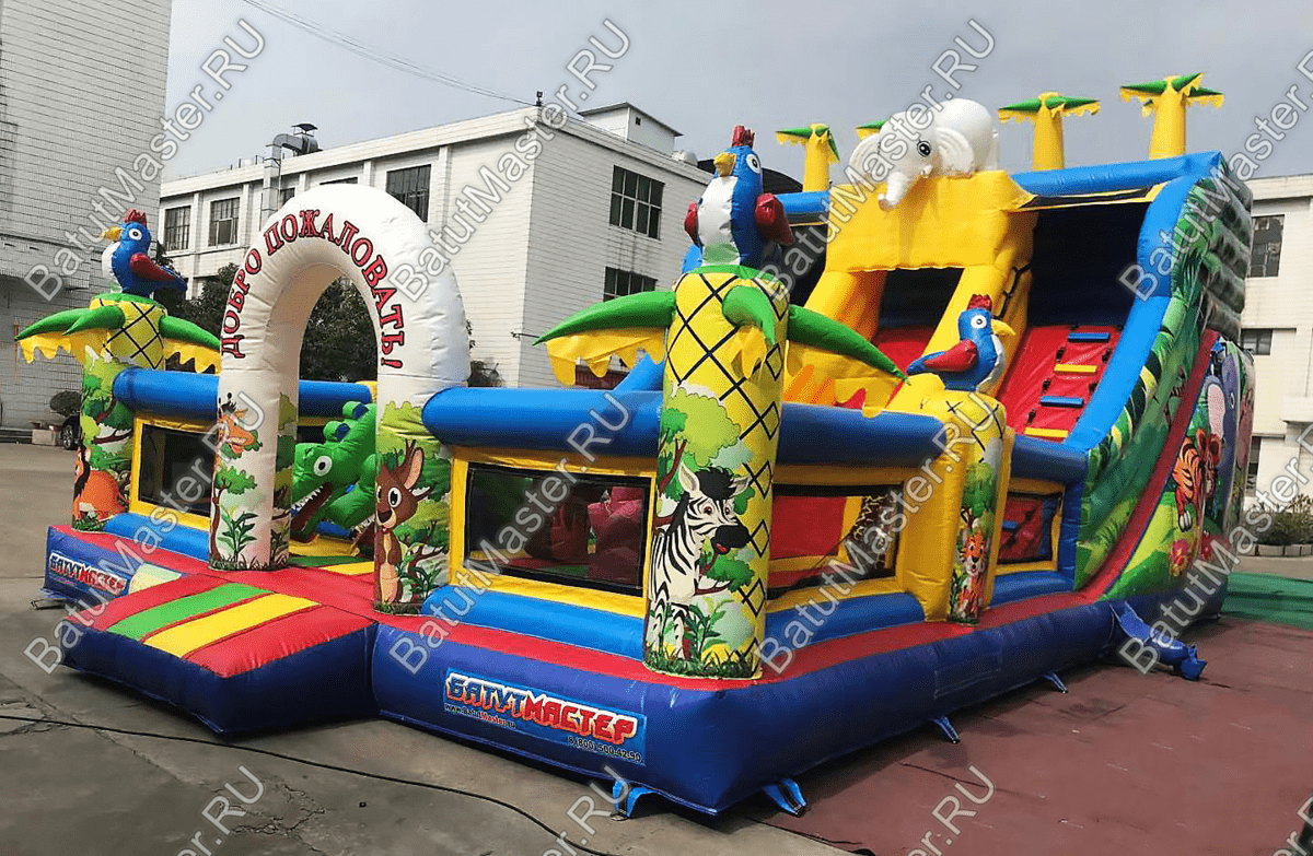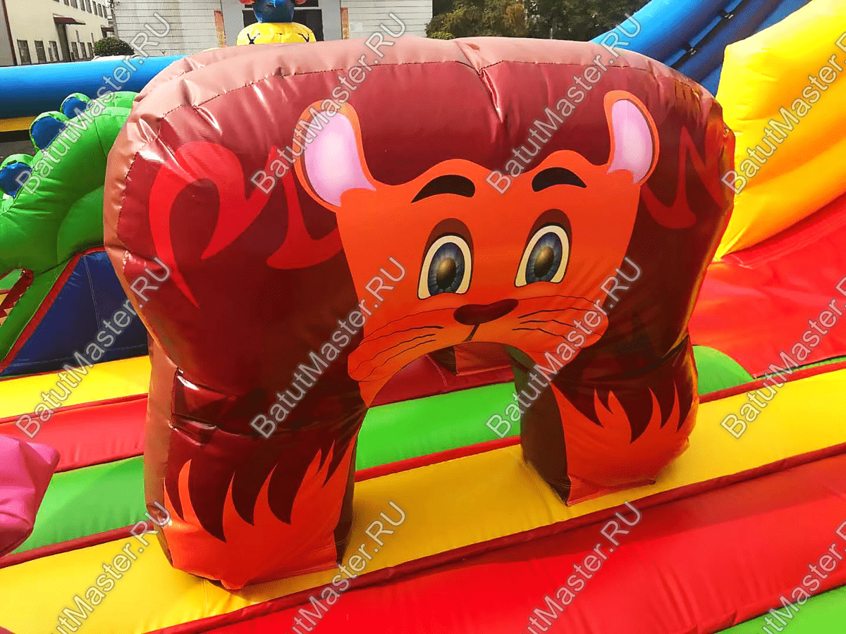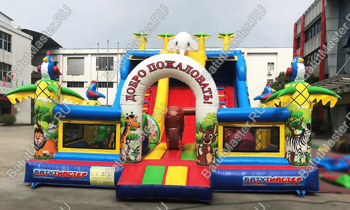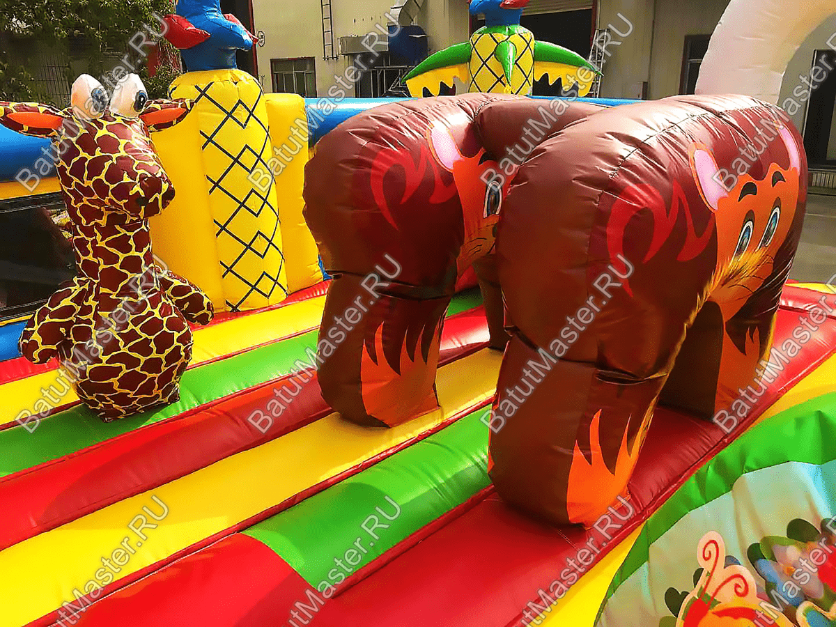 Передняя часть батута для бизнеса – полностью просматриваемая. Фасад встретит ваших клиентов добродушной аркой и яркой разноцветной подушкой безопасности у самого входа в конструкцию. Как только вы войдете внутрь, то окажетесь посреди просторной площадки с надувным слоном, трехглавым змеем и львом. Фасадные колонны по углам представлены не только пальмами, но и изображениями львов, жирафов, зебр и т. д. А на самой верхушке каждой колонны разместились яркие фигуры надувных попугаев.