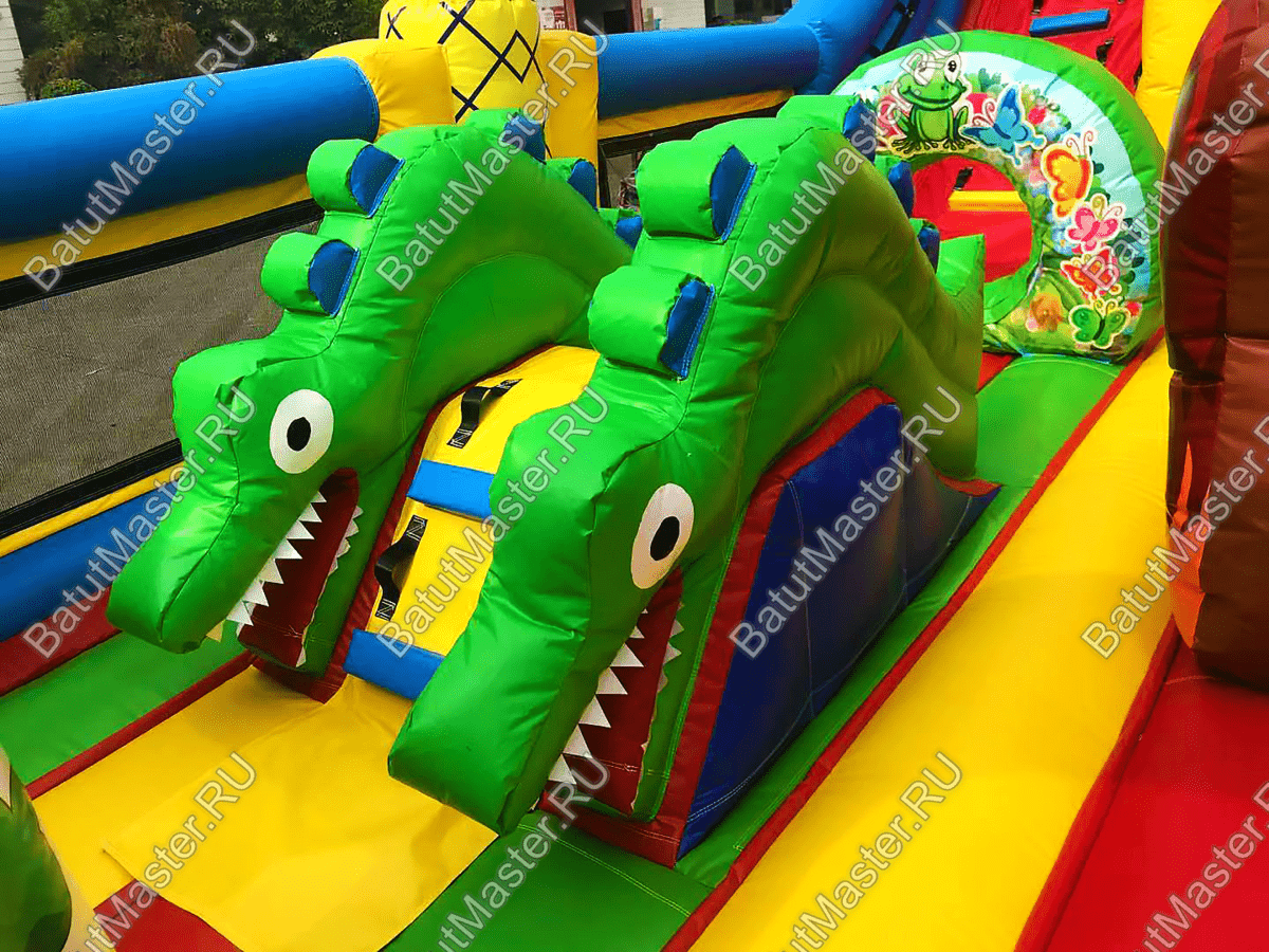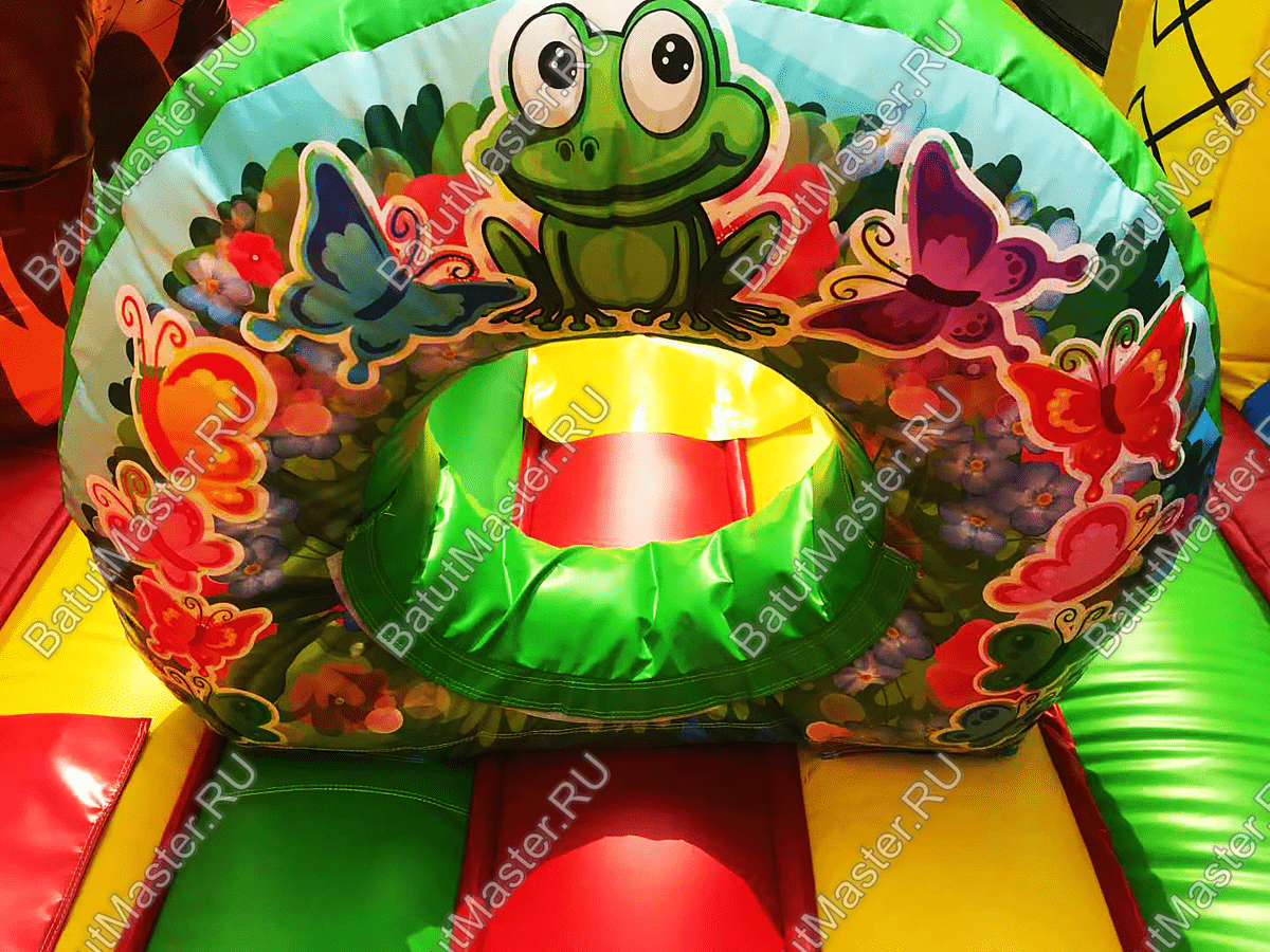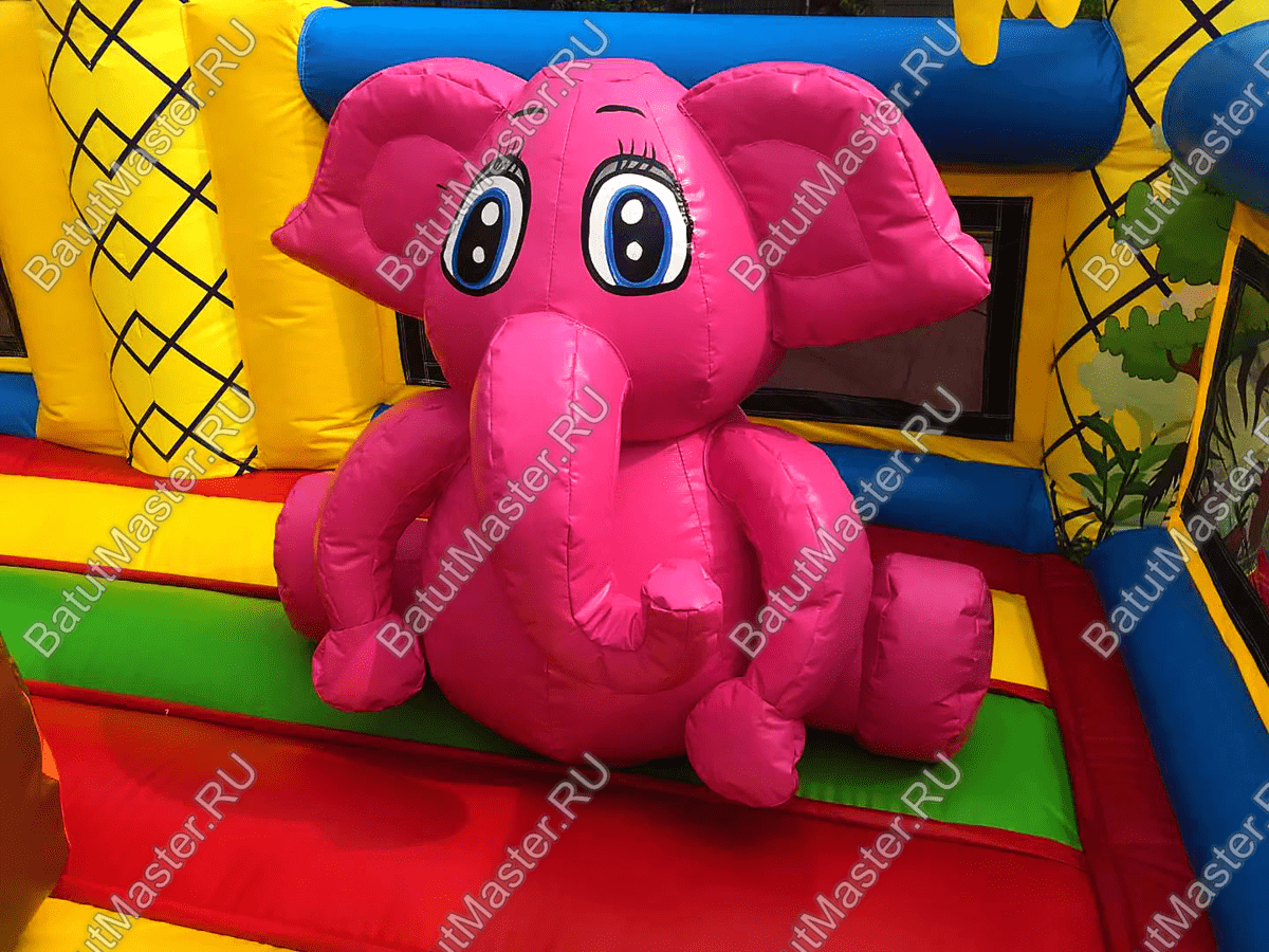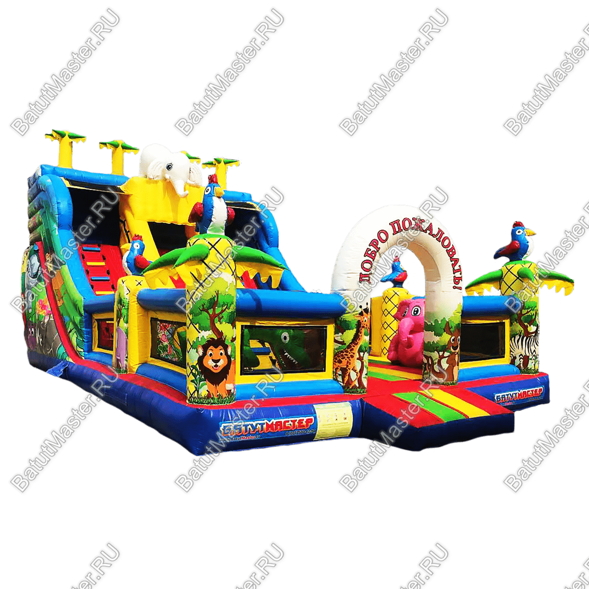 Передняя часть батута для бизнеса – полностью просматриваемая. Фасад встретит ваших клиентов добродушной аркой и яркой разноцветной подушкой безопасности у самого входа в конструкцию. Как только вы войдете внутрь, то окажетесь посреди просторной площадки с надувным слоном, трехглавым змеем и львом. Фасадные колонны по углам представлены не только пальмами, но и изображениями львов, жирафов, зебр и т. д. А на самой верхушке каждой колонны разместились яркие фигуры надувных попугаев.