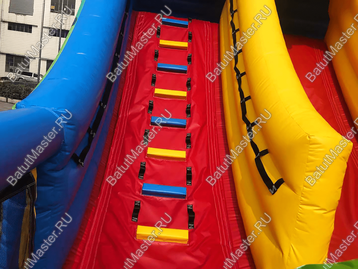 Задняя стенка надувного батута – высокая горка на всю ширину батута с крытой стартовой площадкой. В этой зоне разместились 2 лестницы, а в центре – большой широкий спуск. Склизы всех трех частей выполнены из красного ПВХ, но при необходимости их очень легко заменить на любой другой цвет (они съемные).