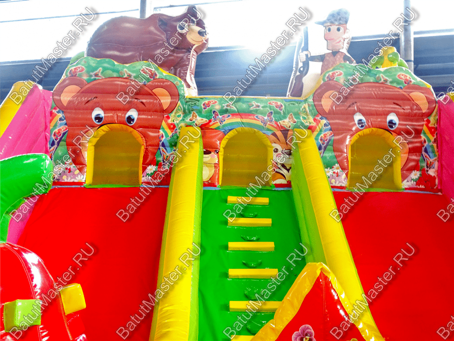 Яркие цвета манят детей ещё на подходе к аттракциону. На входе красуется надпись «Добро пожаловать», и, как только ребёнок оказывается внутри, его ждёт масса развлечений. Объектов в этом коммерческом батуте достаточно много, а это значит, что можно играть в пятнашки или прятки. Есть тут и весьма просторный скалодром. Мягкое основание предотвратит травмы, а выступы и петли помогут забраться наверх, тренируя силу рук и цепкость пальцев. По мягким фигурам можно активно ползать и даже сидеть верхом и прыгать. В надувном домике могут расположиться сразу несколько детей, и там они могут отдохнуть от активных игр. В коммерческом батуте «Погоня за медведем 2» есть целых две горки с лестницей посередине. Это очень удобно, ведь скатившиеся дети не будут мешать остальным.