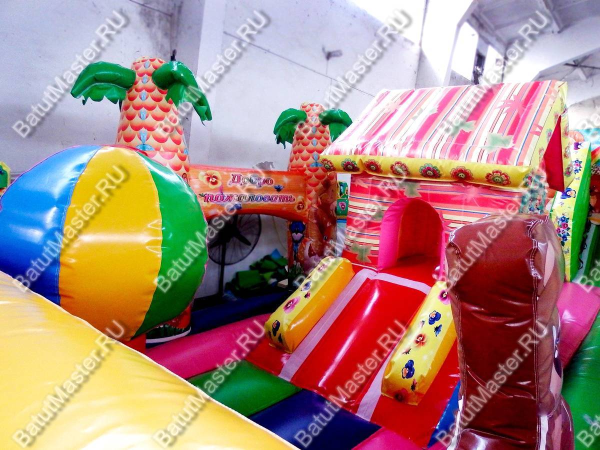 Попав внутрь, ребёнок будет приятно удивлён разнообразием развлечений. Батут предоставляет детям игровые фигуры, груши, вокруг которых можно бегать, арки и даже надувной домик, где можно отдохнуть. Также тут есть небольшая, но интересная горка, разделенная удобной лестницей.