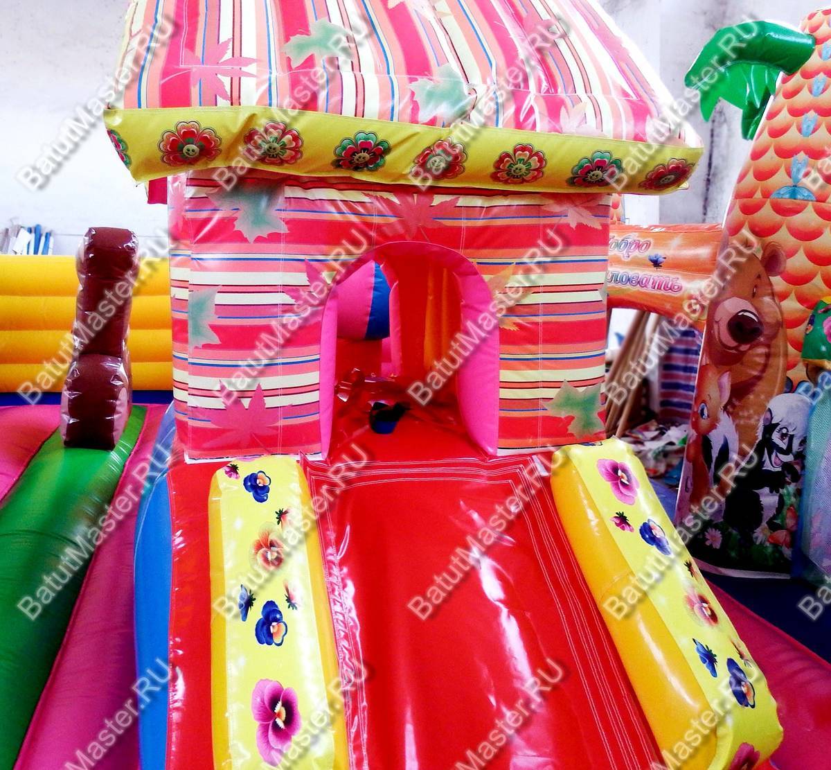 Батут сразу привлечёт внимание ярким внешним видом. Грамотное сочетание броских цветов и картинок делают своё дело: дети не смогут пройти мимо такого красивого батута. Помимо этого, батут украшен и надувными декоративными фигурами, что добавляет веселья в игру.