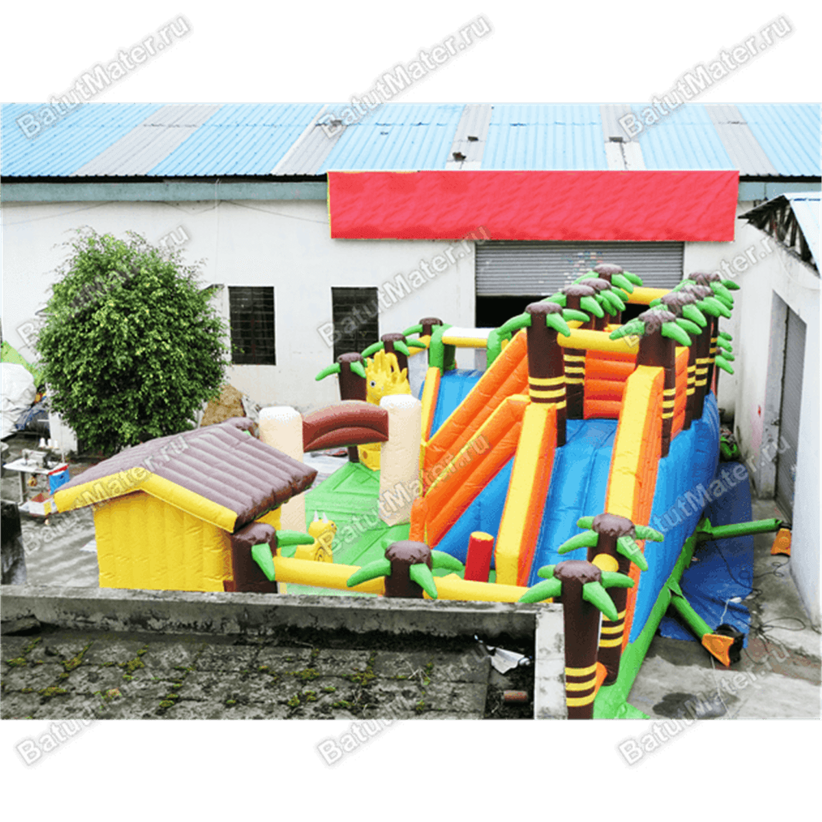 Площадка для развлечений внушительных размеров или многофункциональный батут в самой яркой цветовой палитре. Состоит из нескольких зон среди которых: высокая горка синим цветом с подъемом в виде скалодрома и место для прыжков и для бега. Все животные и пальмы свидетельствуют о том, что это настоящая Африка, хоть и надувная. Внутри территории есть и другие интересные препятствия, окрашенные в самые разные цвета.
