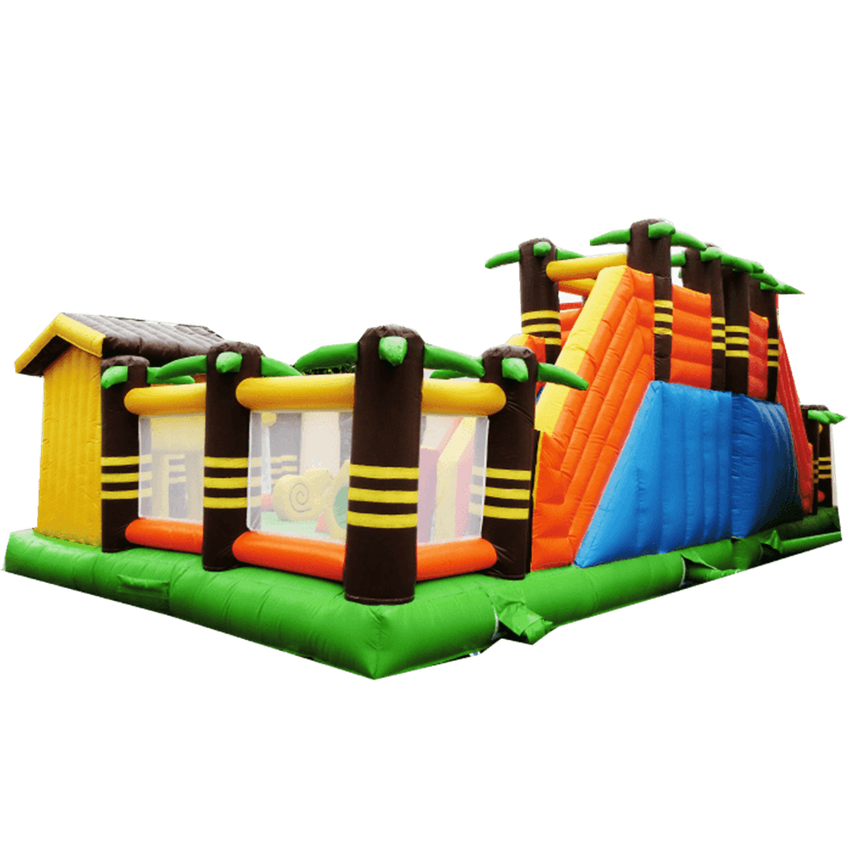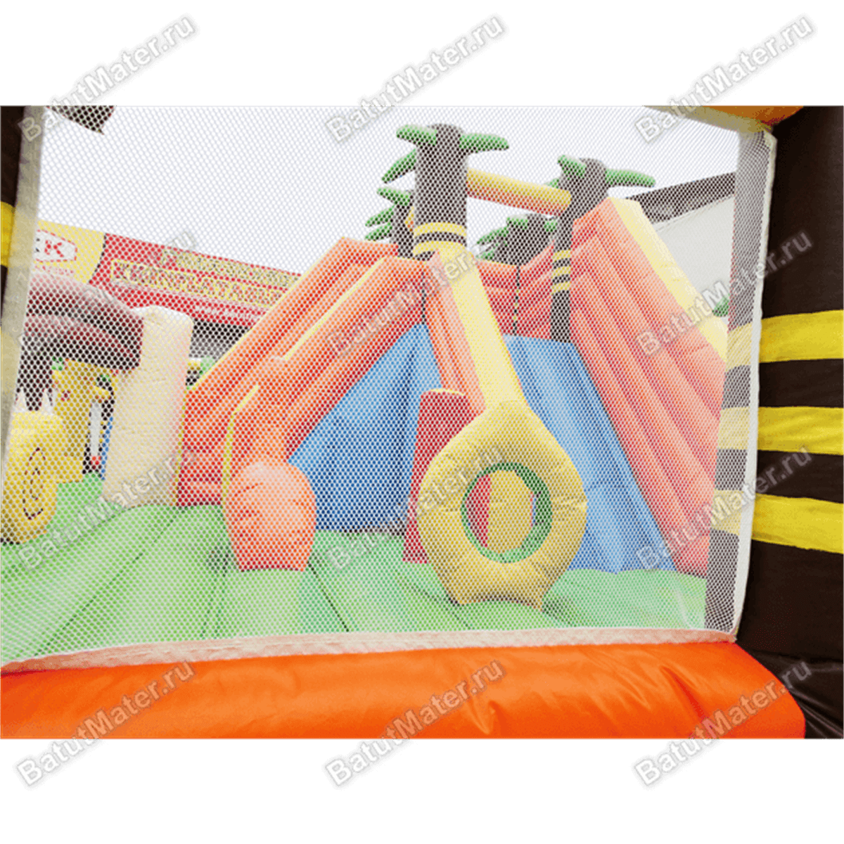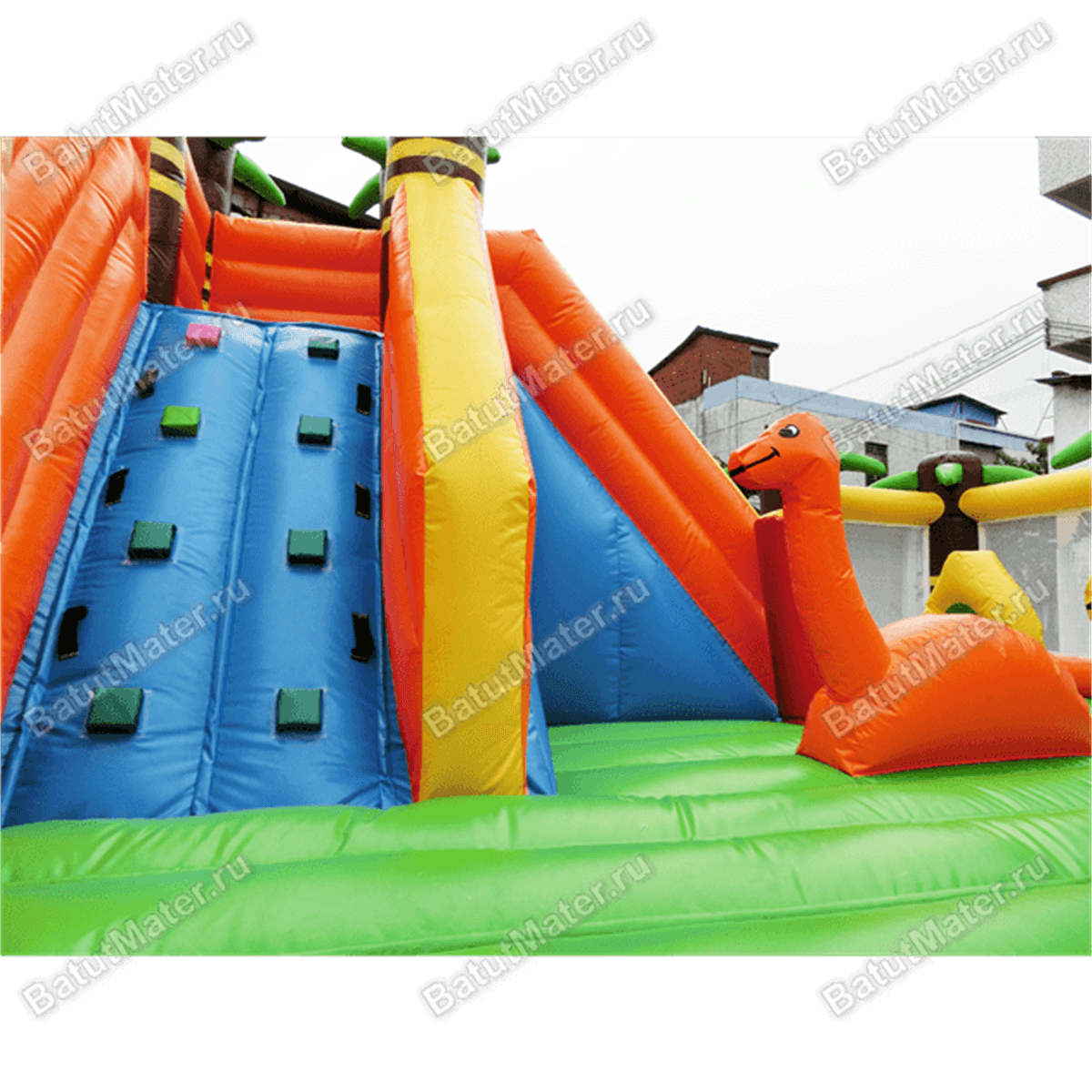 Нижняя основная платформа – зеленая, выше создана имитация ограждения из коричневых пальм с желтыми полосами и сочными надувными листьями. Между собой они пальмы соединяются сеткой безопасности: сквозь нее видно, чем занимается малыш и он гарантировано не выпадет с площадки. Причудливый оранжевый динозавр, желтый круг с отверстием внутри и множество арок дают малышу возможность фантазировать и играть от души. В одном углу создан небольшой надувной домик, благодаря нему весь аттракцион кажется целым африканским поместьем.