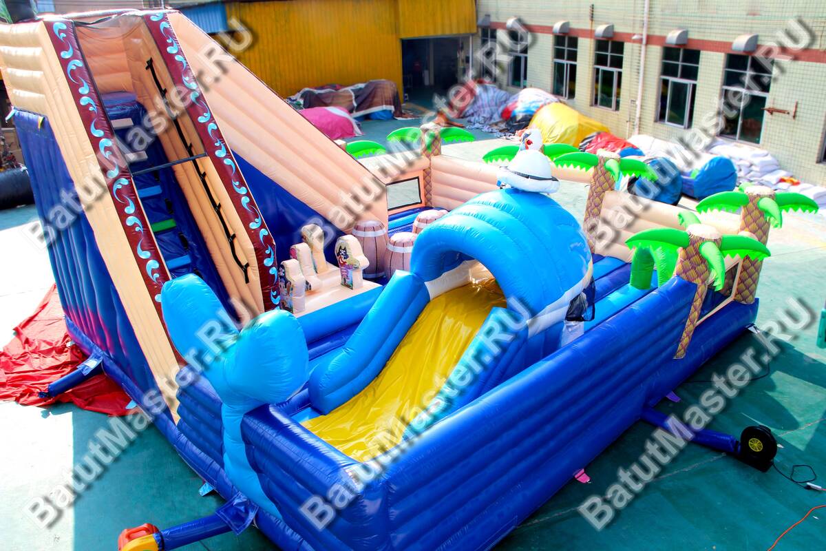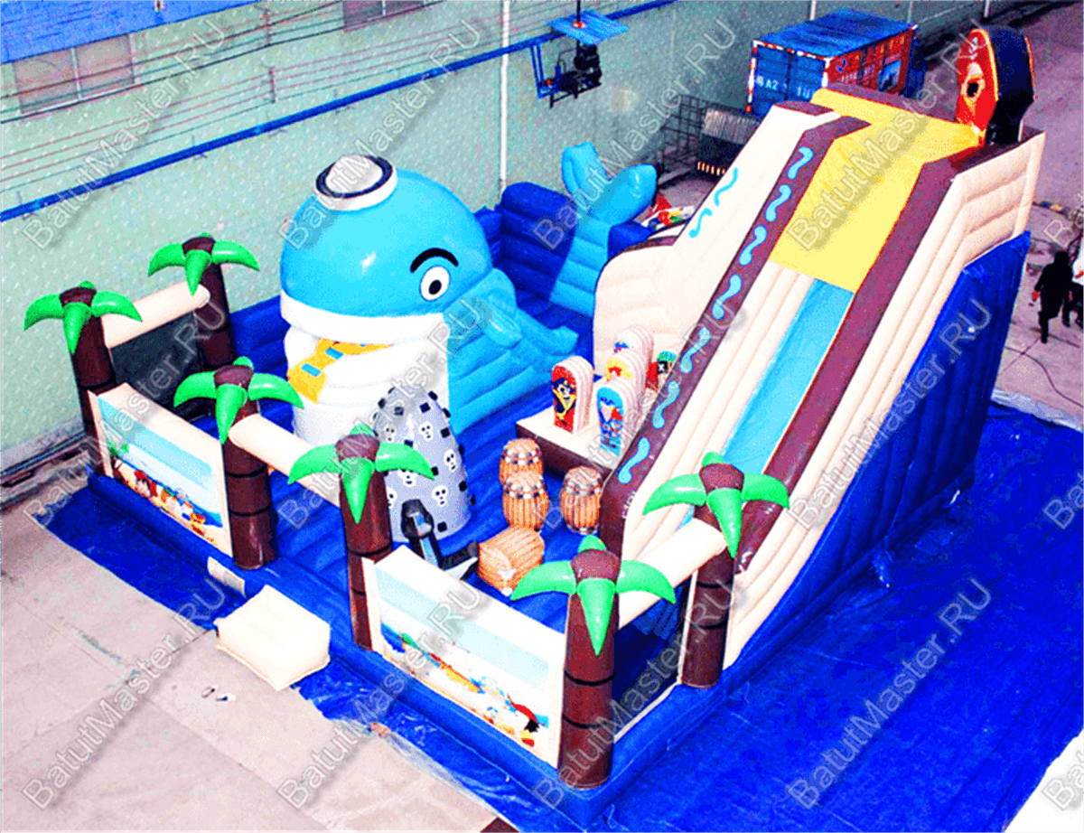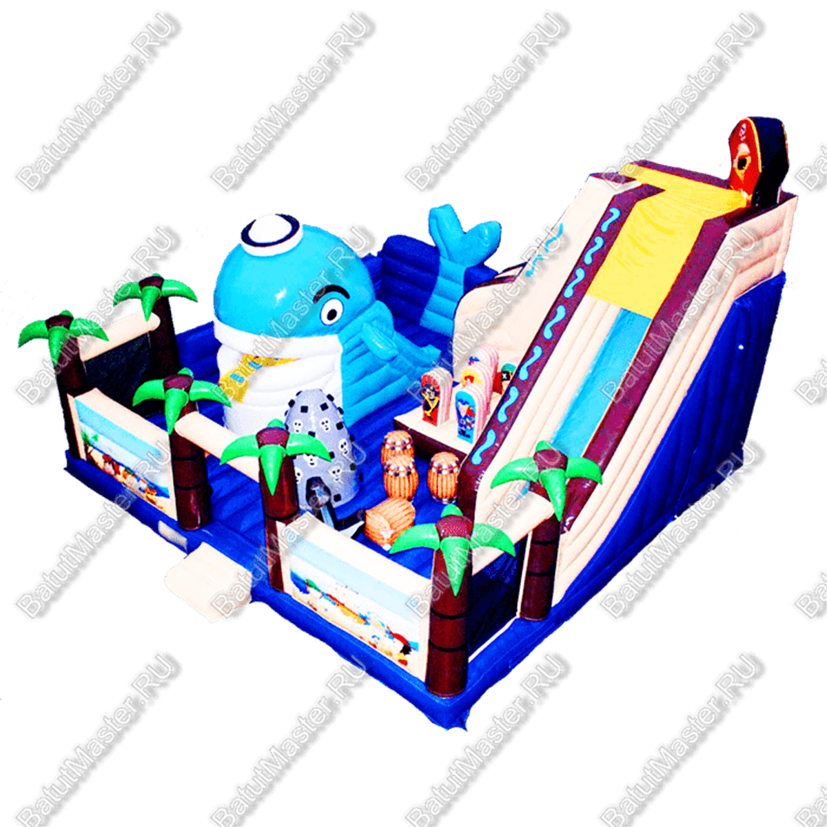 Веселье и радость подарит детям данная модель батута. При небольшом размере он вмещает в себе самые интересные модули и зоны для подвижных игр. Здесь есть скалодром, мягкие ступеньки, высокая горка, зона для прыжков, а самое интересное – это огромный надувной кит. Дети должны будут забраться к нему в рот и скатится. Повсюду надувные элементы в виде бочек, сказочных персонажей, пальм. Каждая деталь здесь яркая и притягивает внимание. Надувной батут с такими элементами развивает выносливость, силу, координацию, что важно для детей. Он рассчитан для бизнеса. Состоит из качественных материалов прошедших ламинирование. Благодаря этому, он устойчив к солнечным лучам и к низкой температуре. Стоит отметить безопасность комплекса: он имеет высокие борта и даже, находясь на самой высокой горке, дети не смогут выпасть наружу. С двух сторон он имеет вставку из прочной сетки, таким образом, родители смогут видеть своих детей.