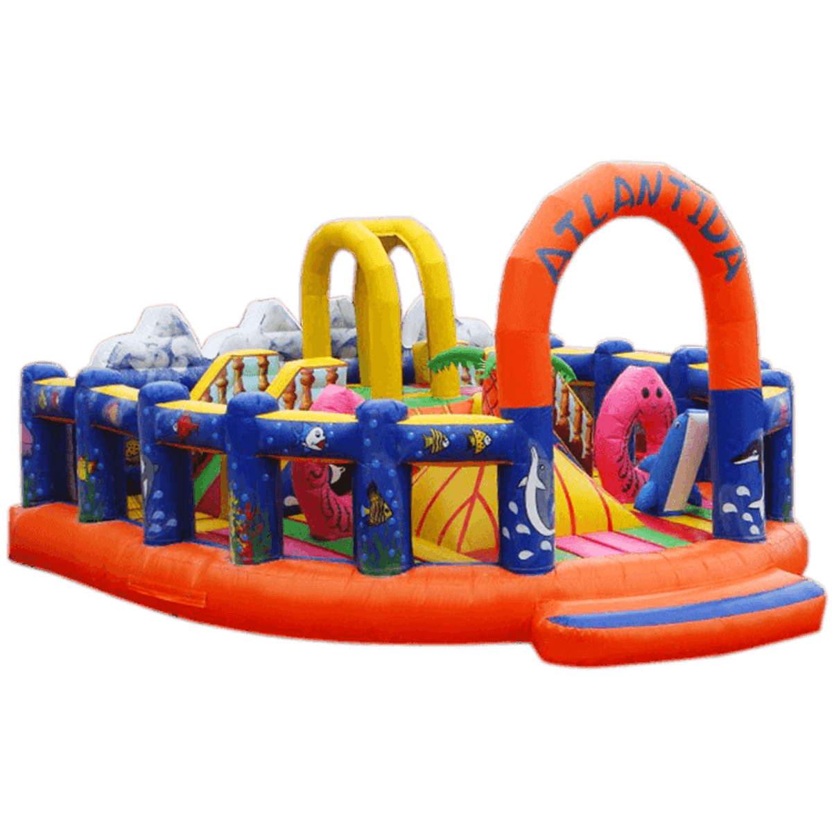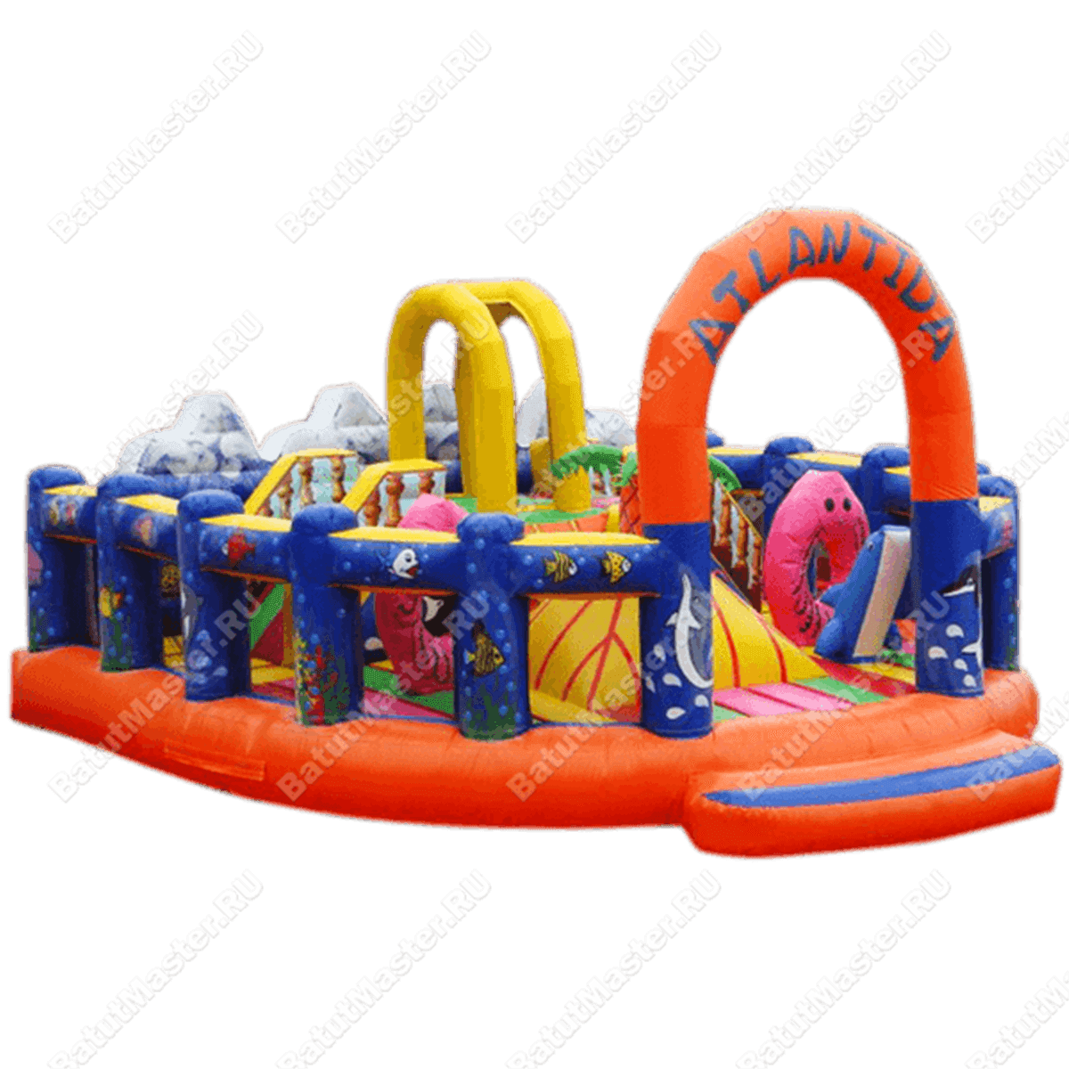 Коммерческий надувной аттракцион «Атлантида» - яркое дополнение к любой игровой площадке. Вход в продолговатый овальный комплекс ограничивает высокая арка с названием батута. Впереди установлен защитный порожек безопасности в виде красно-синей ступени меньшей высоты. Боковые борта красивого батута обтянуты прочной сеткой между надувных столбов с перегородками. Задняя стена изготовлена из прочного непрозрачного материала, что обеспечивает безопасность малышей.