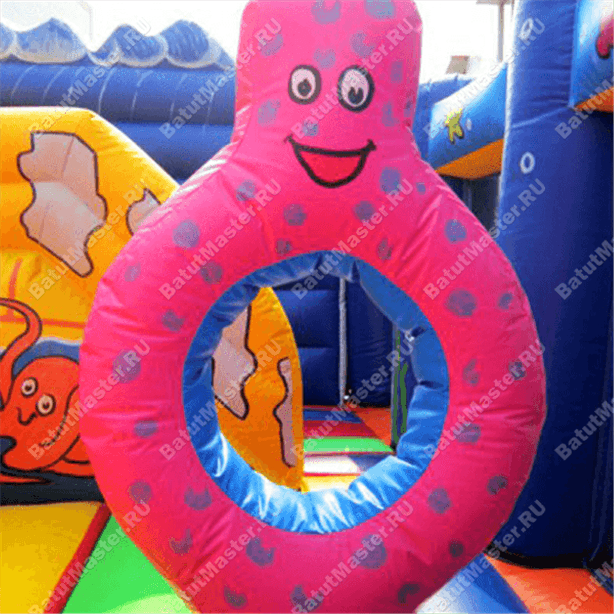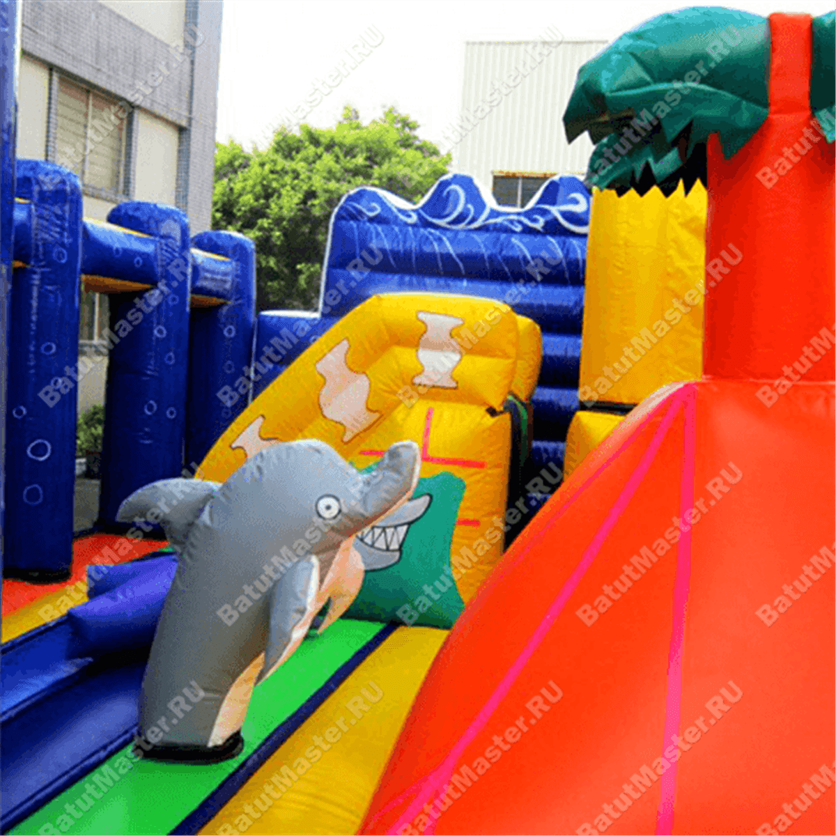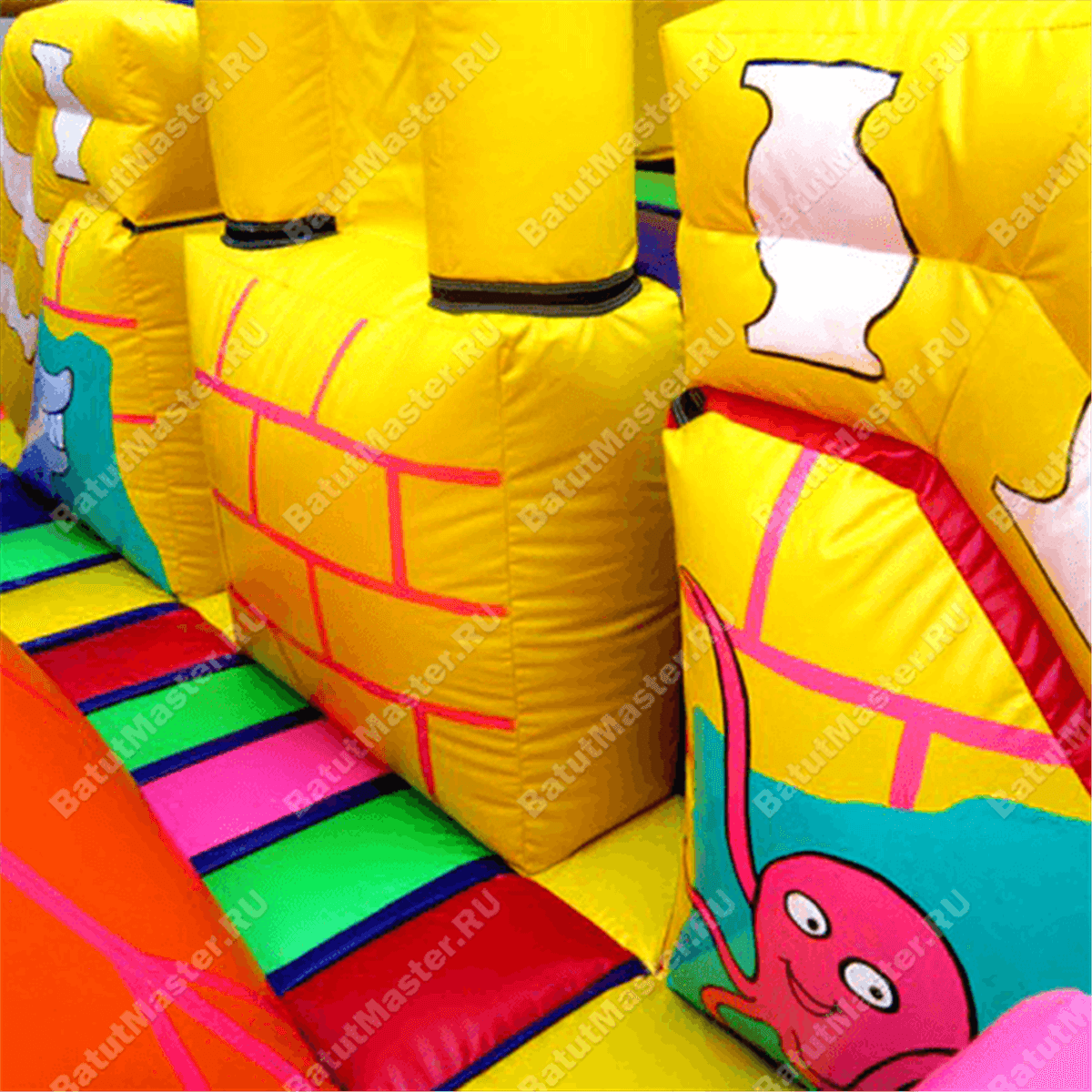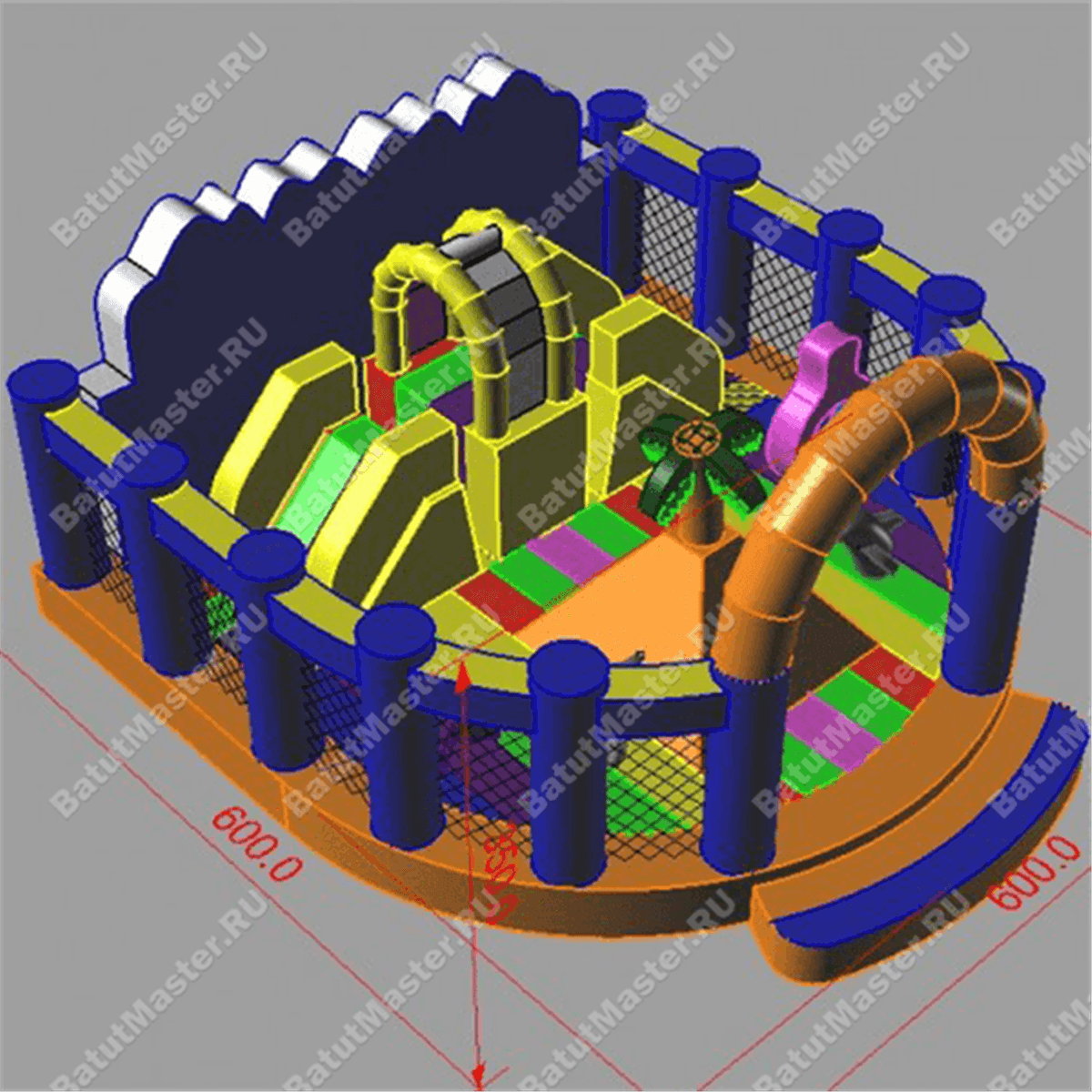 В задней части аттракциона установлена горка, она стоит перпендикулярно входу. С правой стороны возвышения установлена лестница наверх, в левой части простирается спусковое полотно, а верхняя площадка оформлена арочными креплениями. Между горкой и надувными фигурками остается свободная площадь для активных игр - на красочном полу можно бегать и кувыркаться. А благодаря расположенному на бок спуску с горы детки могут играть, не мешая друг другу.