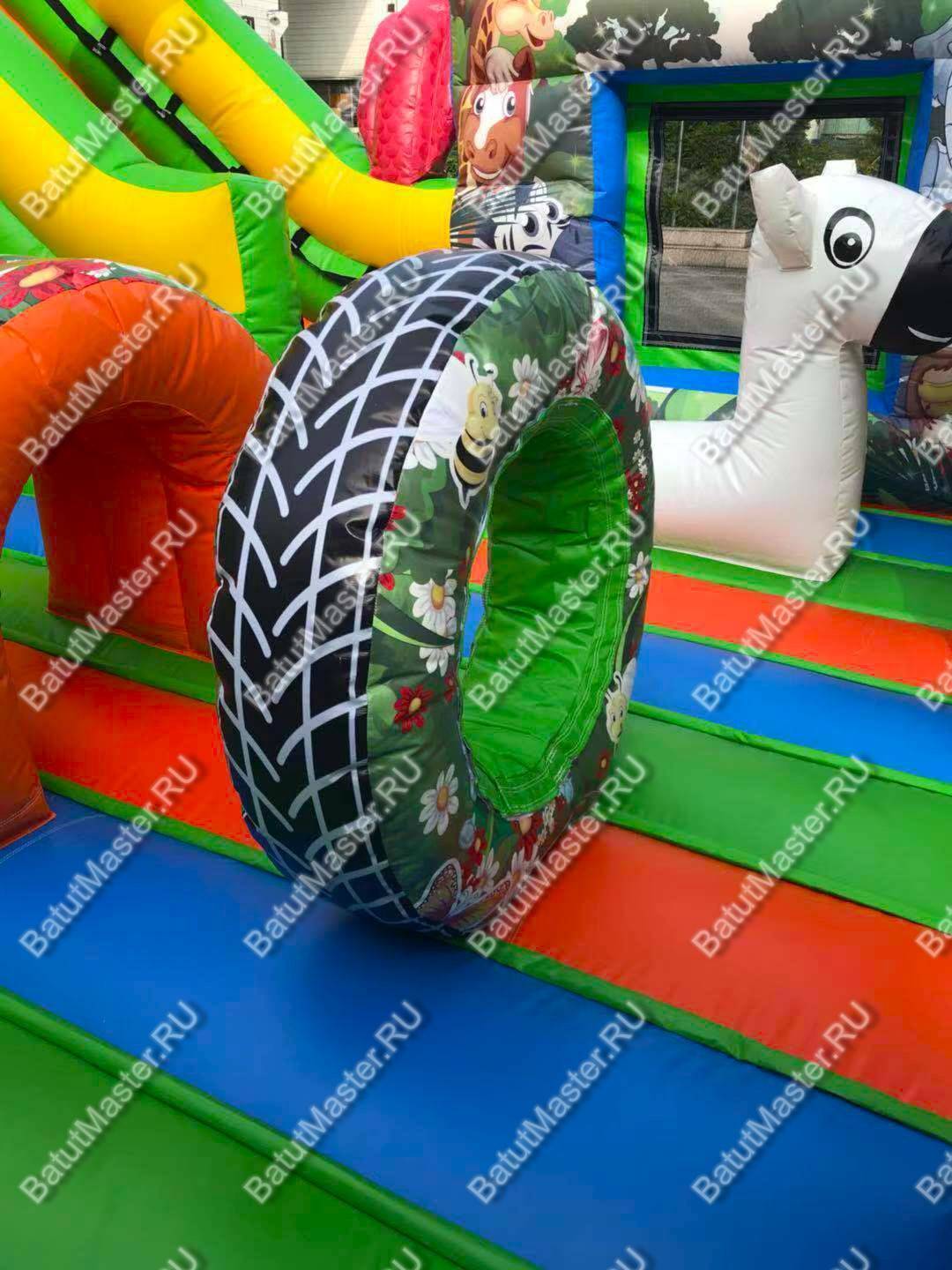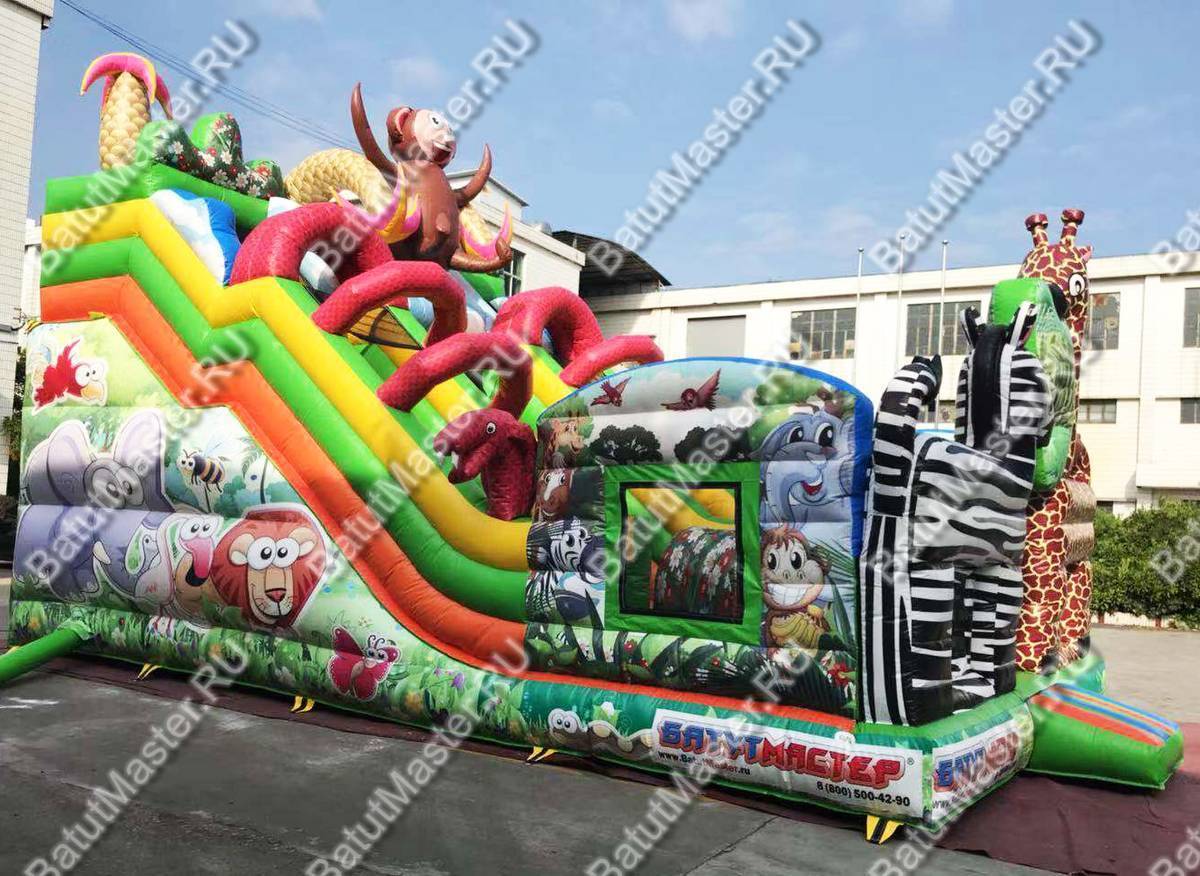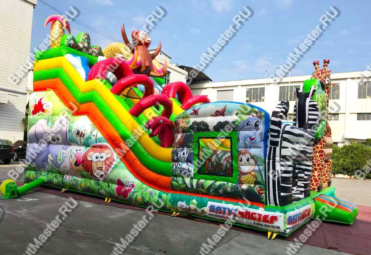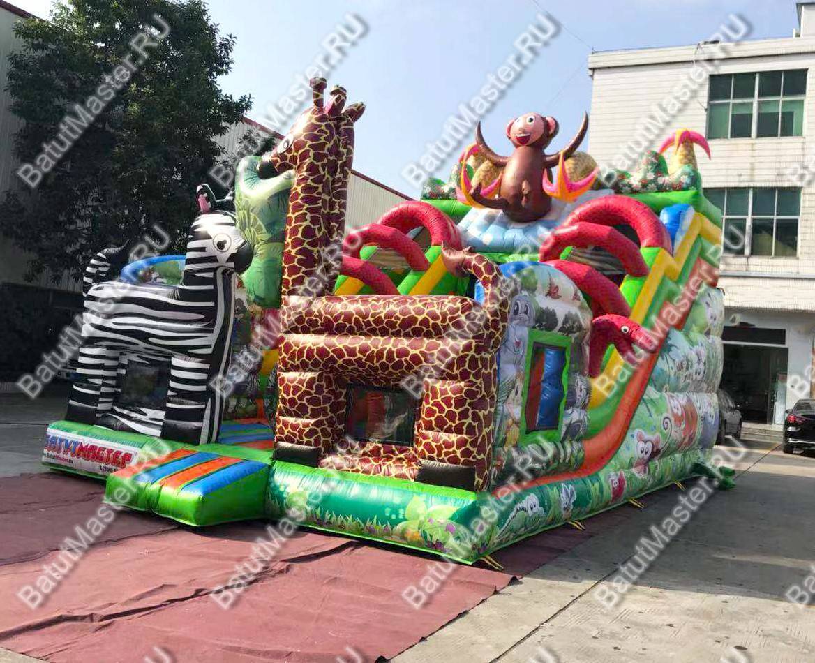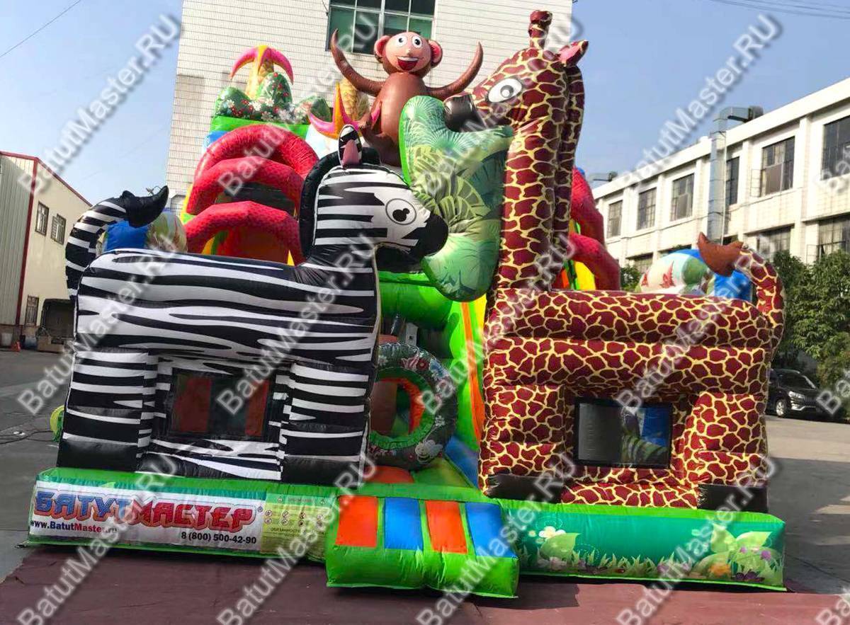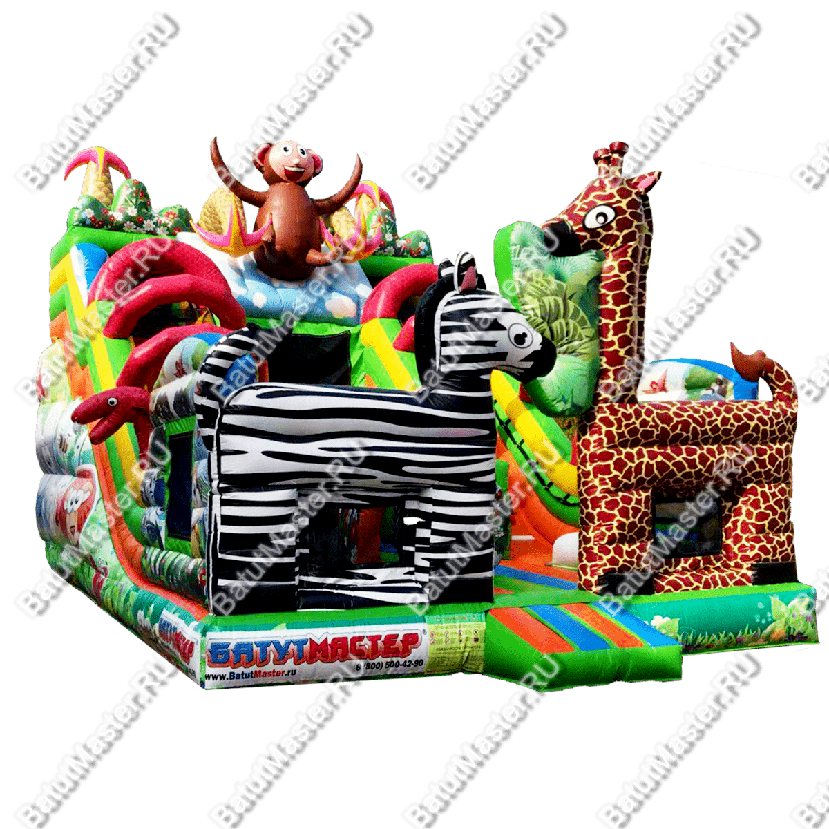 Добро пожаловать на веселую арену! Впереди детей ждет увлекательное и интересное времяпровождение в кругу зверей. Надувные жирафы, зебры, обезьяны, змеи и многие другие задают тематику надувного комплекса. Здесь имеются мягкие модули в виде колец, через которые так интересно пробираться дальше, большой спуск и безопасный подъем на него, окруженный мягкими бортами. Яркий, надувной батут станет любимым местом времяпровождения у детей в возрасте от трех лет. По бокам комплекса и сзади имеются окошки, а это значит, что родители смогут видеть своих детей во время игр. Также здесь имеется дополнительная зона для прыжков. Коммерческий батут не занимает много места при наличии самых интересных зон и локаций. Он с легкостью устанавливается на все виды ровной поверхности и даже на песок. Не выгорает на солнце и не портится при низкой температуре. Это отличный вариант для детской игровой площадки, а также развлекательной зоны на территории гостиницы или торгового центра.Предназначен для бизнеса. Качественный и прочный, выполнен из ламинированного ПВХ. Неприхотливый и простой в уходе и эксплуатации. Мощный насос, который входит в комплект обеспечивает бесперебойную его работу на протяжении долгого времени.
