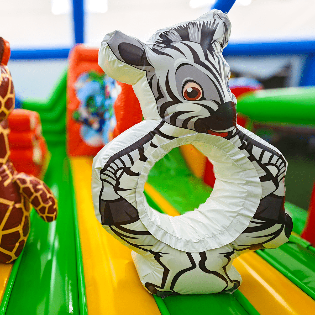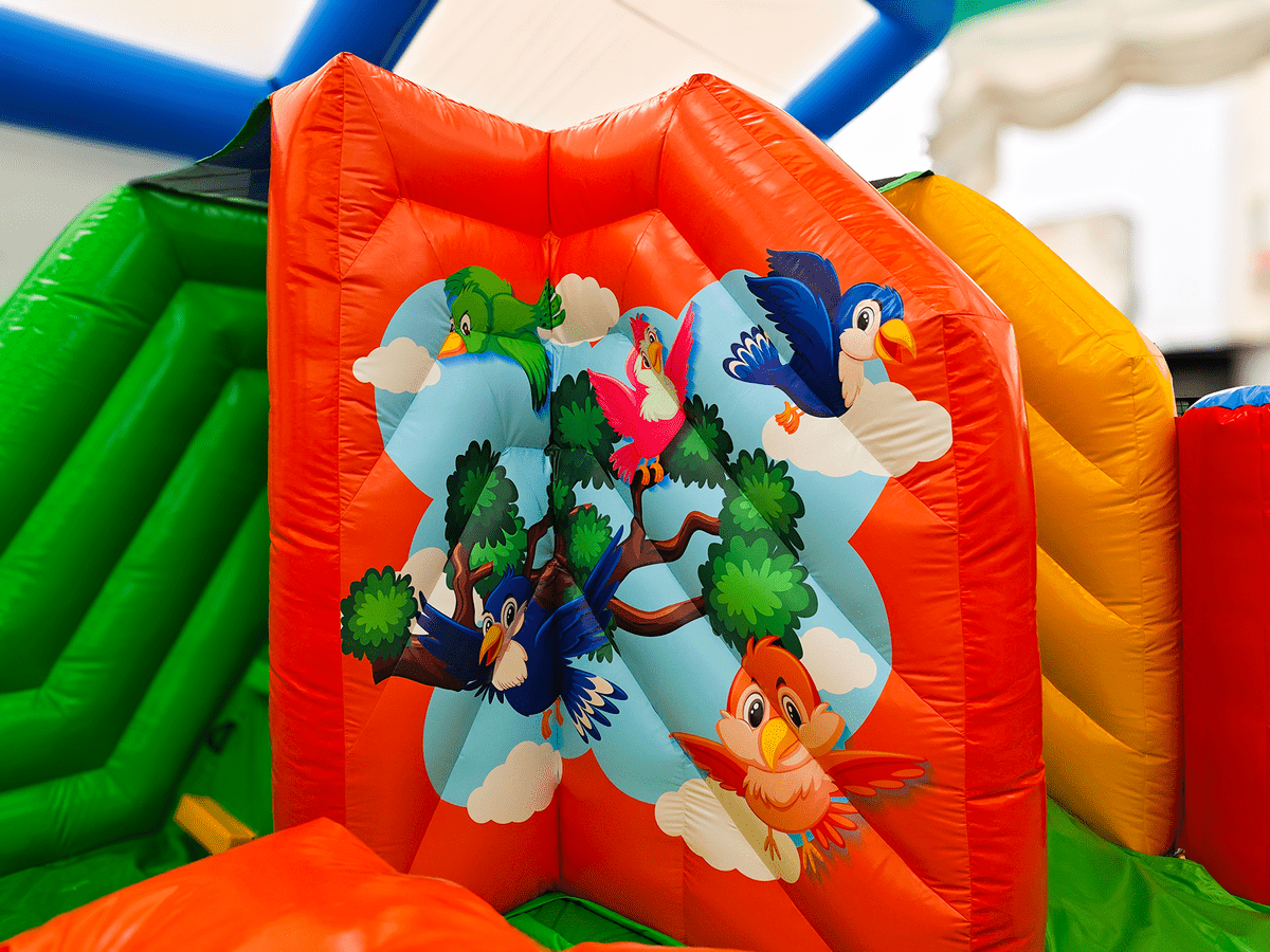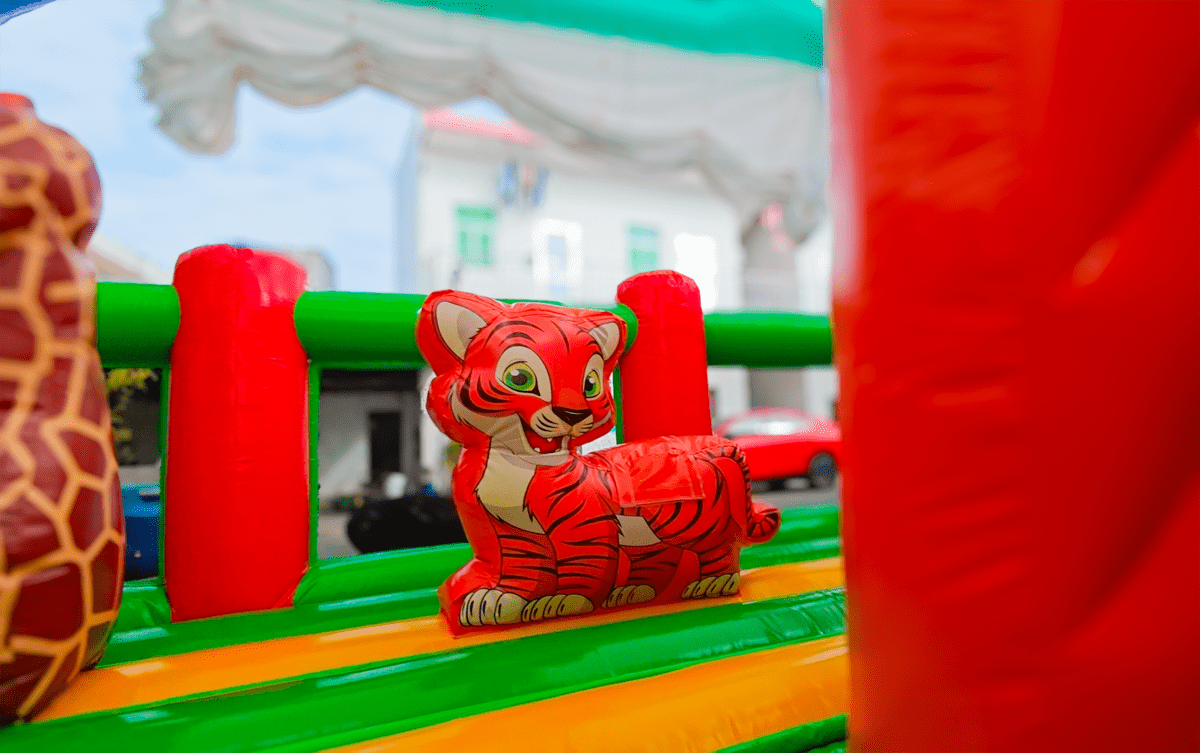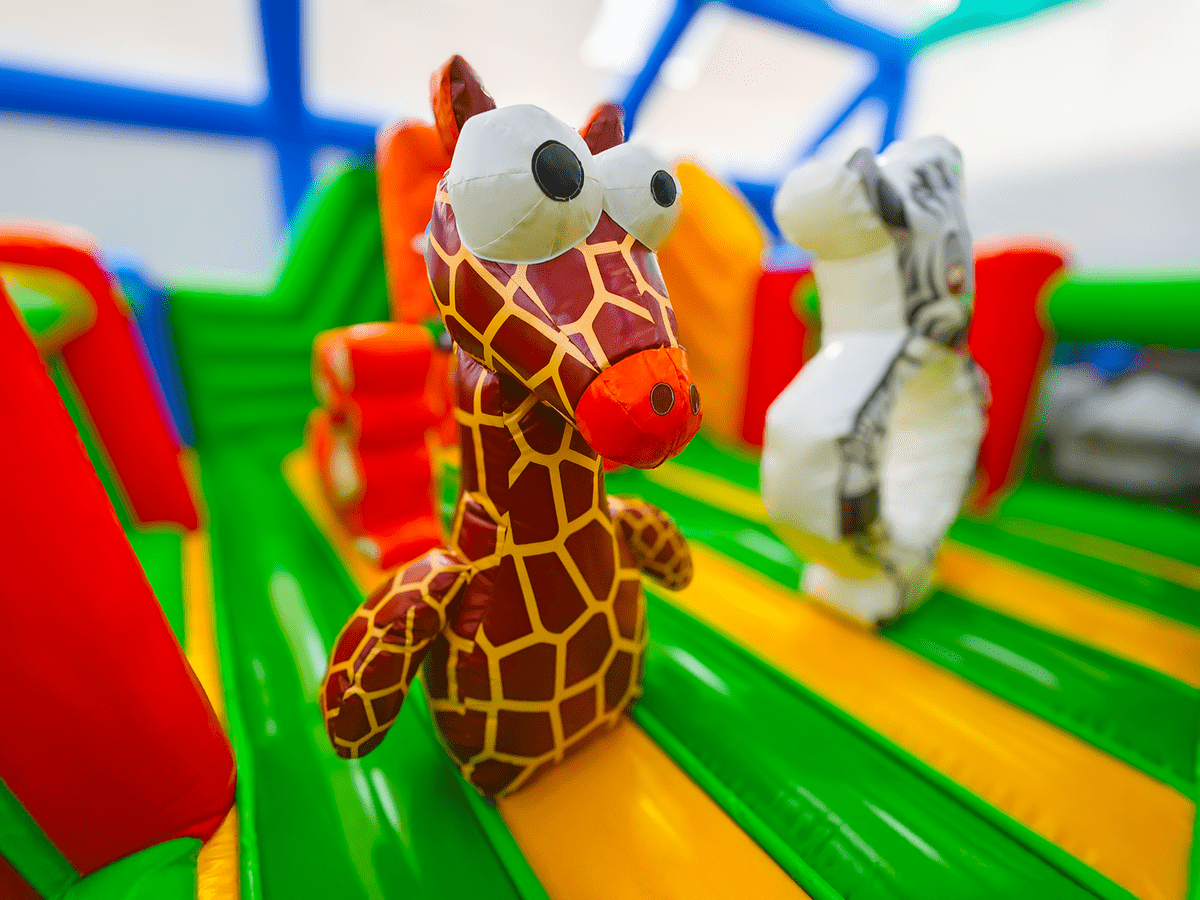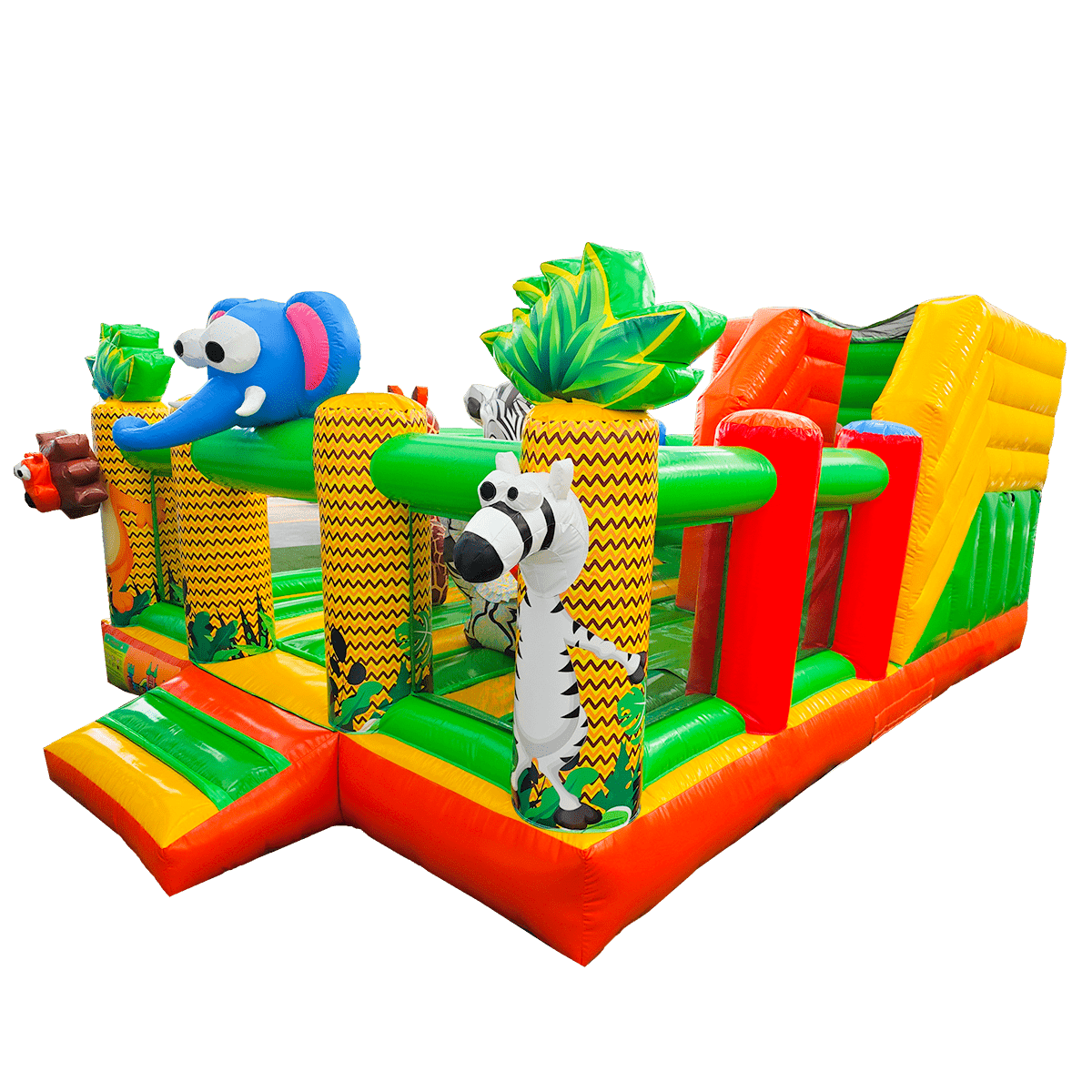 «Чудо-сафари» — это полноценный надувной игровой мир с атмосферой африканских джунглей. Его яркий дизайн сочетает насыщенные зелёные, жёлтые, оранжевые и красные цвета, а также фигуры животных: зебра, слон, пальмы. Всё это привлекает внимание детей, побуждает к игре и создает праздничное настроение. Горка со стартовой высотой 0,8 м позволяет детям скатываться, сменяя активность, а декоративные элементы создают эффект приключения.