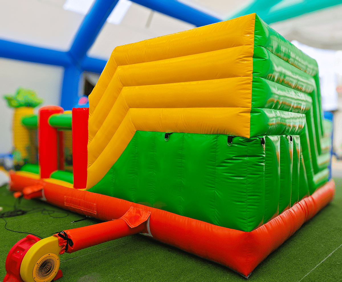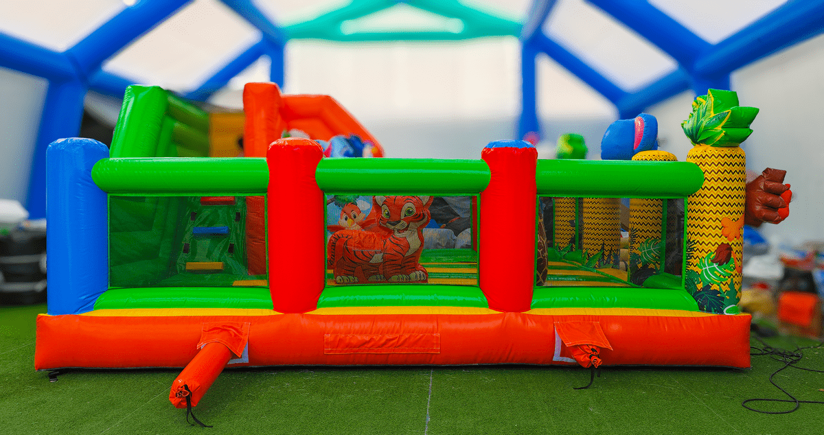 Размеры конструкции составляют 6x4x2.8 метра. Площадь в 24 м² позволяет одновременно играть 7 детям, обеспечивая высокую проходимость. Надувные животные,кольца пролазки, препятствия, пандус-ступень именно в этом аттракционе, делая его полноценной игровой зоной.