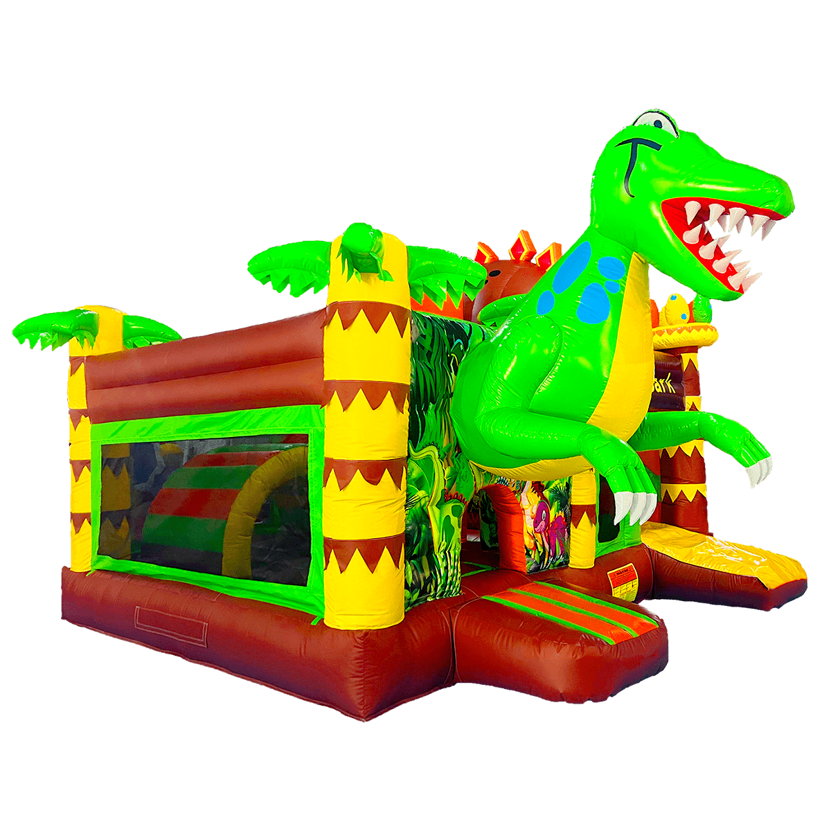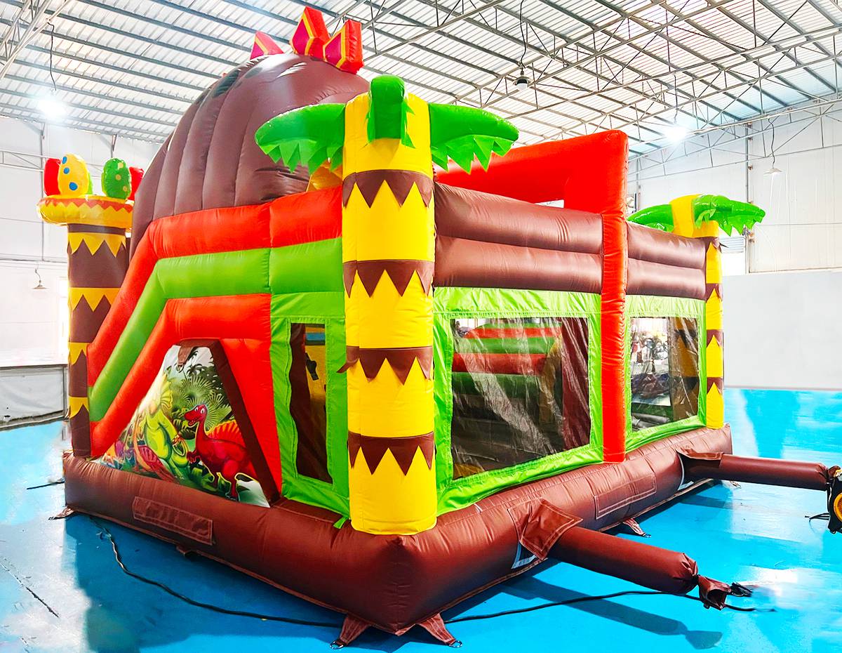 БатутМастер предлагает коммерческий батут «Дино-прыжок» в категории надувное оборудование для бизнеса. Материал изготовления – прочный армированный поливинилхлорид (ПВХ). Яркий красочный надувной комплекс подходит для установки на улице или в помещении. Изготовлен в форме открытого комплекса для прыгания, лазания, скатывания с горки. Необычный коммерческий надувной батут «Дино-прыжок» декорирован надувными пальмами по углам площадки, фигурками надувных динозавров. Основные цвета детского надувного батута «Дино-прыжок» – зелёный, желтый, оранжевый, коричневый. При входе детей встречает большой динозавр, а на бортиках изображены его весёлые друзья: дракончики и динозаврики.