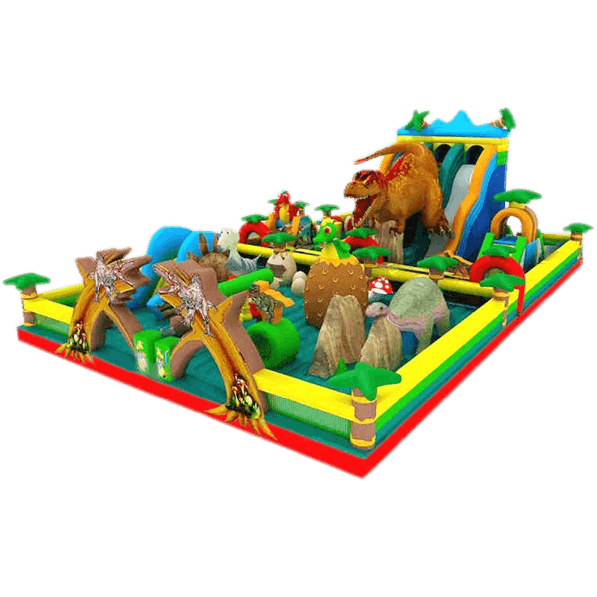 Этот яркий необычный комплекс понравится всем без исключения, а на фоне городских пейзажей доисторический батут будет еще более привлекательным и эффектным.