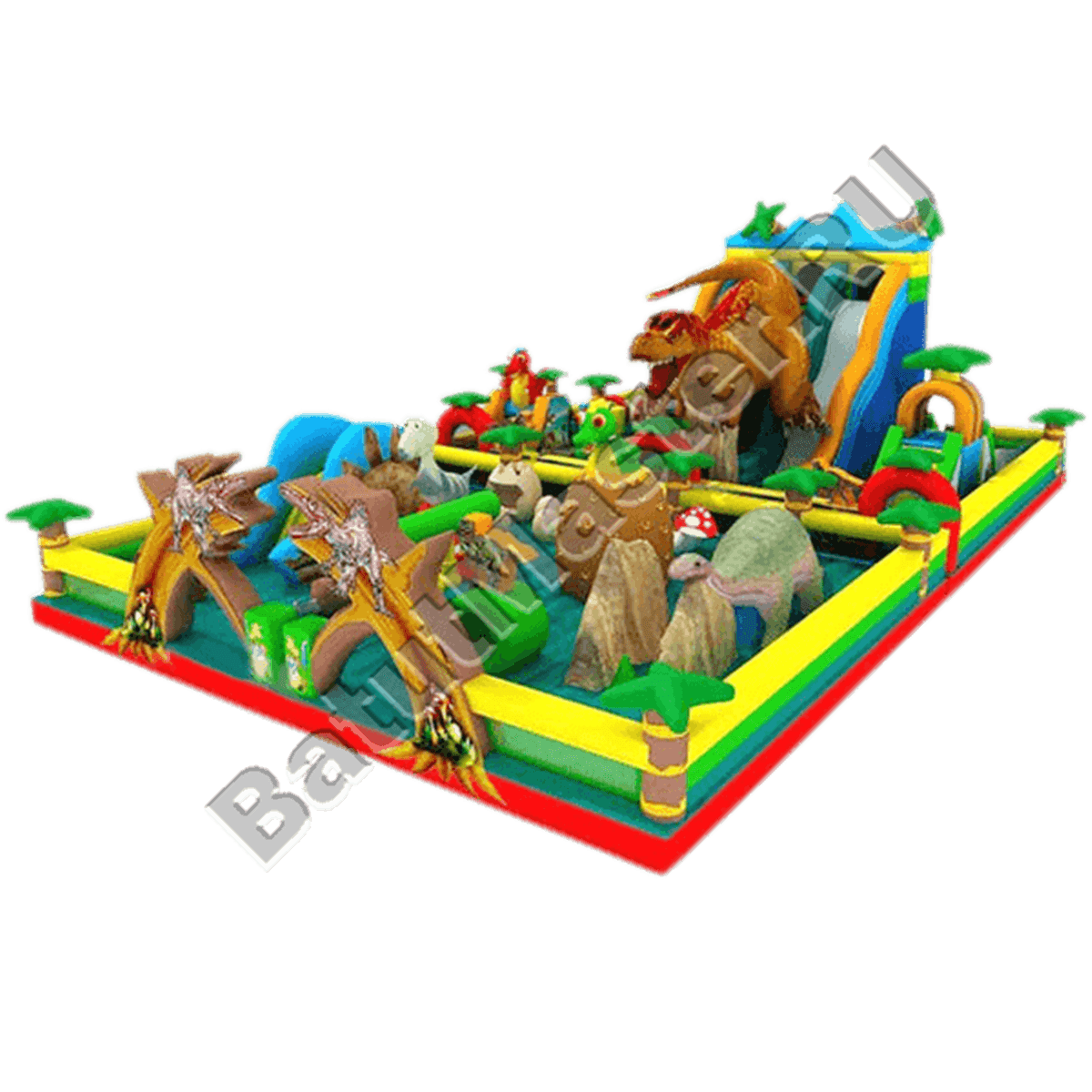 Огромный батут визуально разделен на две половины – одна часть содержит высокую горку с огромным тиранозавром сверху, на второй половине расположены многочисленные фигуры древних ящеров. Рядом с большим спуском есть горка для малышей, она значительно меньшего размера. На большой горе фигура динозавра расположена сверху лестницы и лапой немного закрывает спусковую полосу.