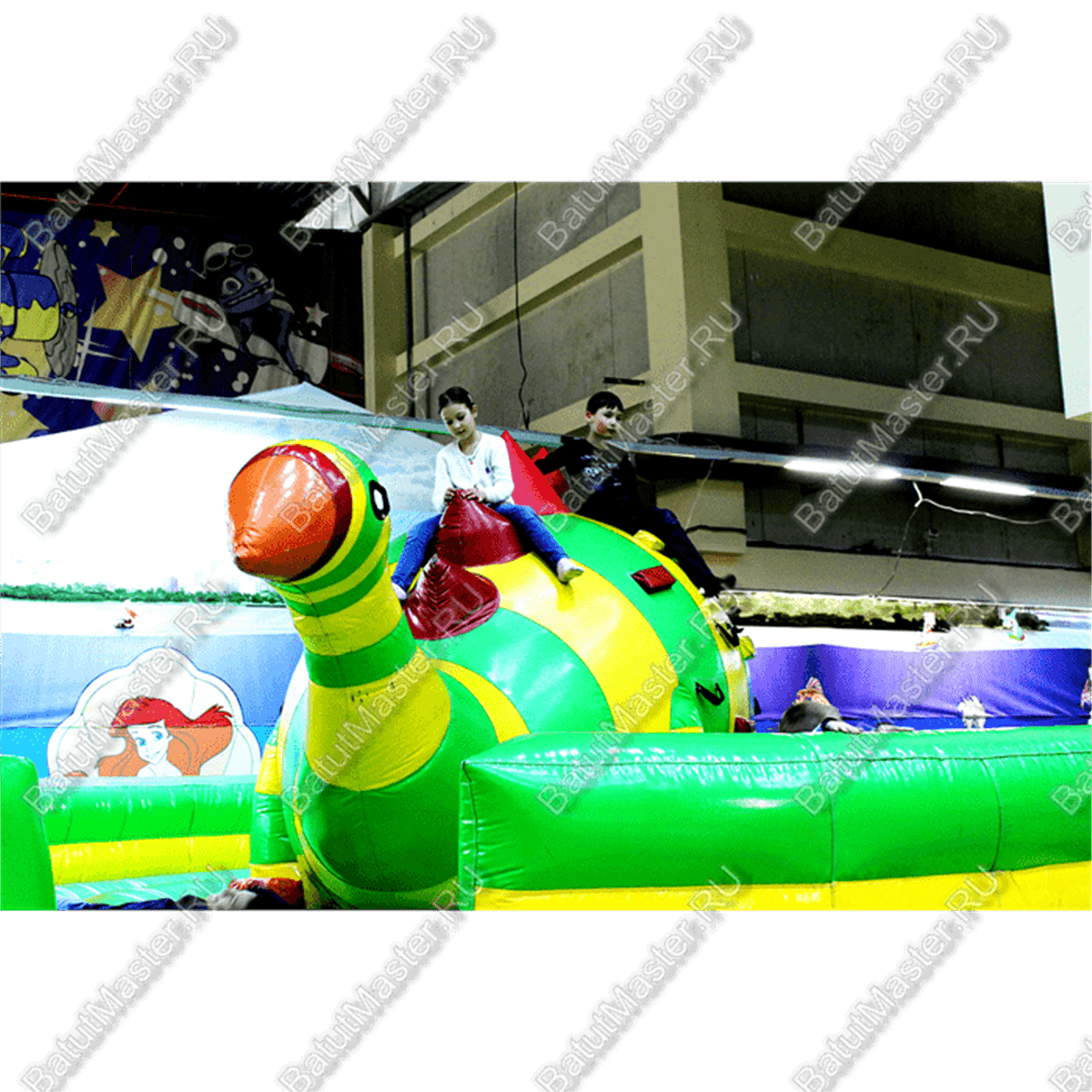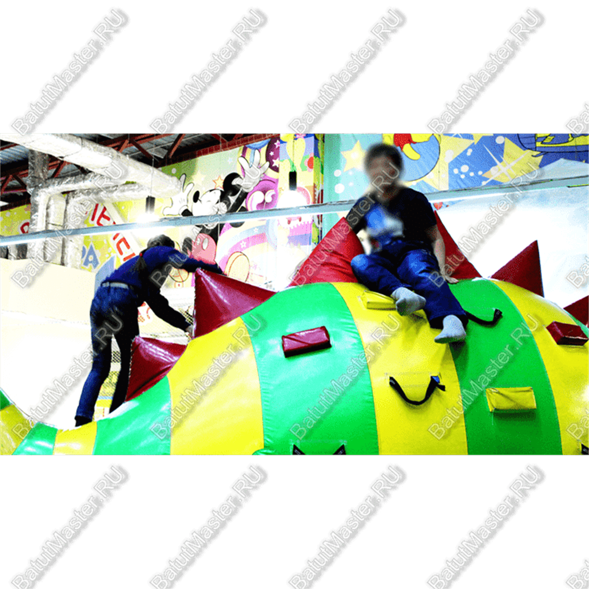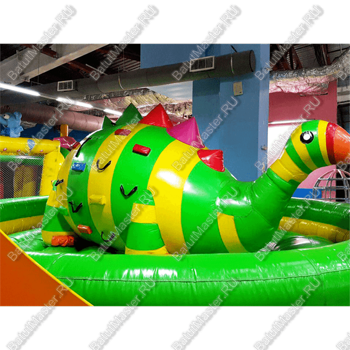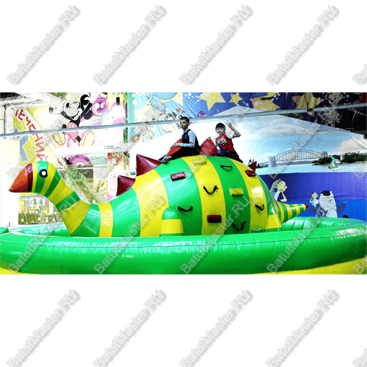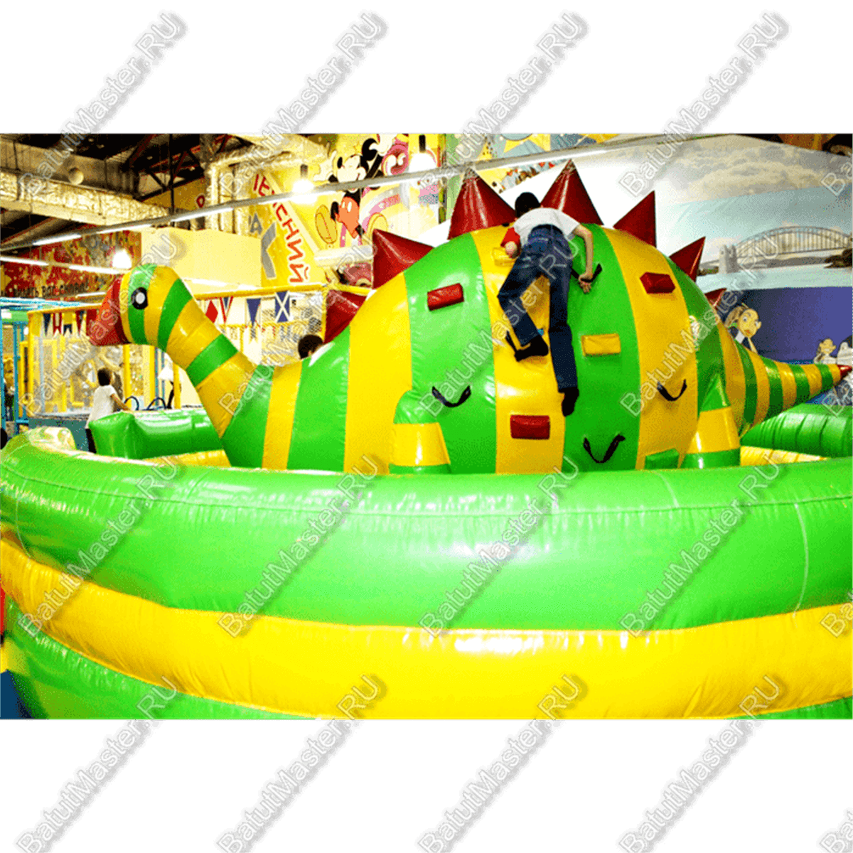 Игровой коммерческий батут для детей в виде динозаврика привлечет внимание каждого ребенка. И это непросто надувной динозавр, а целый скалодром! Он такой большой, что поместиться на нем сможет целая команда, ведь играть вместе еще веселее. Надувной батут выполнен таким образом, чтобы дети смогли забираться на фигурный модуль-скалодром с двух сторон одновременно, а потом размещаться на верхних мягких шипах и раскачиваться вперед - назад. Не стоит бояться за их безопасность, ведь в комплексе она предусмотрена как нельзя лучше. Борта со всех сторон не дадут ребенку выпасть наружу, а также обеспечат мягкое приземление и предотвратят удар. Залазить и толкаться, а потом весело спускаться вниз – вот чего хотят дети.