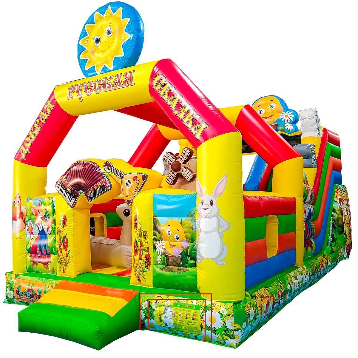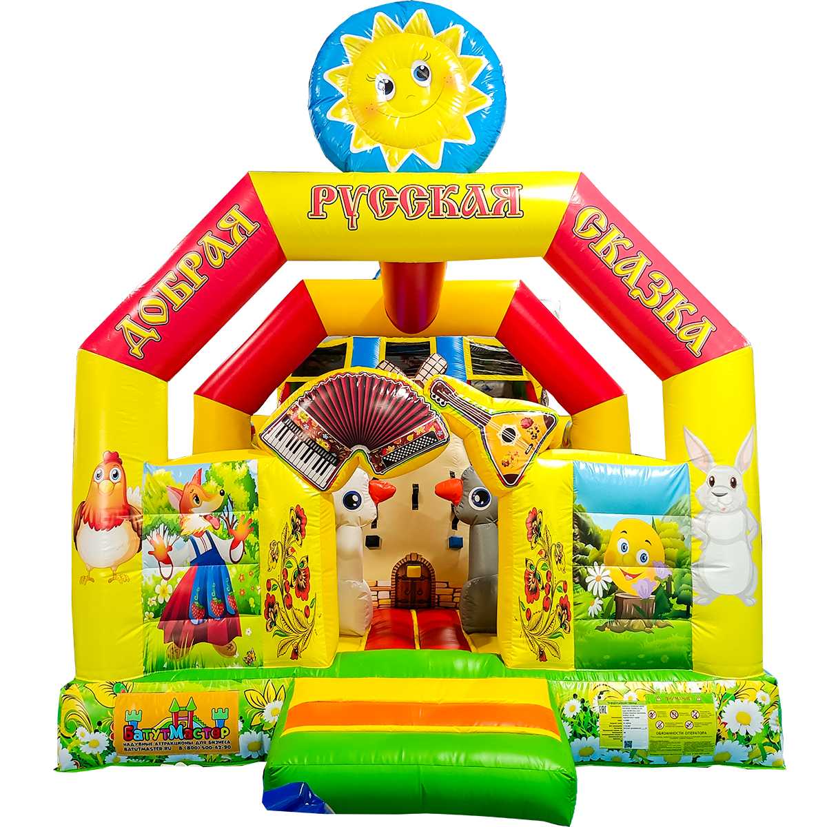 Надувной тематический батут «Добрая русская сказка» с горкой поставляется в комплекте с насосным оборудованием, материалом для ремонта и чехлом. Изготовитель БатутМастер дает гарантию на изделие сроком 12 месяцев. Все батуты доставляются с паспортом и сертификатами соответствия безопасности для аттракционов.