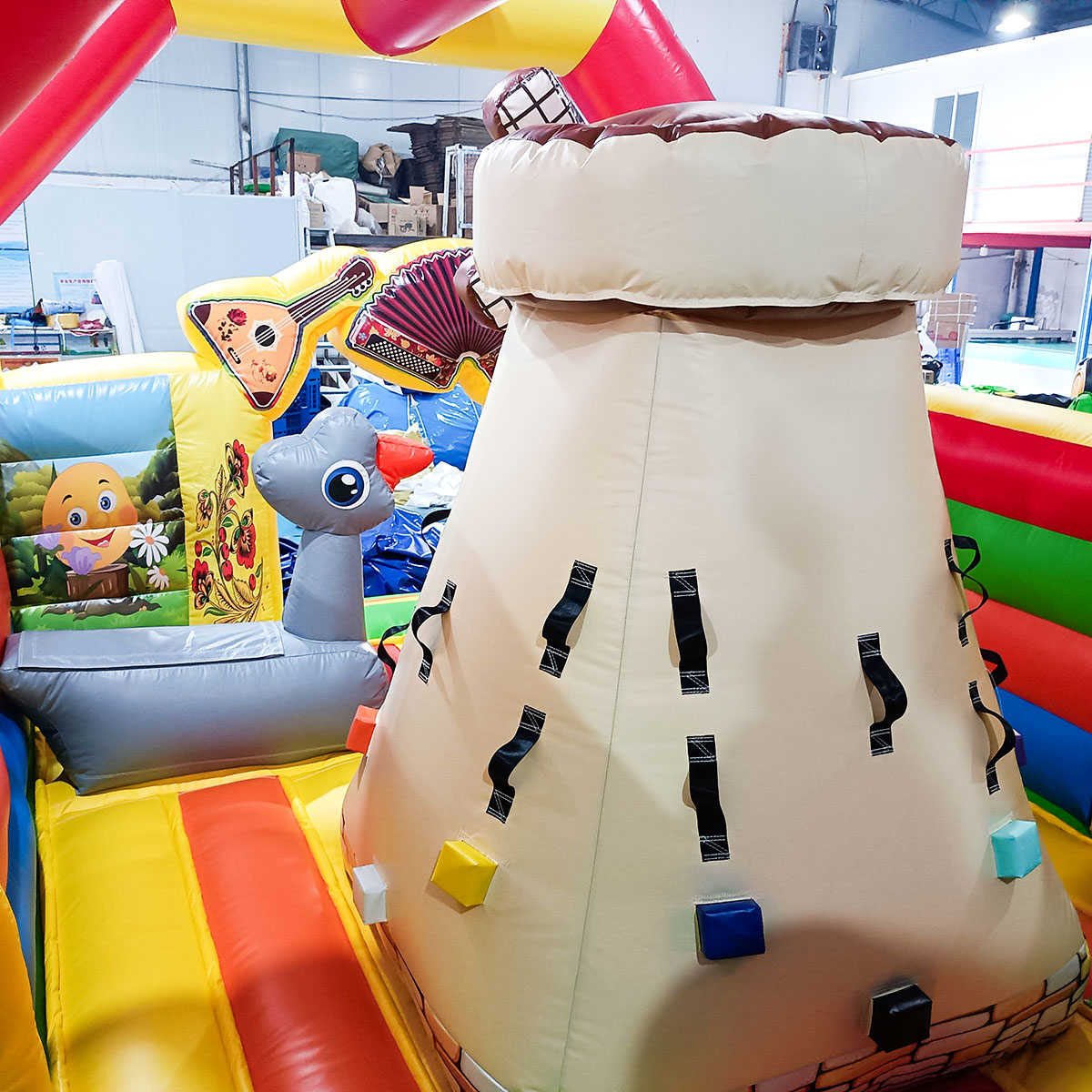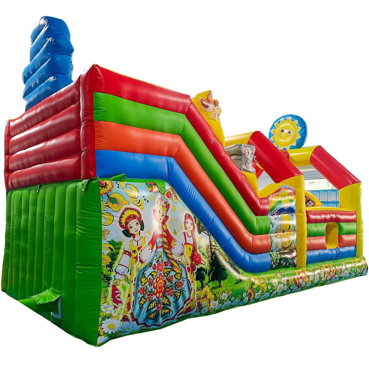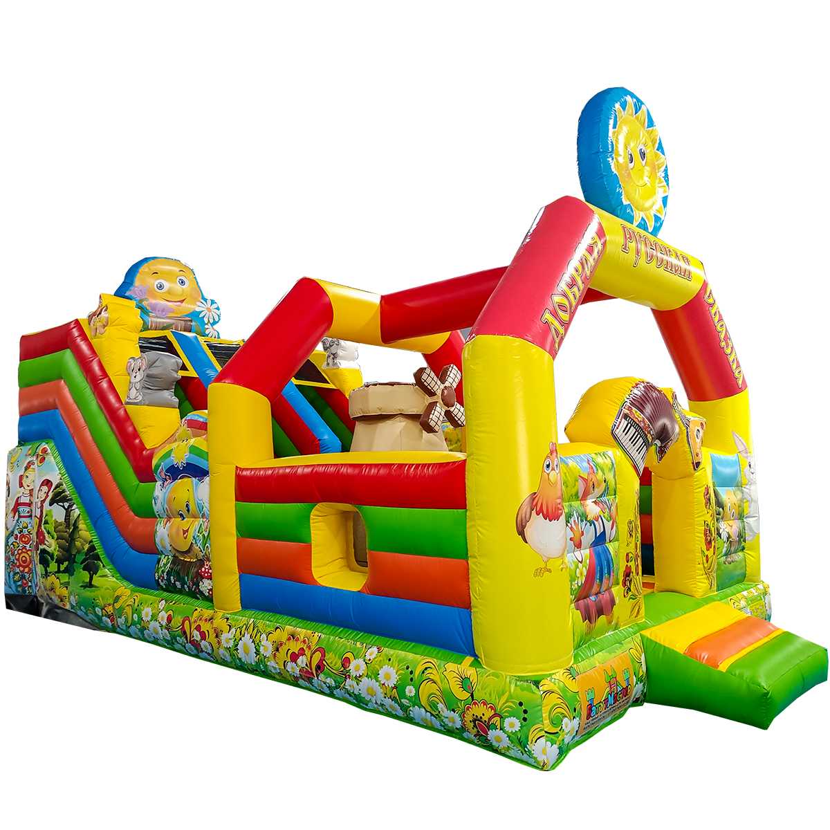 Герои народных сказок и фольклора редкость в популярных развлекательных местах, надувной расписной батут с горкой «Добрая русская сказка» привлекает внимание посетителей своим необычным стилем. Для дизайна использованы традиционные мотивы – русская печка, гуси-лебеди, матрешки, персонажи известных мультиков. Добрые герои, знакомые с детства персонажи отличный выбор стиля батута для установки во время праздников, ярмарок, в парках, любых открытых и закрытых площадок.