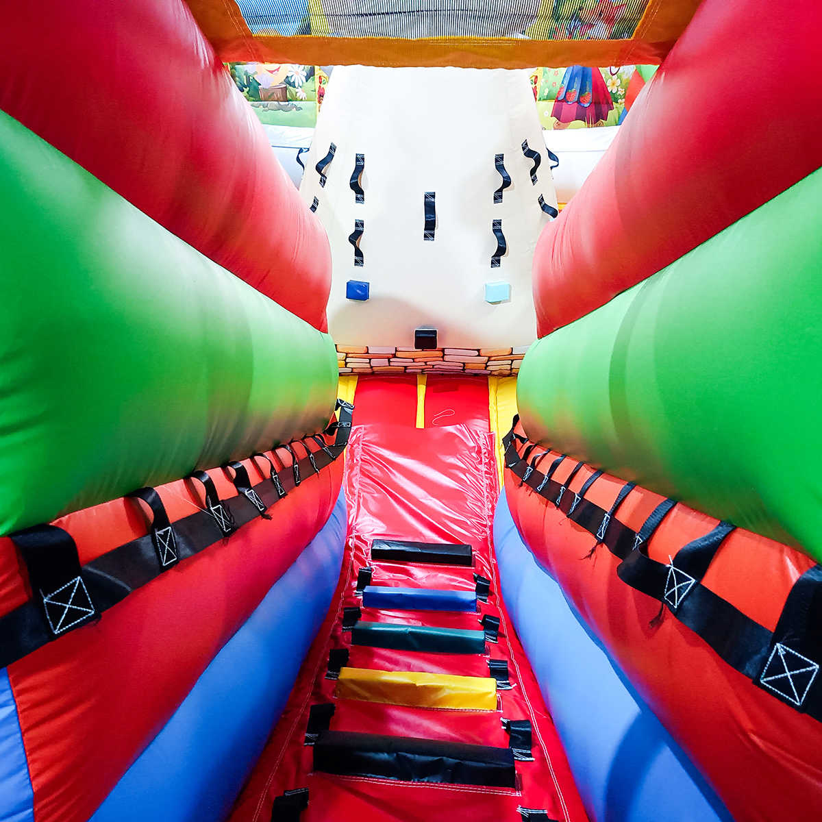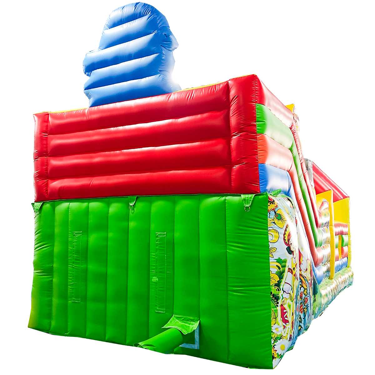 По желанию заказчика батут с горкой «Добрые русские сказки» может быть окрашен в любые цвета, также доступно брендирование надувного изделия.