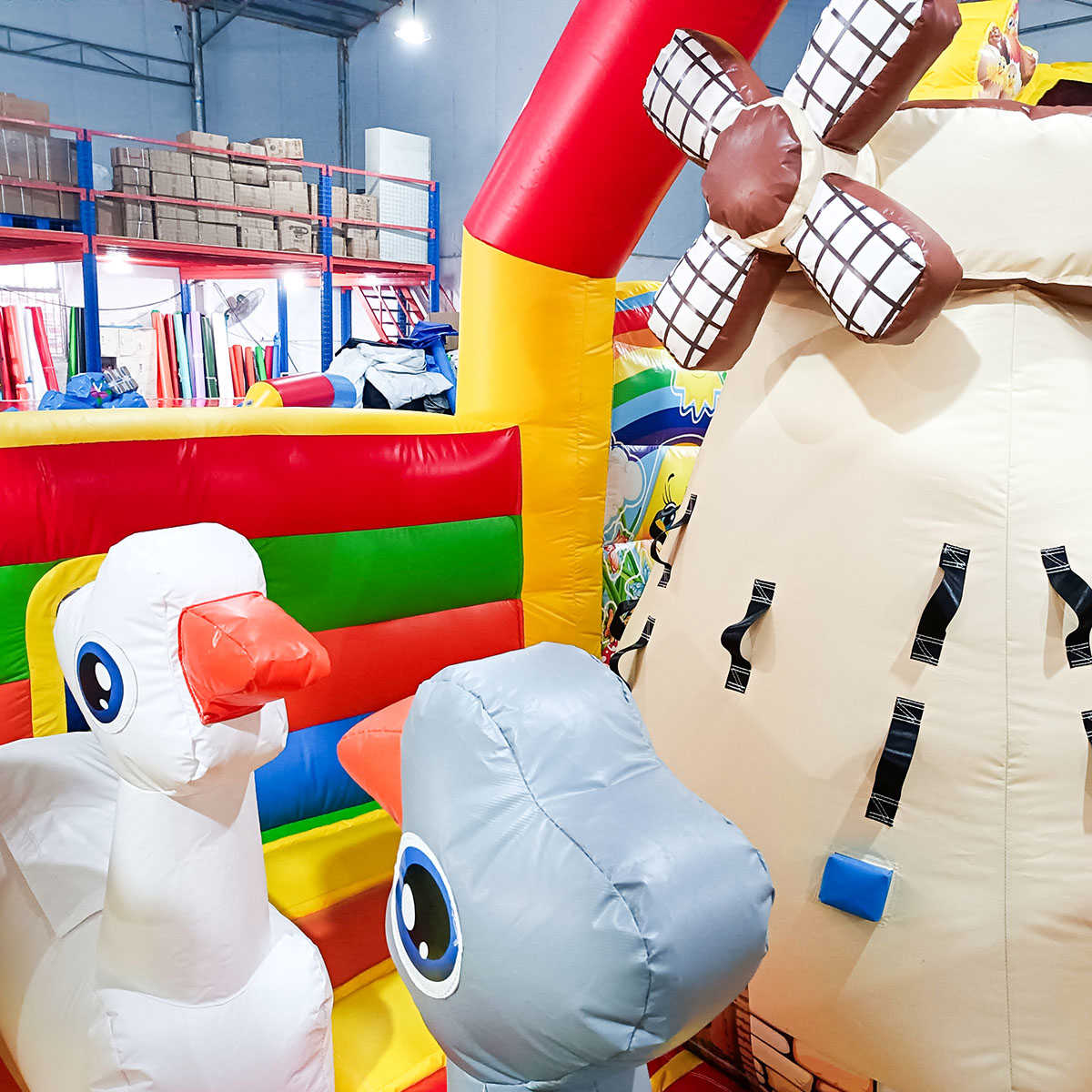 Народный надувной батут с горкой «Добрая русская сказка» изготовлен как открытая площадка для веселых игр. Внутри детей встречают два известных гуся – один серый, другой белый на них можно взобраться и попрыгать.