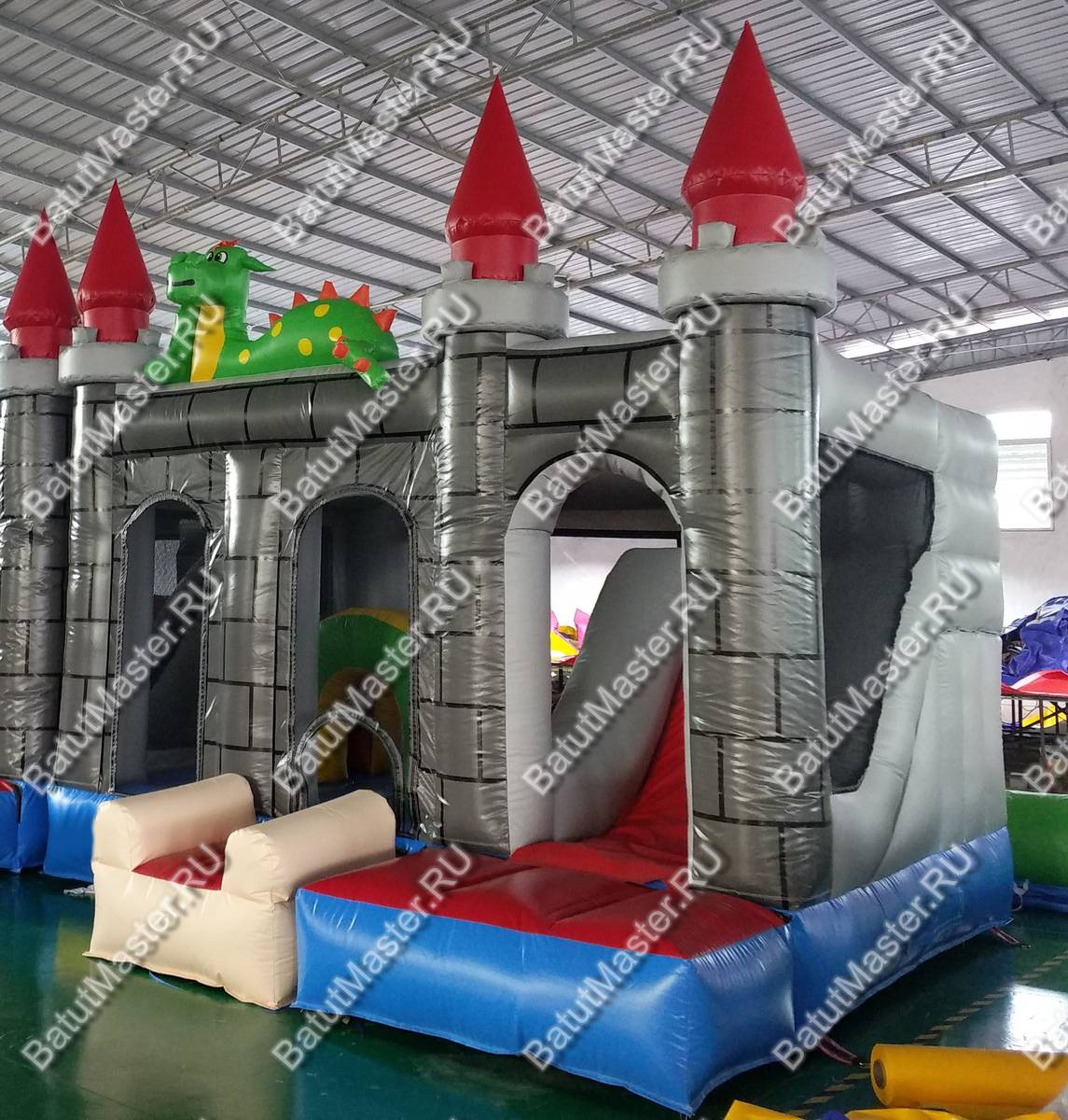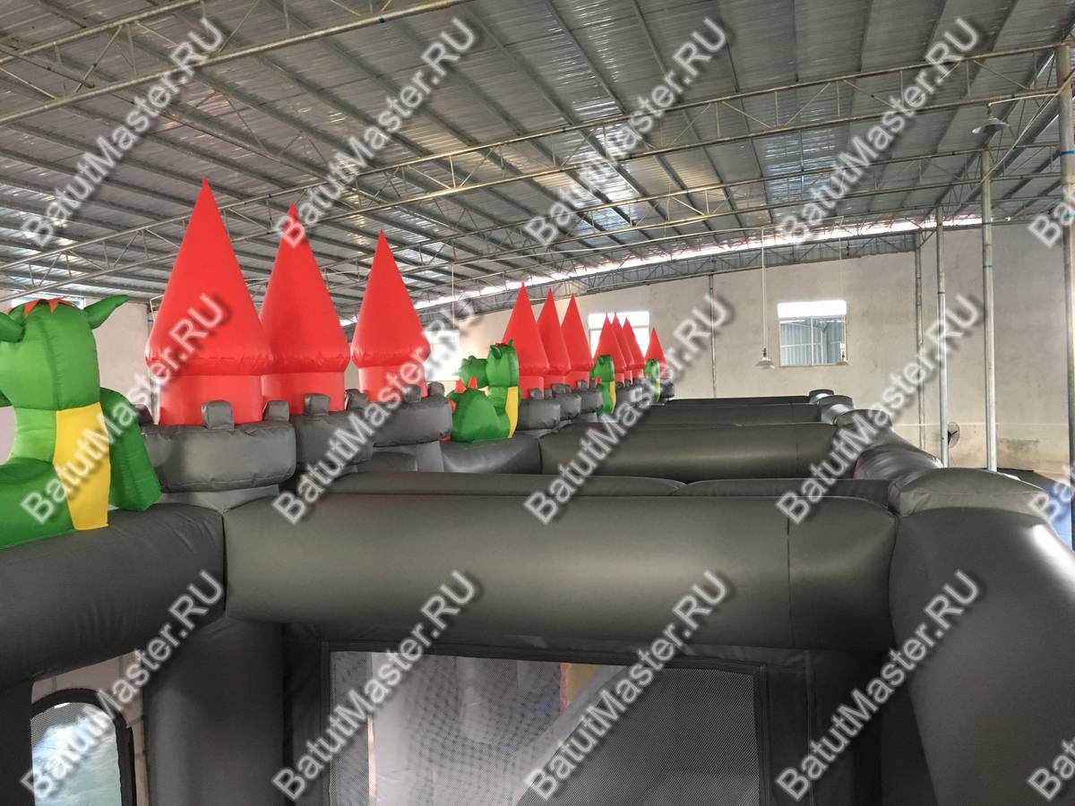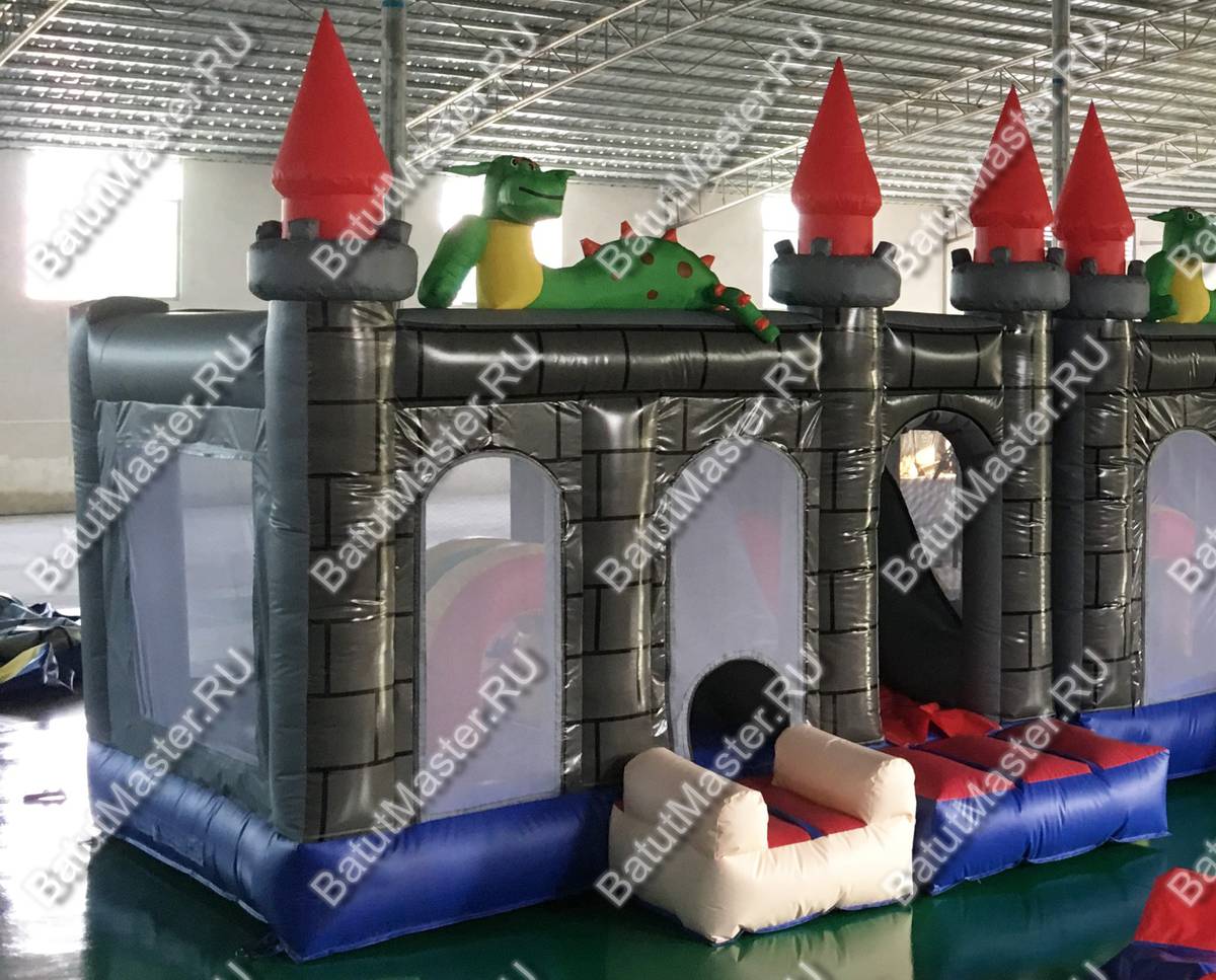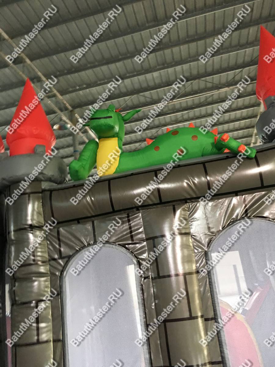 Надувной батут «Драконий замок» представляет собой площадку для игр, оснащенную горкой, тоннелями и прыжковым полем. Несмотря на его компактный размер, в нем размещены очень интересные локации. По всему батута имеются колонны, а спереди колонны с яркими башенками, отчего батут и стал похож на сказочный замок. И это еще не все! Главным украшением комплекса служат драконы, расположенные сверху конструкции. Между башенками закреплена прочная сетка, таким образом дети всегда останутся на виду у родителей, а также это обеспечивает хорошую циркуляцию воздуха и защищает детей от выпадения.