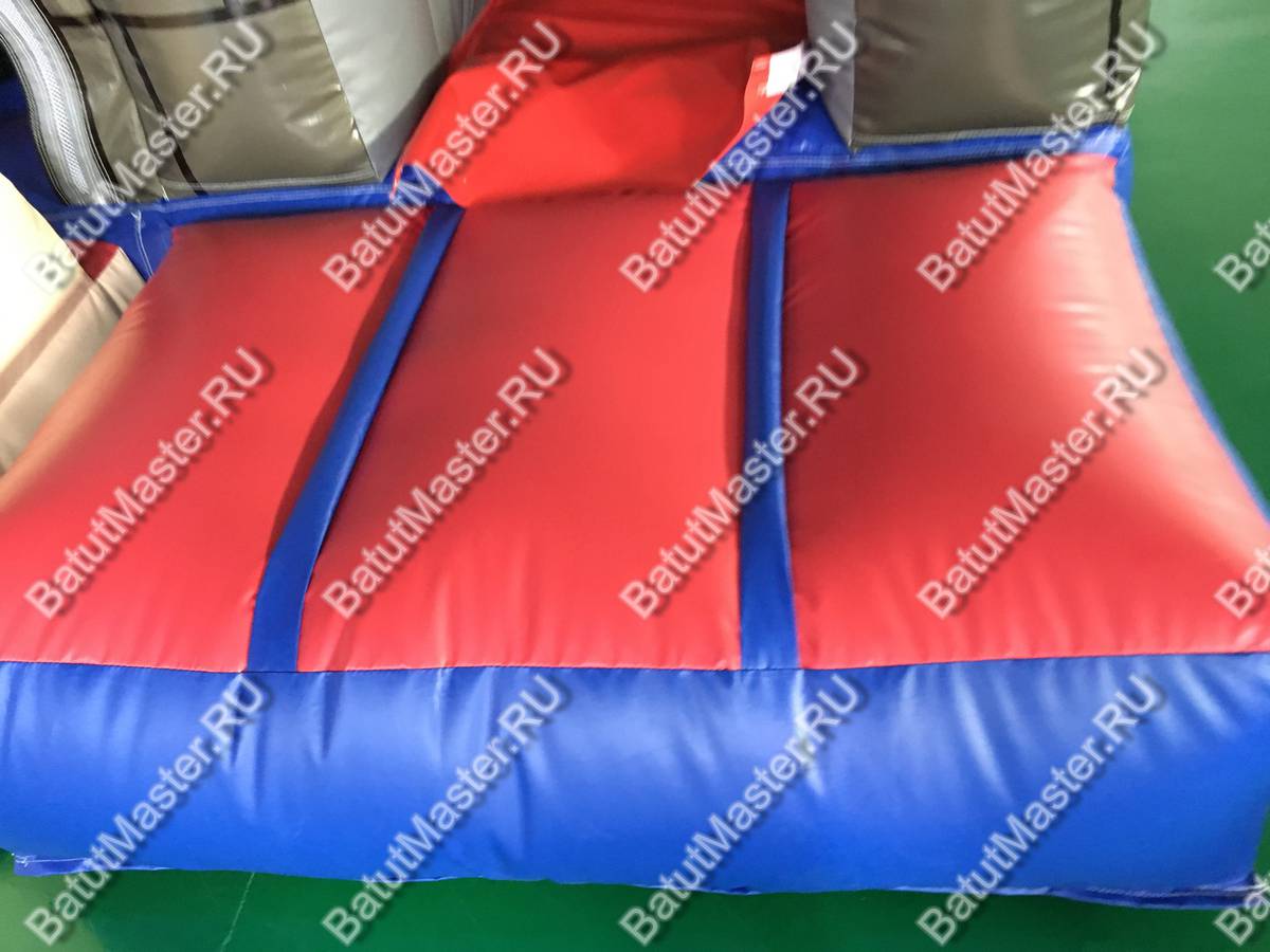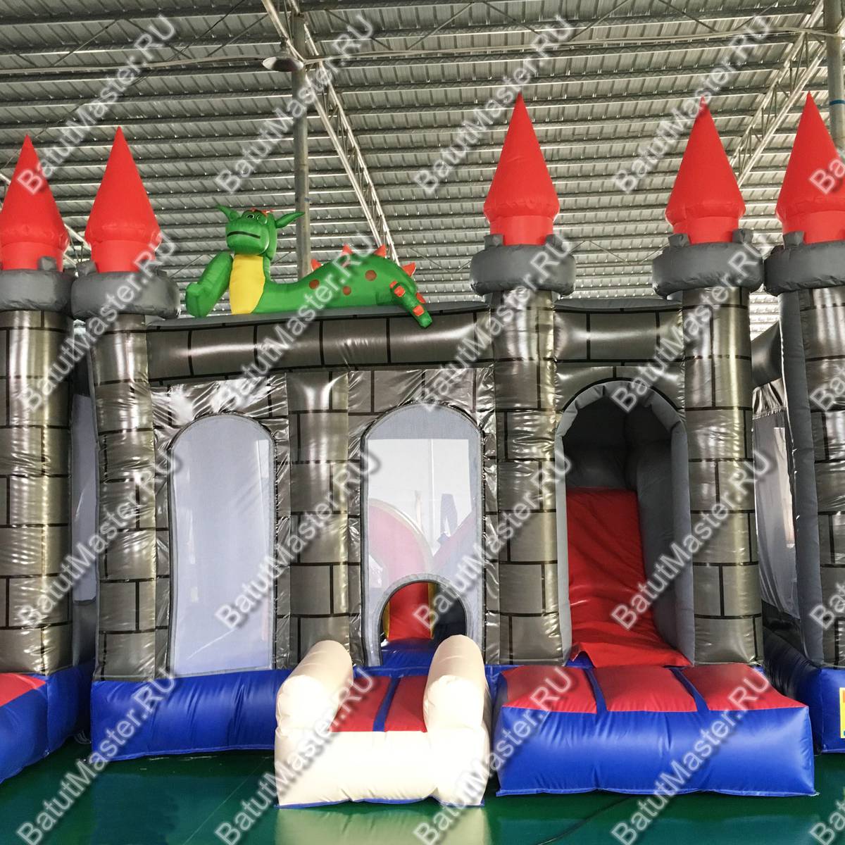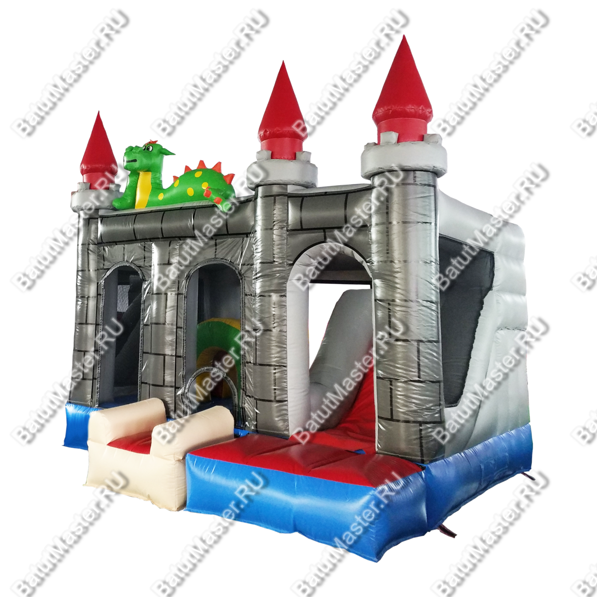 Надувной батут «Драконий замок» представляет собой площадку для игр, оснащенную горкой, тоннелями и прыжковым полем. Несмотря на его компактный размер, в нем размещены очень интересные локации. По всему батута имеются колонны, а спереди колонны с яркими башенками, отчего батут и стал похож на сказочный замок. И это еще не все! Главным украшением комплекса служат драконы, расположенные сверху конструкции. Между башенками закреплена прочная сетка, таким образом дети всегда останутся на виду у родителей, а также это обеспечивает хорошую циркуляцию воздуха и защищает детей от выпадения.
