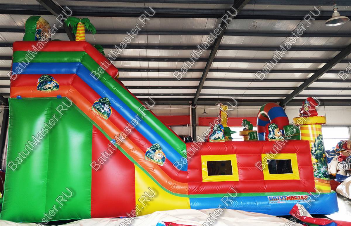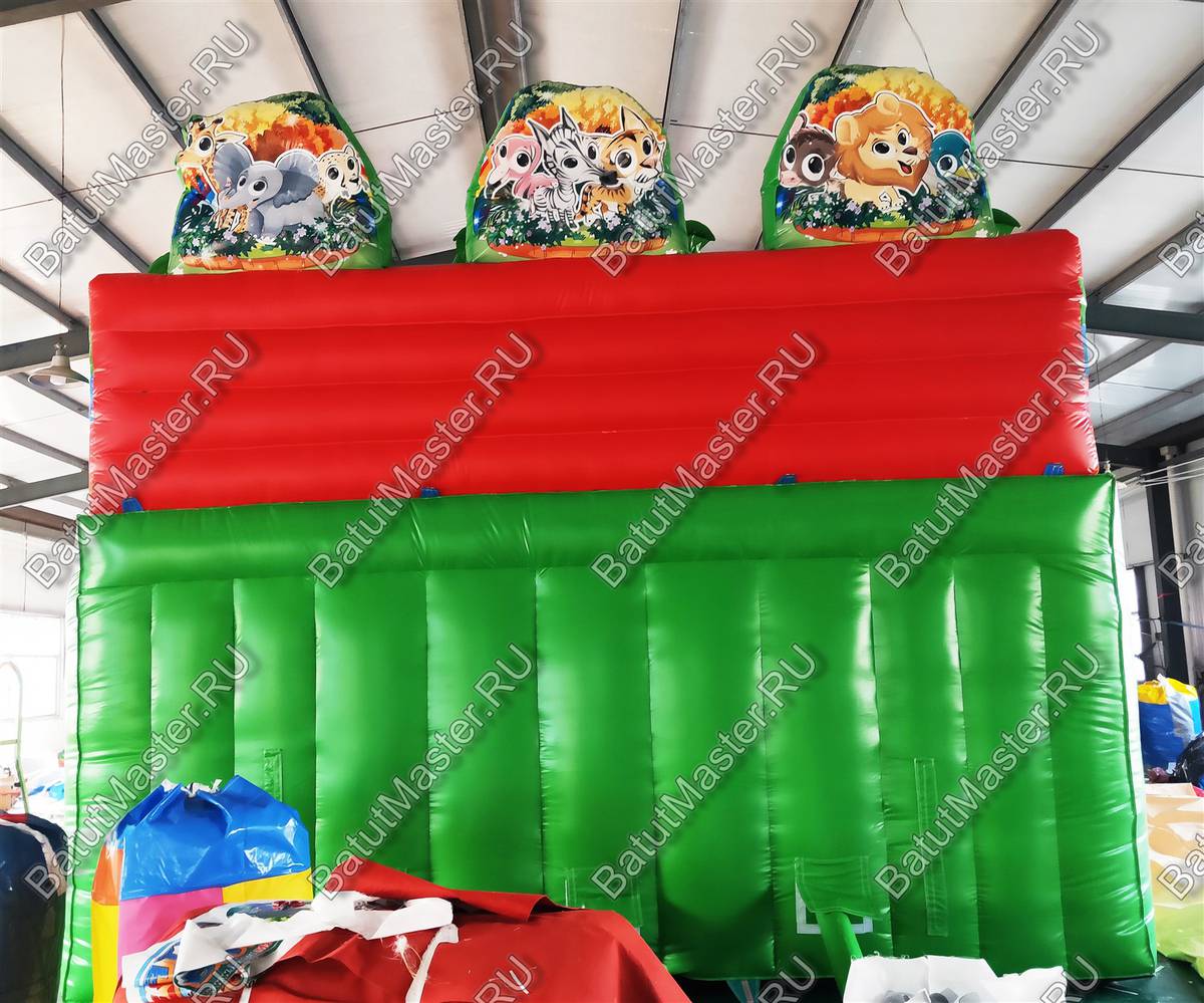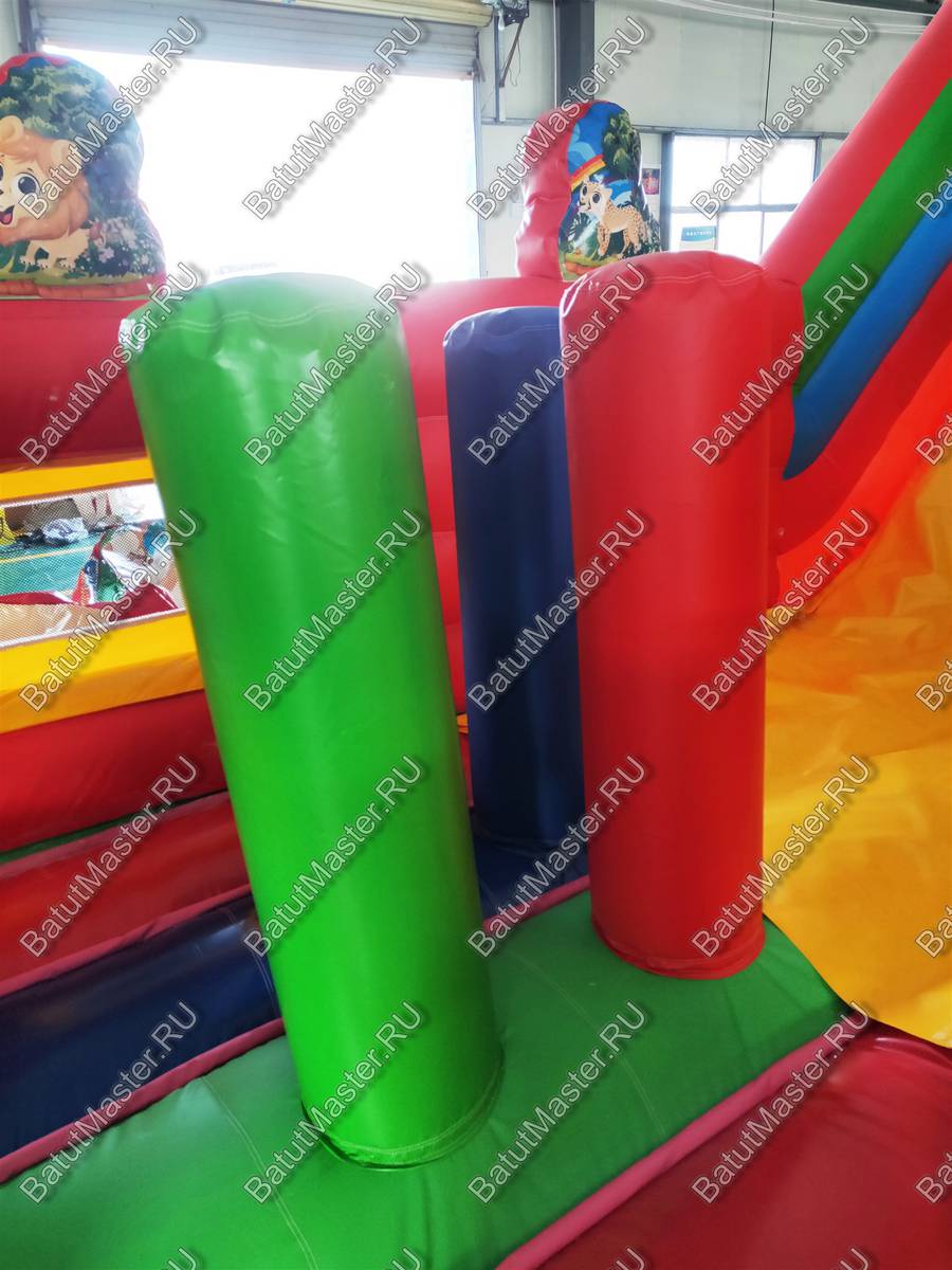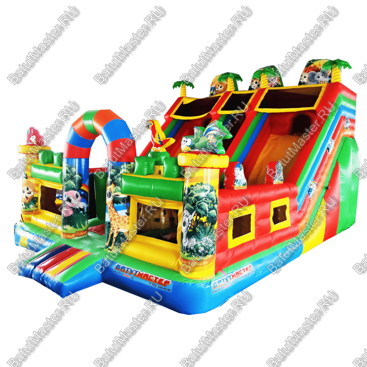 Коммерческий надувной батут «Дружная компания» Надувной батут «Дружная компания» - это интересный и яркий аттракцион со спуском, ступеньками из мягких модулей, альпийской горкой, кольцами и другими интересными локациями. Дети могут сколько угодно прыгать на нем, ведь комплекс полностью безопасен и огражден высокими надувными бортами. Он развивает выносливость, мышление, координацию и физическую силу. Для детей, которые любят играть в прятки, сверху есть несколько закрытых зон, выход из которых ведет к спуску. Забавные и веселые моменты ждут детей в таком батуте.Коммерческий аттракцион может стоять под прямыми солнечными лучами, отчего его материал не портится. Также он выдерживает минусовую температуру. В комплект входит мощный насос, который обеспечивает и поддерживает его эксплуатацию. Спереди комплекса имеется плотная сетка, чтобы родители могли видеть своих детей. Данная модель игрового комплекса предназначена для бизнеса. Его можно с легкостью установить на любую ровную поверхность. Используется в закрытых помещениях с хорошей вентиляцией и на открытом воздухе. Не требует особого ухода. Яркий, с грамотно продуманными зонами для игр будет востребованным детьми в возрасте от трех лет.