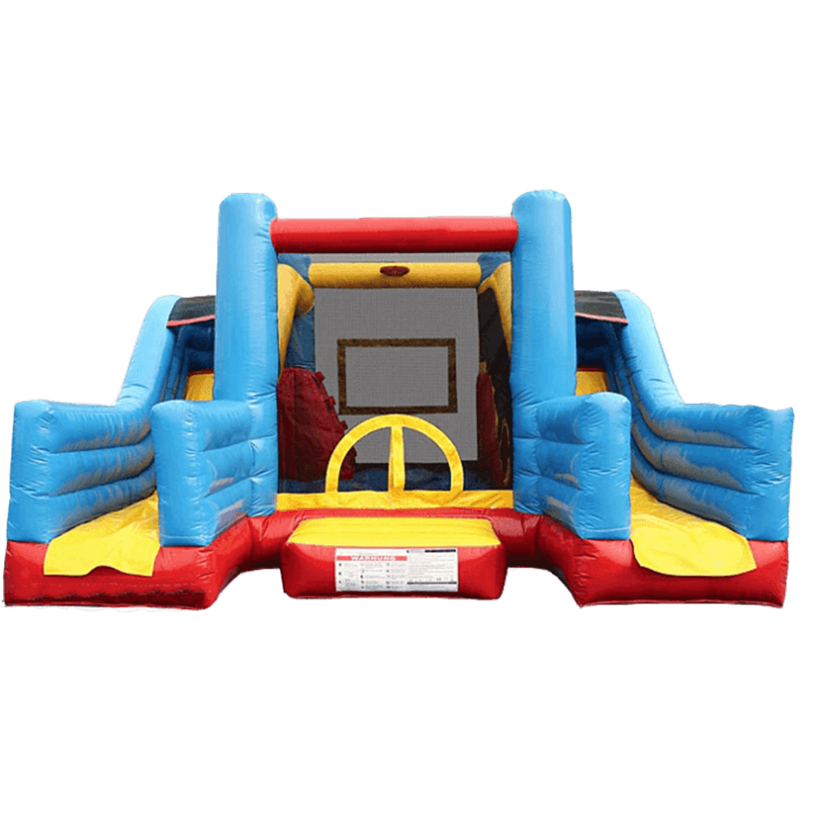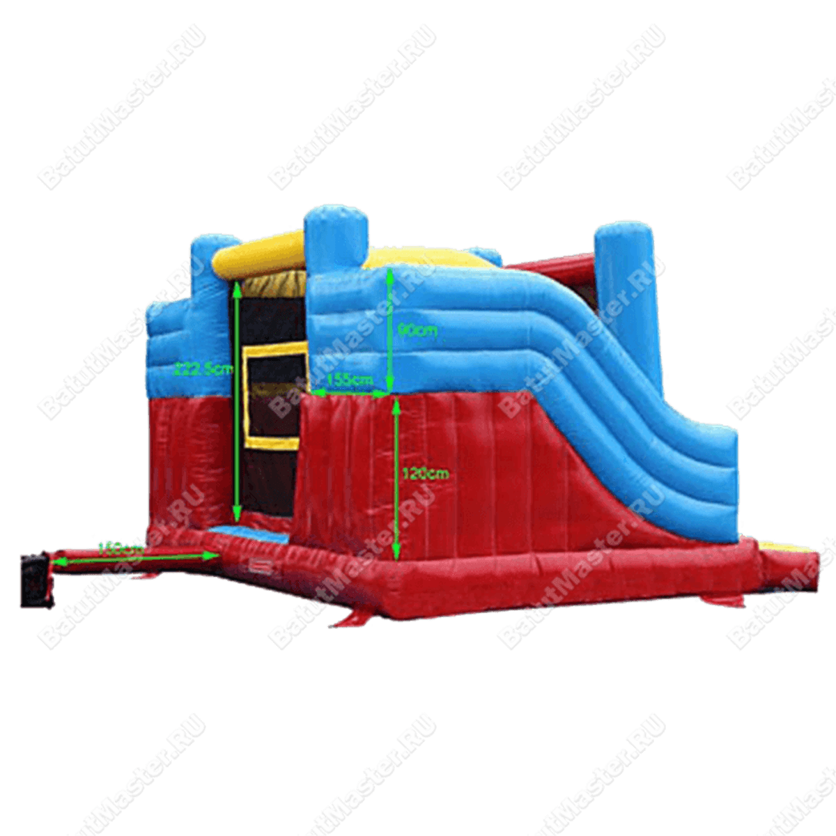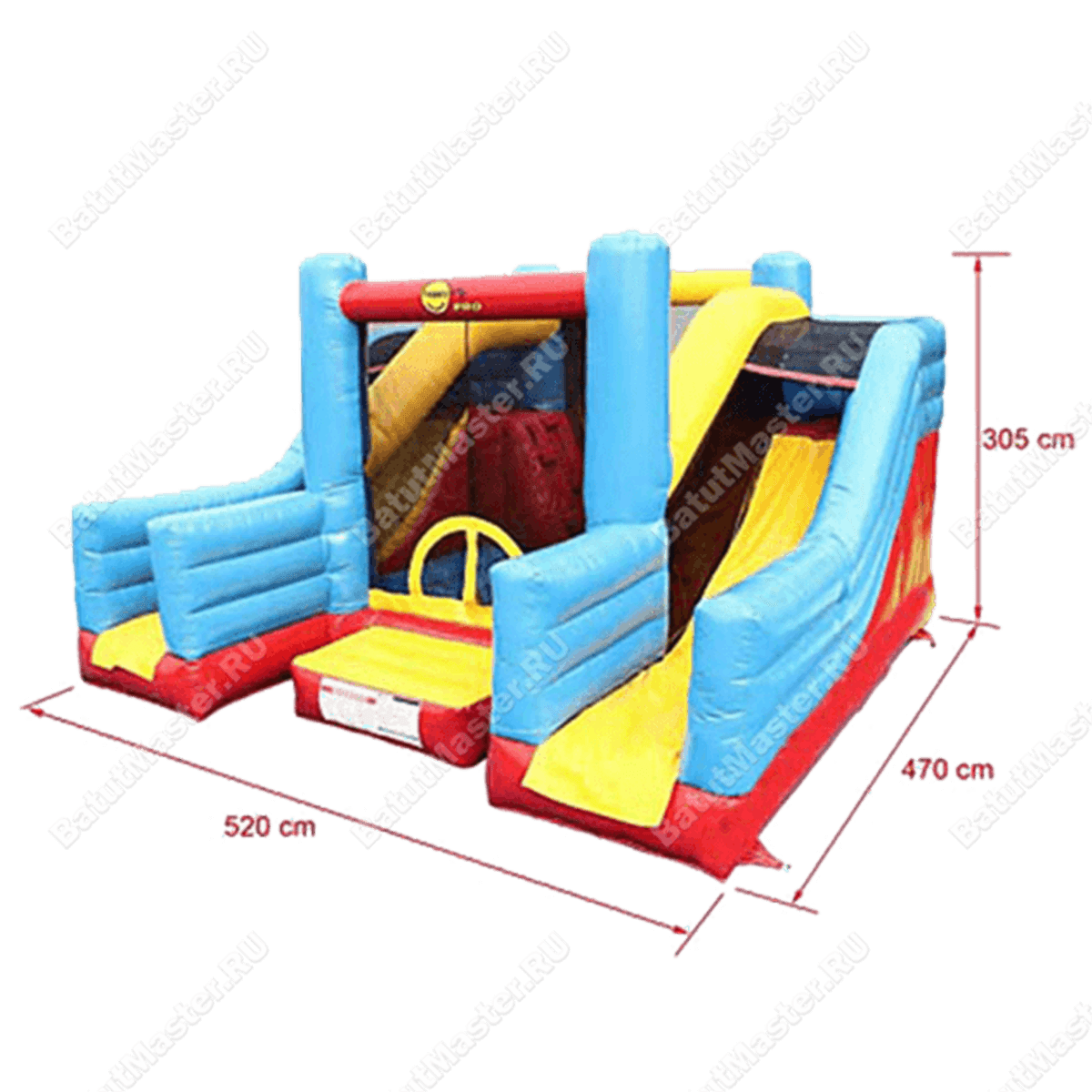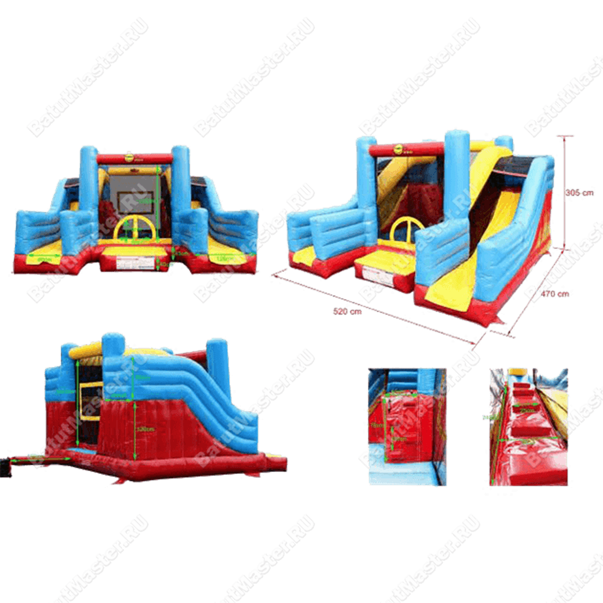 Оборудованный сразу двумя горками и площадкой в центре, батут может одновременно вмещать не одного ребенка, сразу несколько. Приоритетным цветом можно назвать синим, так как надувные горки, точнее, их высокие стены выполнены именно в таком цвете. Мягкая платформа, которую можно окрестить полом – красная. Сам спуск на горках устлан скользящей лентами желтой клеенки, это дает возможность повысить скорость прохождения препятствия.