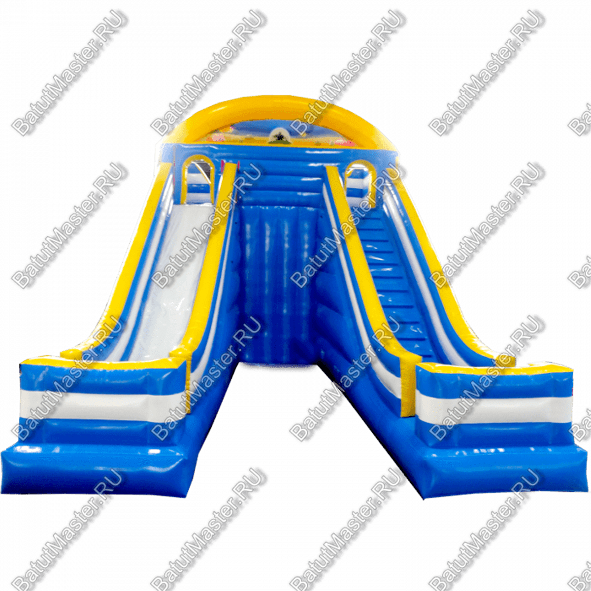 Коммерческий батут выполнен в голубом, белом и желтом цветах, он яркий и будет заметен издалека. Прыжки, спуски и кувыркания на таком комплексе развивает у детей силу, выносливость, координацию движений, а также в целом укрепляют физические данные.
