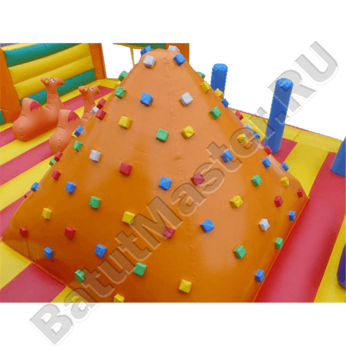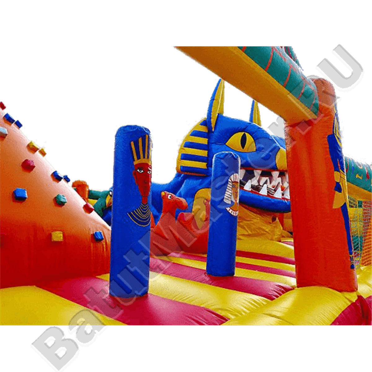Большая горка с боковым входом украшена изображением фараона, она имеет высокие безопасные борта. В центре прыгательной площади установлен скалодром в форме пирамиды с разноцветными ступенями. Большой надувной сфинкс служит в качестве безопасной зоны для прыгания самых маленьких клиентов. По всему периметру батута имеются дополнительные надувные элементы – столбы-лабиринты, фигурки для прыгания, вертикальные кольца и т.д.