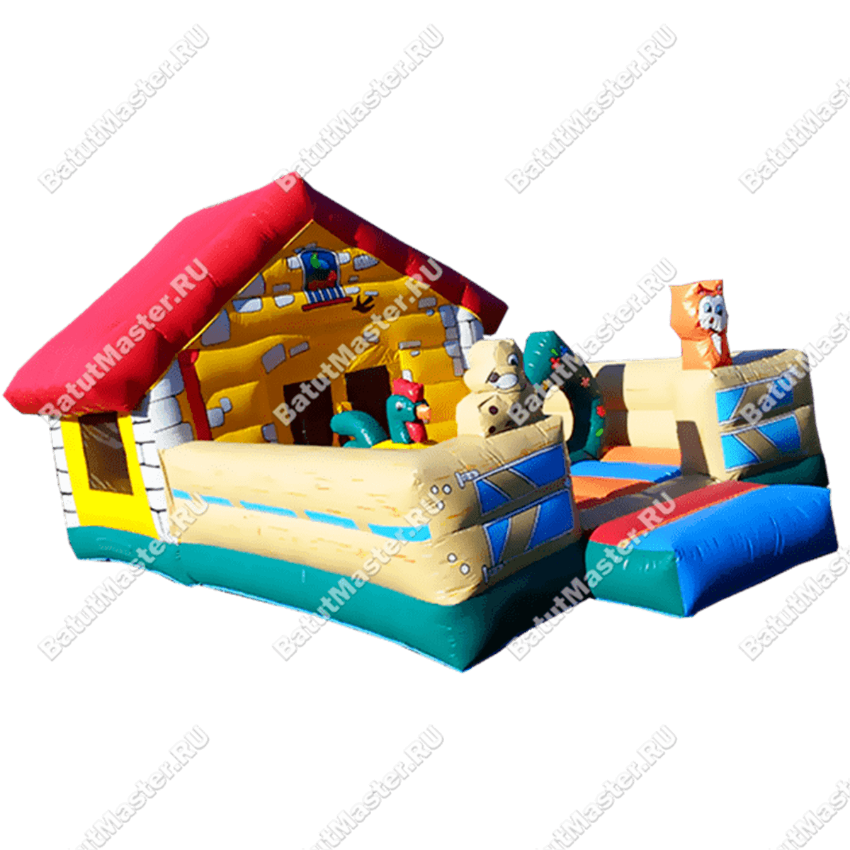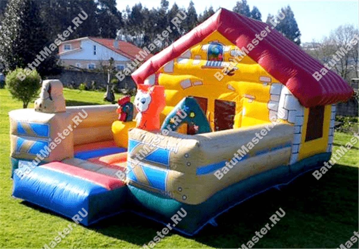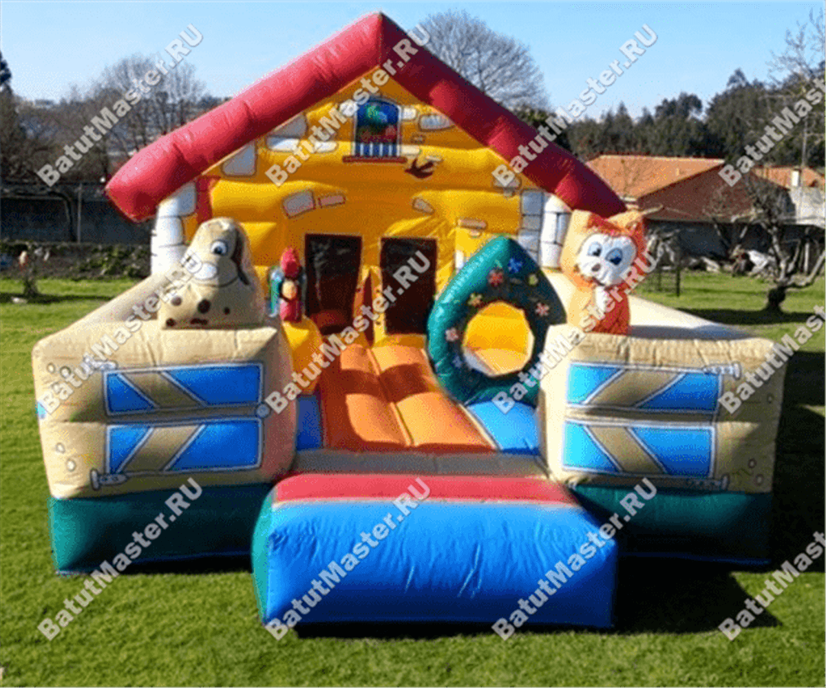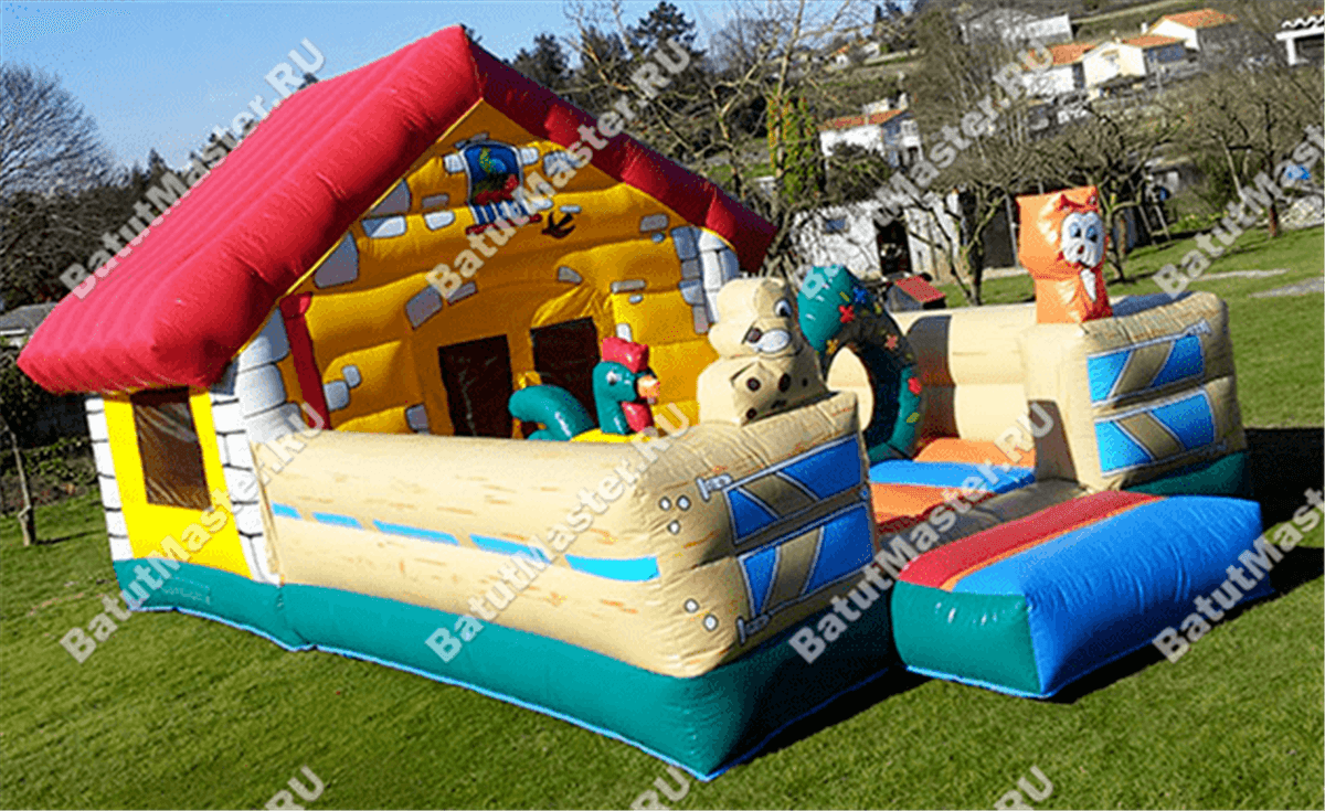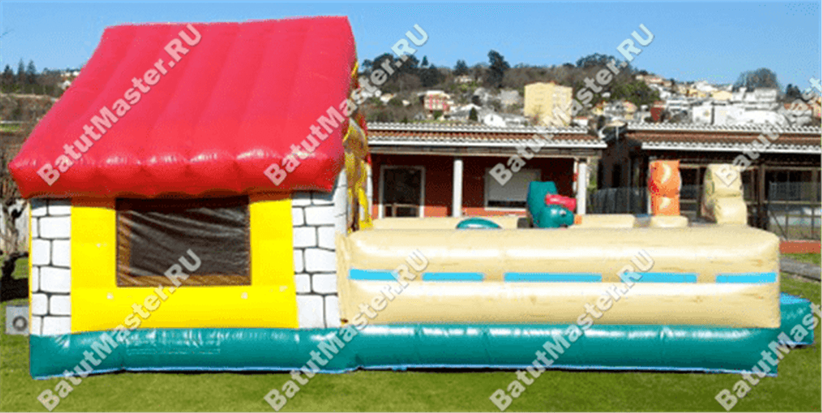 Коммерческий аттракцион можно считать универсальным, так как здесь есть место для тех, кто хочет оставаться на свежем воздухе и прыгать, но и есть целый дом с боковыми прозрачными окнами, дверями, внутри которого можно поиграть или укрыться от солнца или дождя.