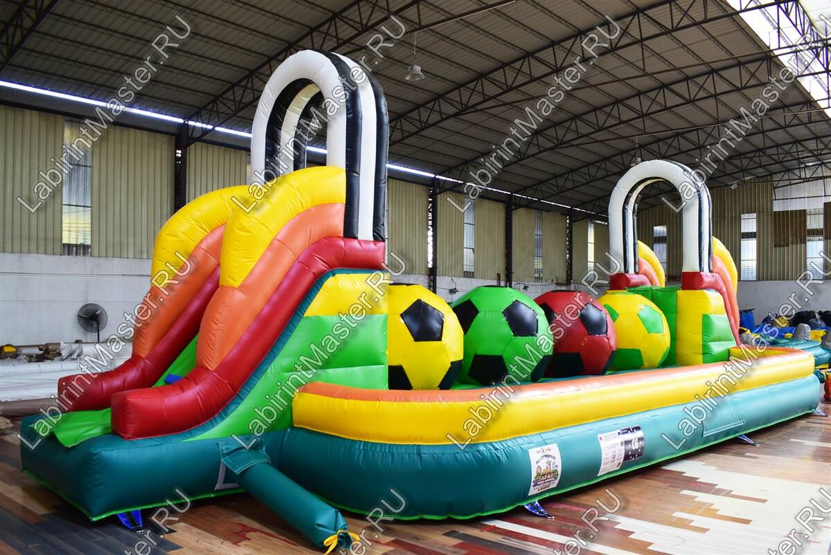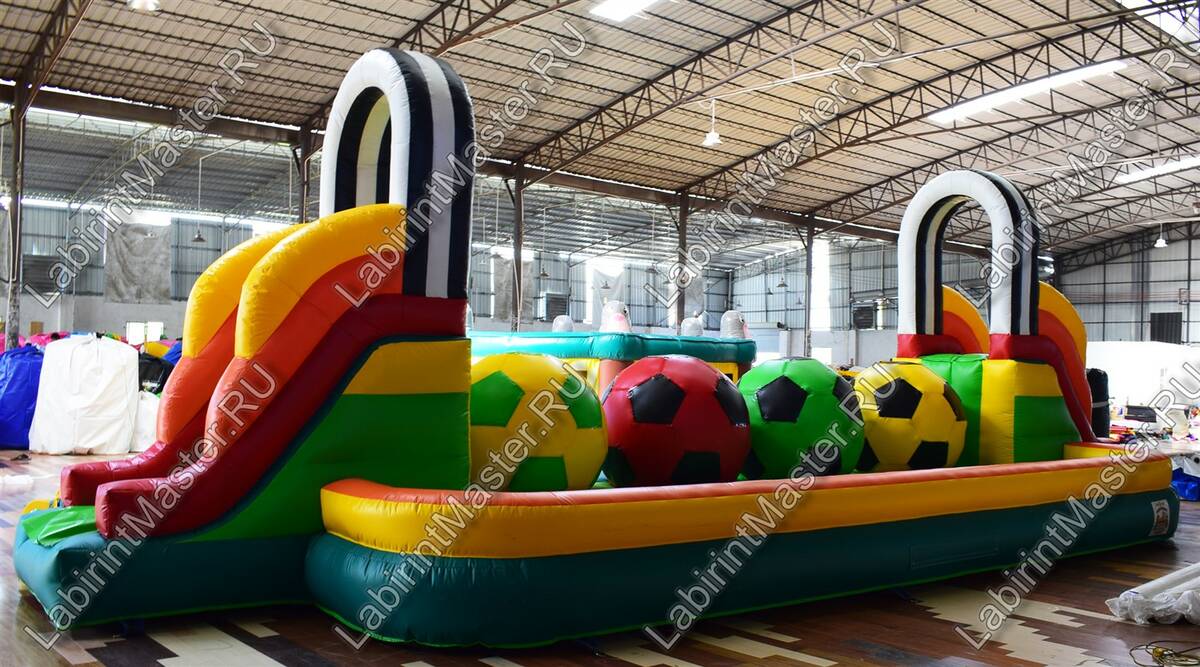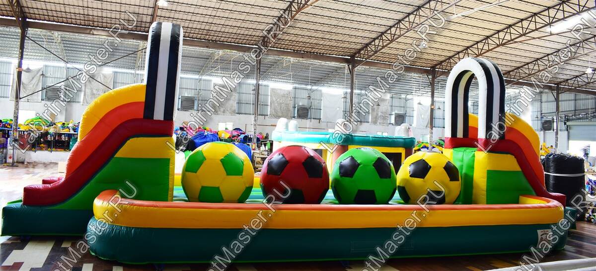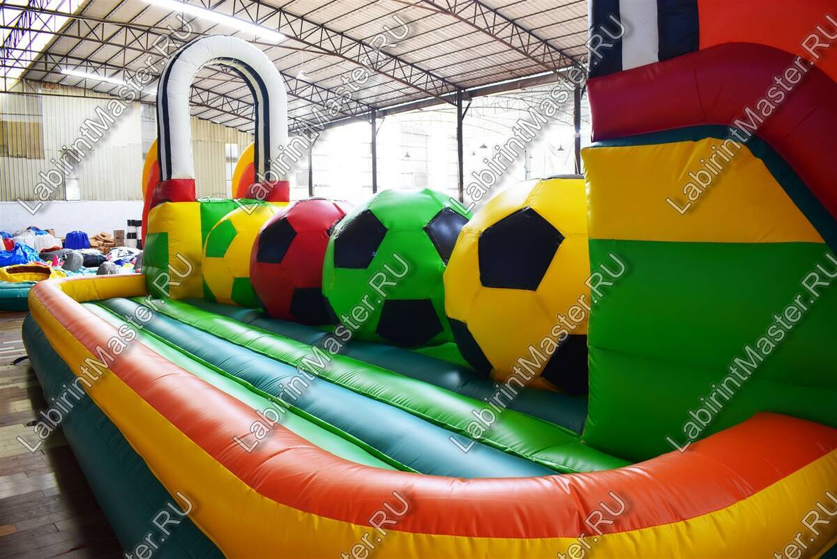 Надувной батут в тематике футбольной площадки привлечет внимание маленьких непосед. В юном возрасте забираться наверх, а потом спускаться вниз и снова забираться на препятствия – это именно то, что нужно. Яркий, интересный, он оснащен модулями в виде футбольных мячей, для того, чтоб можно было забираться наверх одновременно нескольким детям с разных сторон. Они будут должны забраться на верх каждого мяча, чтобы пройти дальше. Каждый непоседа придумает свою игру и стратегию, чтобы быстрее дойти до конца.