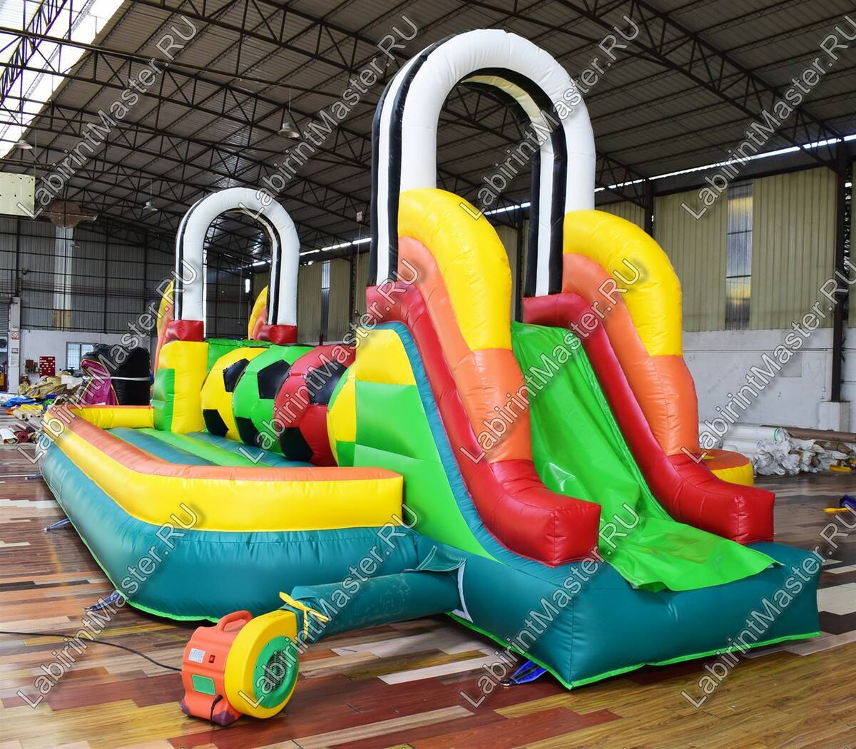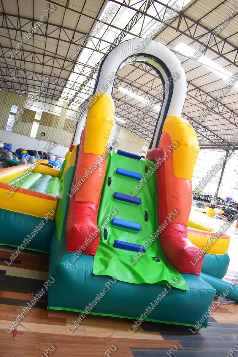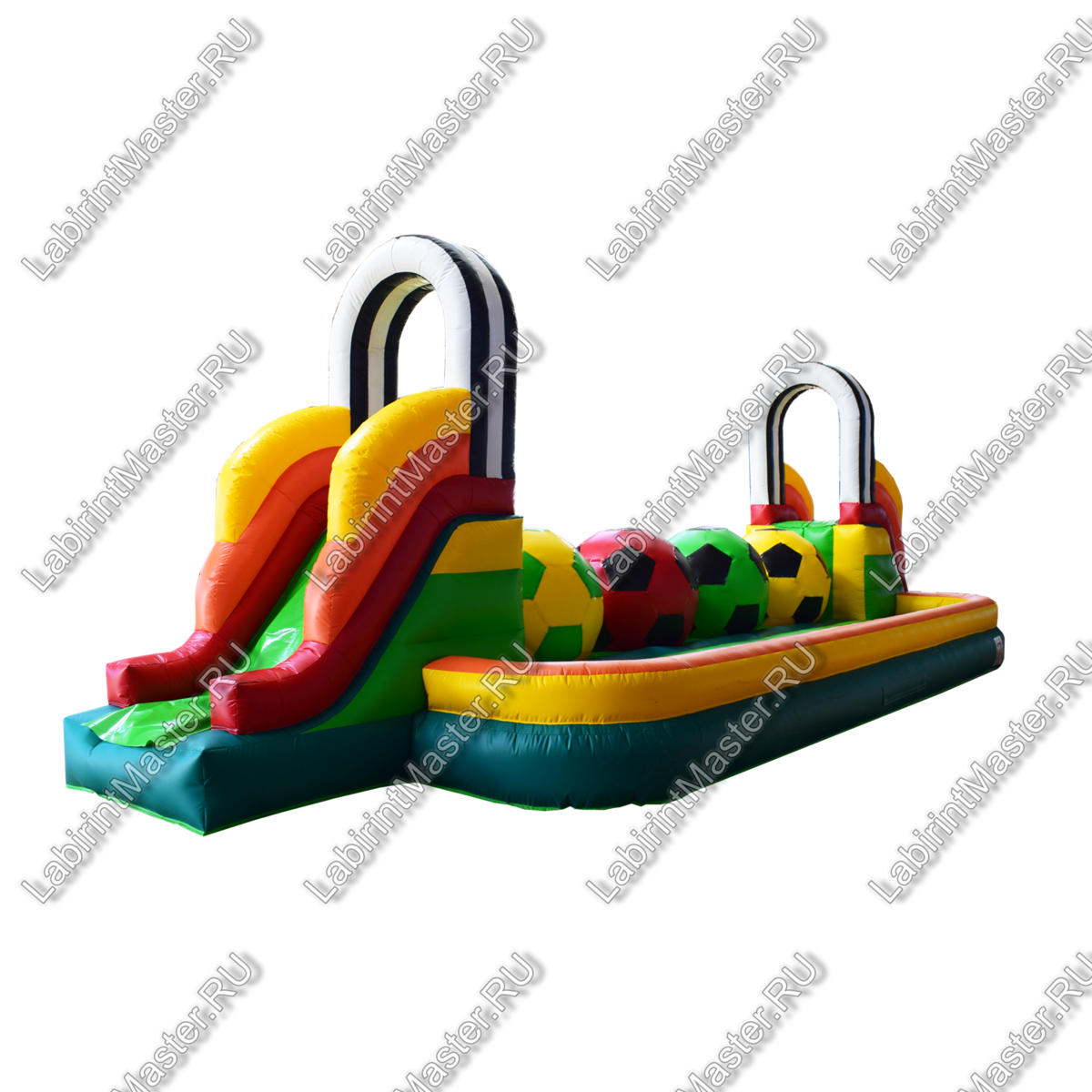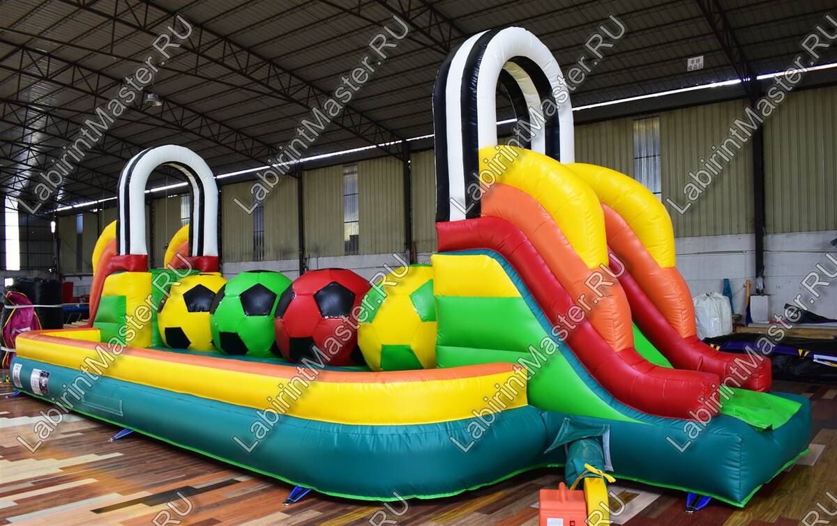 Надувной батут в тематике футбольной площадки привлечет внимание маленьких непосед. В юном возрасте забираться наверх, а потом спускаться вниз и снова забираться на препятствия – это именно то, что нужно. Яркий, интересный, он оснащен модулями в виде футбольных мячей, для того, чтоб можно было забираться наверх одновременно нескольким детям с разных сторон. Они будут должны забраться на верх каждого мяча, чтобы пройти дальше. Каждый непоседа придумает свою игру и стратегию, чтобы быстрее дойти до конца.