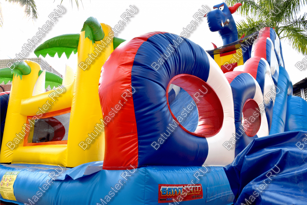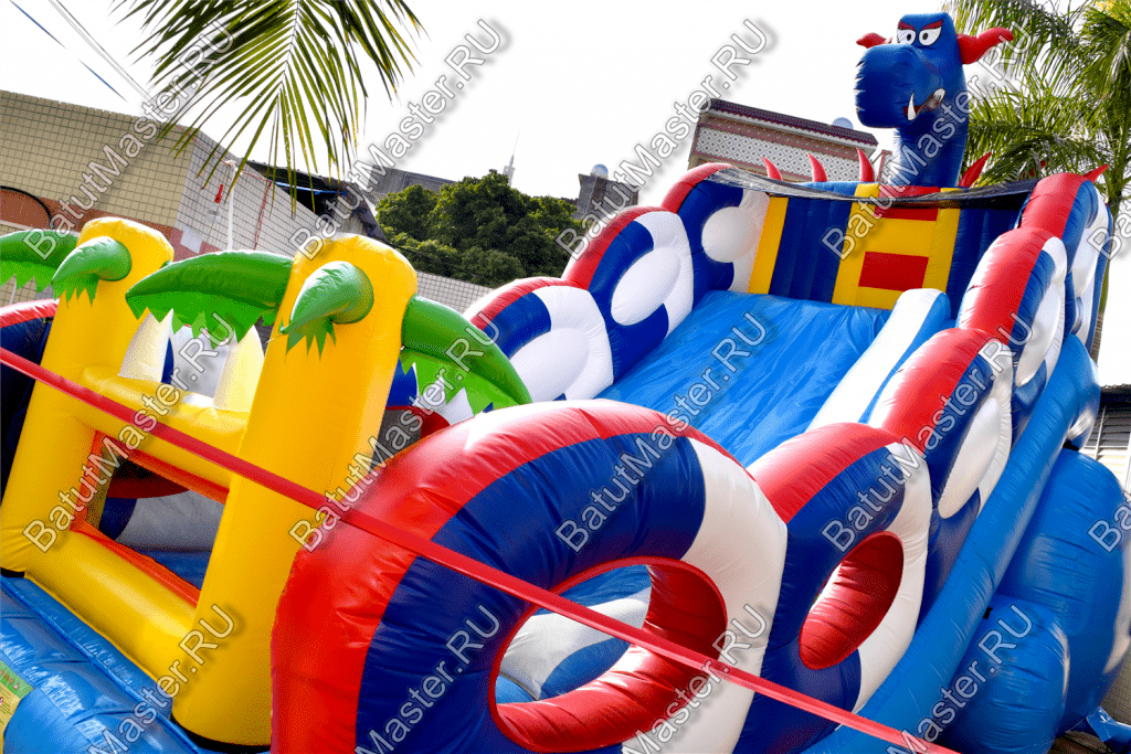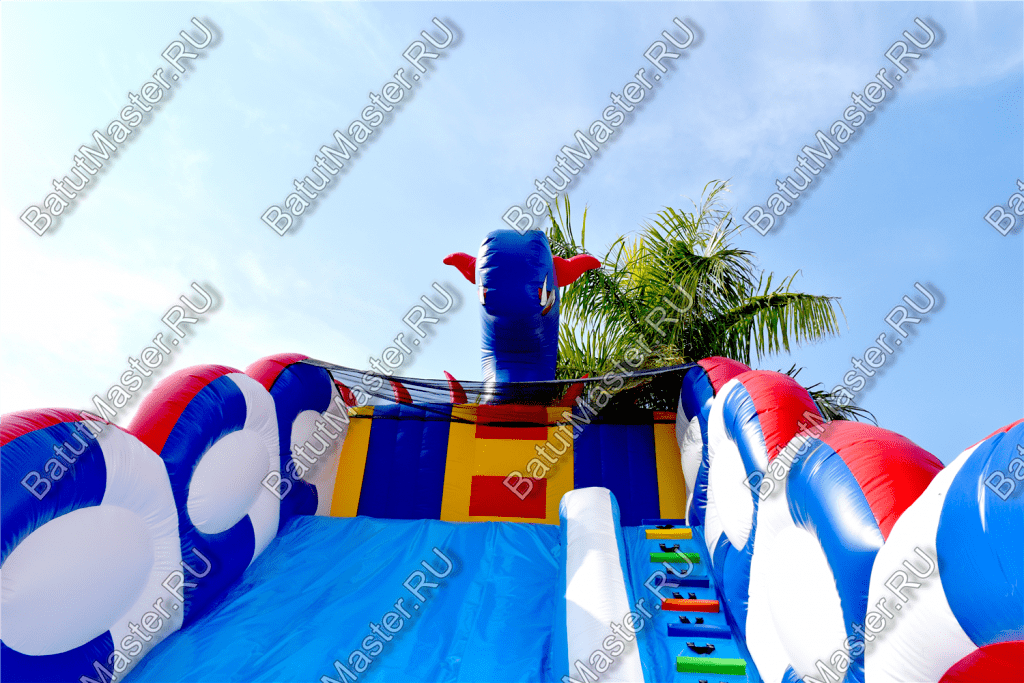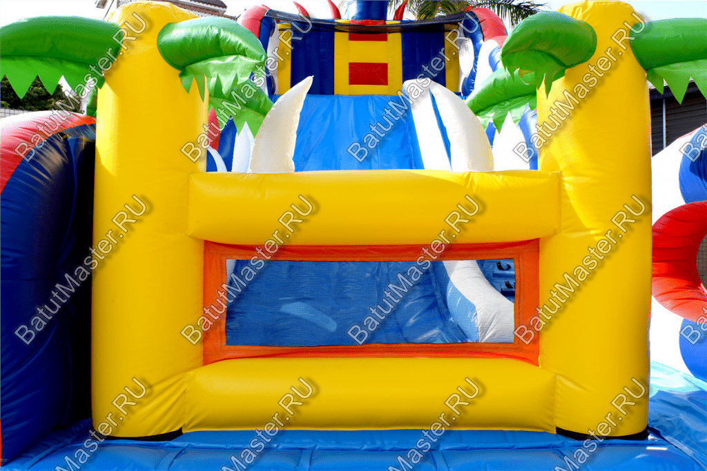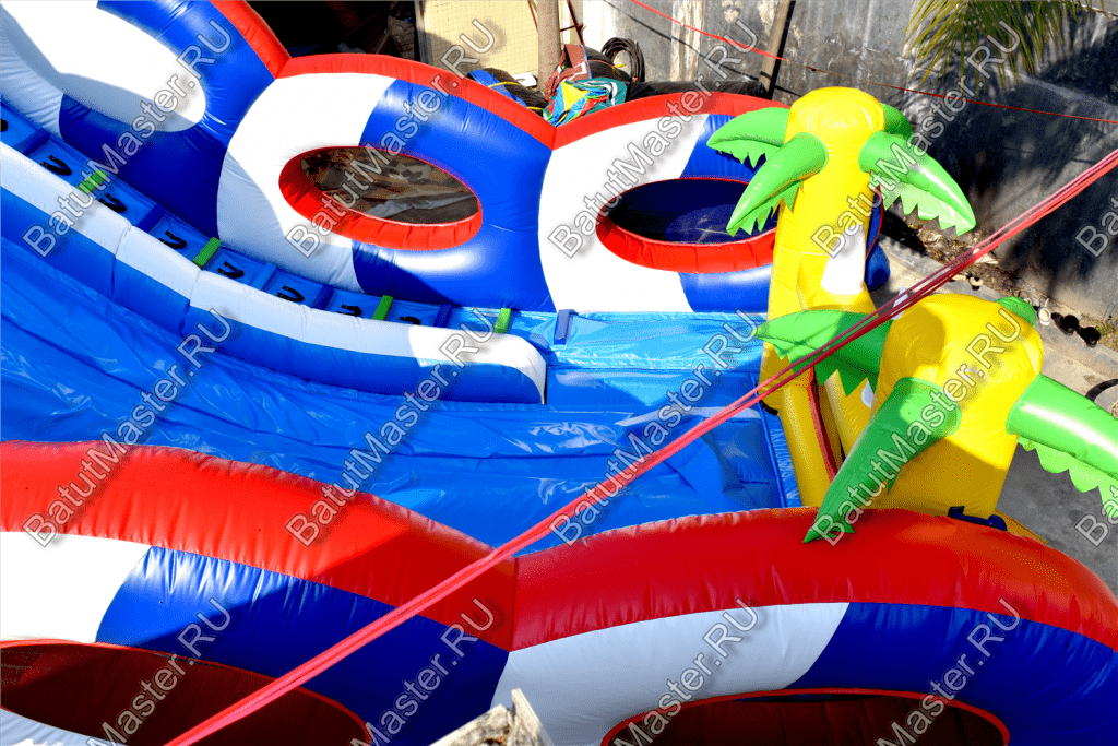 Вход не менее оригинален – в углу батута. Окончание спуска оформлено надувными пальмами с защитной сеткой между ними. Большая вместимость батута обусловила создать множество элементов с отверстиями (кольца на боках, окно между пальмами) для лучшей циркуляции воздуха внутри игровой площадки.