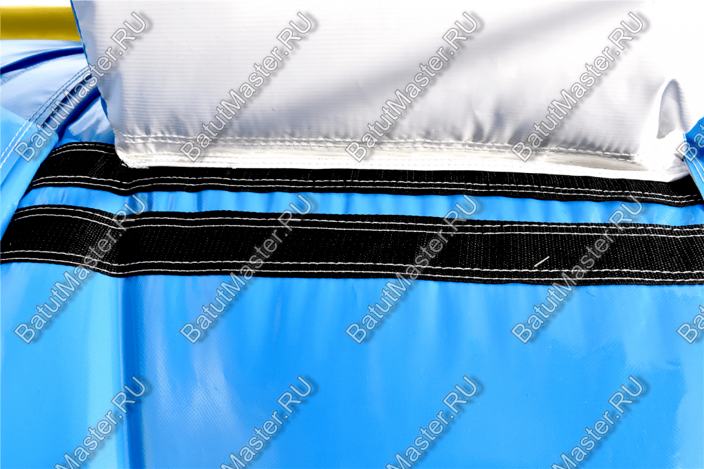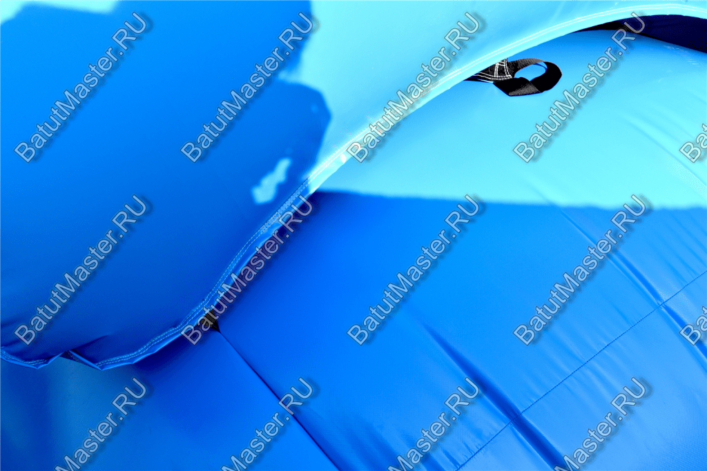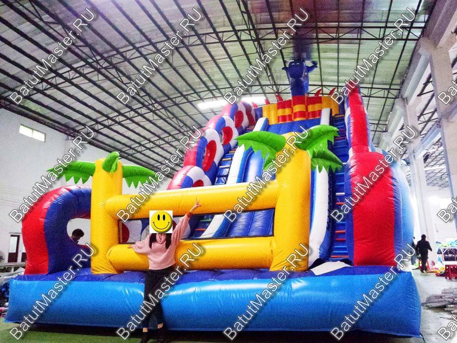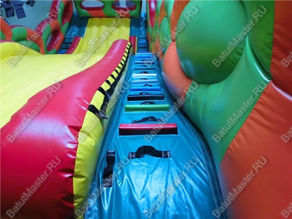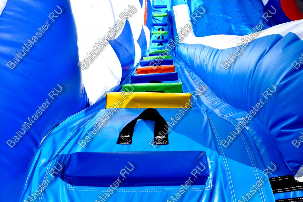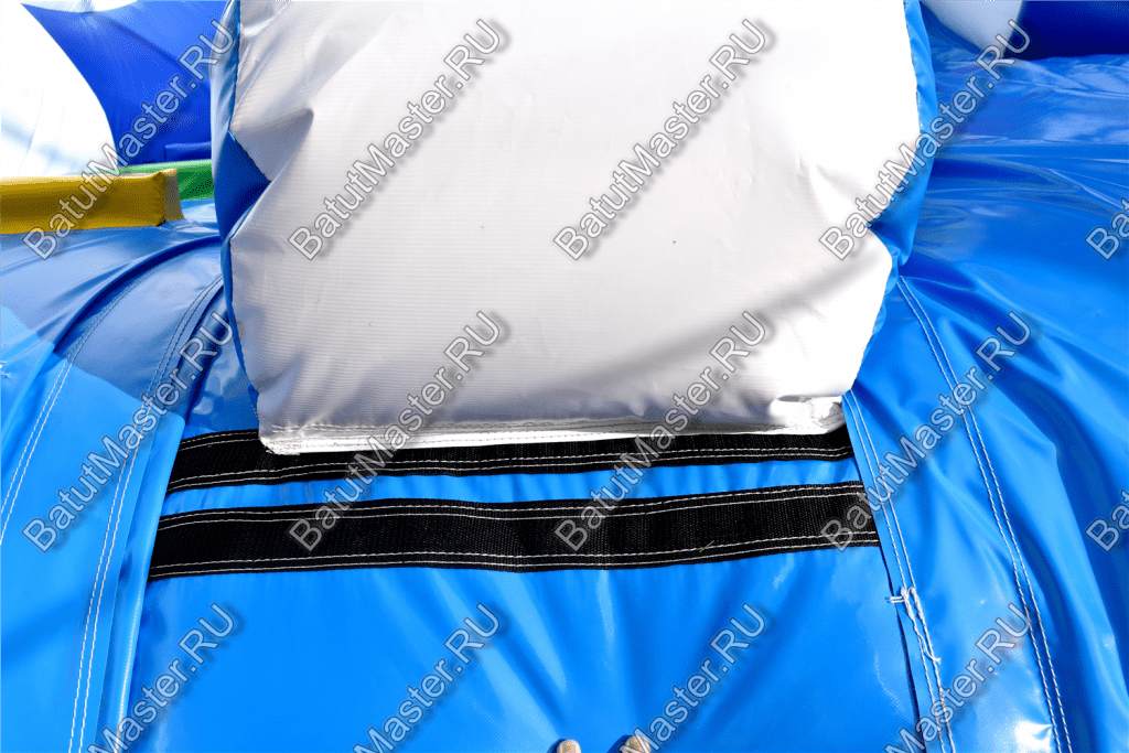 Вход не менее оригинален – в углу батута. Окончание спуска оформлено надувными пальмами с защитной сеткой между ними. Большая вместимость батута обусловила создать множество элементов с отверстиями (кольца на боках, окно между пальмами) для лучшей циркуляции воздуха внутри игровой площадки.