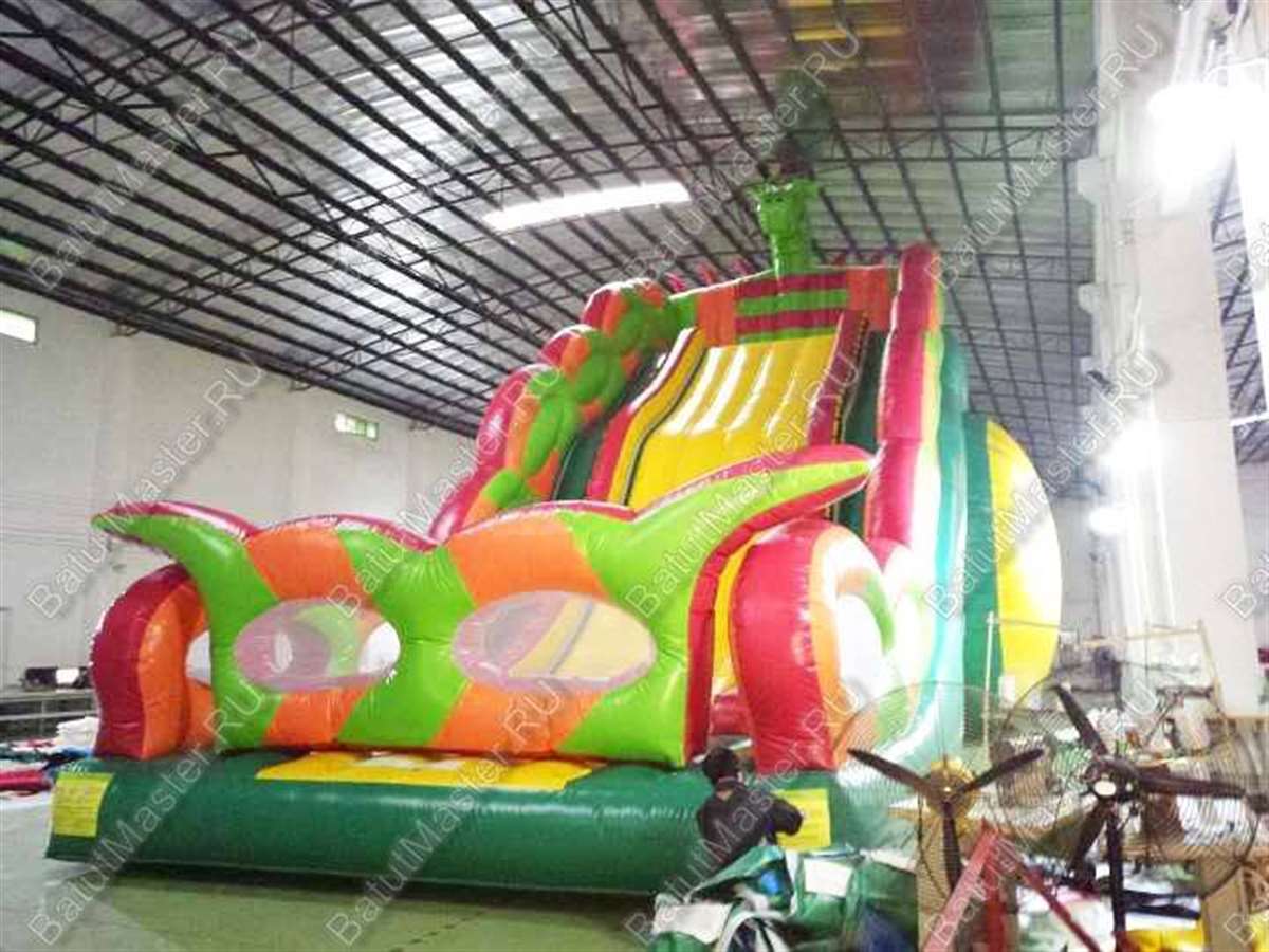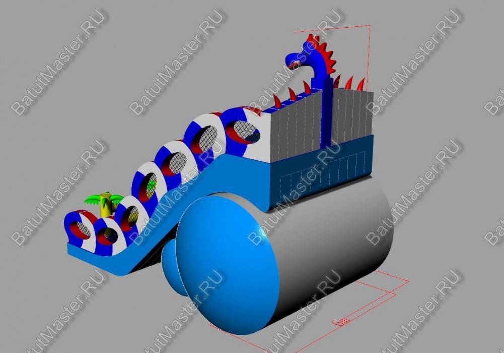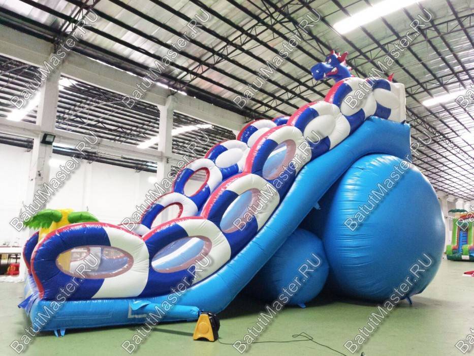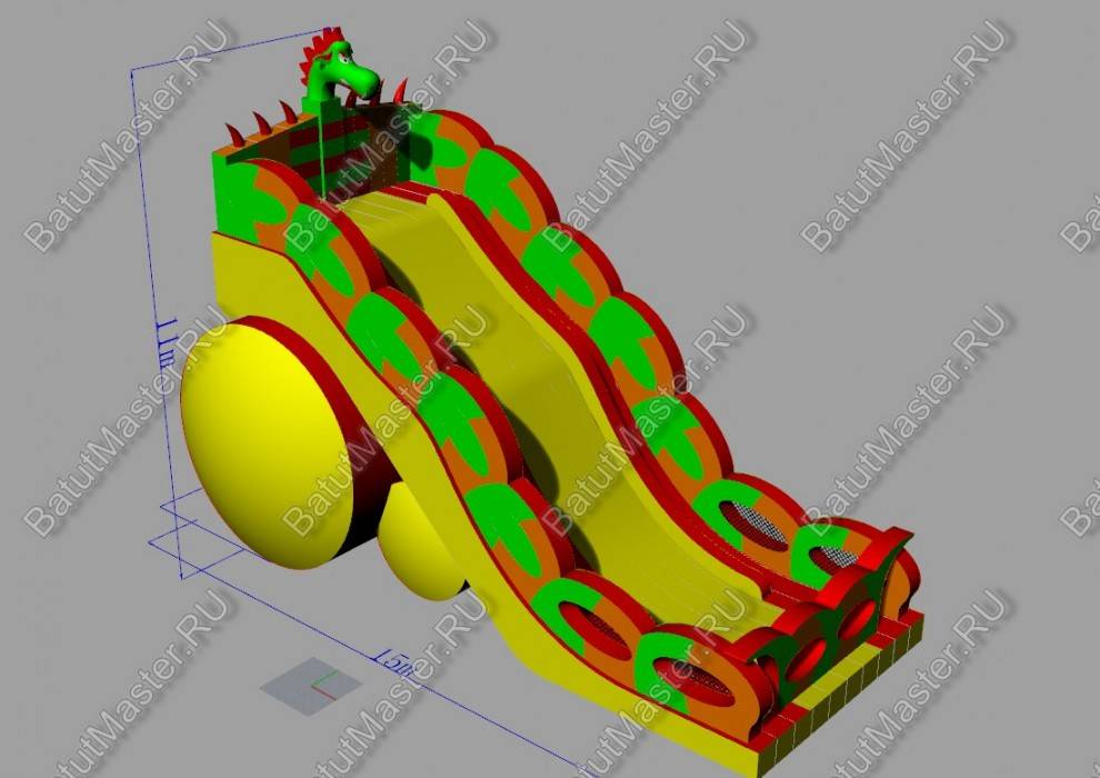 Надувной батут «Дракон» общей площадью в 105 м² предназначен для бизнеса, поэтому за один прокат он может одновременно вместить на своей площадке более 30 детей. Учитывая достаточно габаритные размеры коммерческого аттракциона (15 на 7 м), нижняя стенка опирается на 2 надувных цилиндра, расположенных с тыльной стороны. Фасад конструкции выполнен в виде желтого надувного ограждения с пальмами по бокам. Справа и слева от этого элемента выполнены два проема, по которым дети могут войти внутрь батута. После того, как ребенок окажется на площадке, он сможет попрыгать и размяться, а затем приступить к более серьезным развлечениям: отправиться вверх по лестнице на стартовую площадку, где и установлена надувная голова дракона.