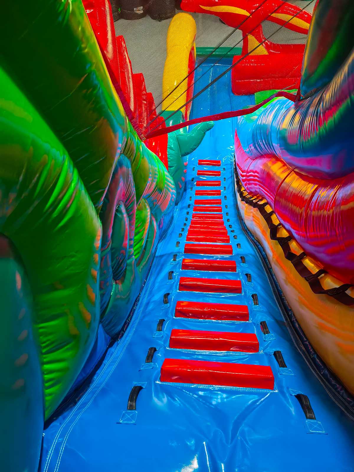 Внутри конструкции предусмотрена высокая горка со стартовой высотой 3,5 метров, широкая зона для прыжков и мягкая посадочная зона. Яркие цвета — красный, жёлтый, синий, зелёный — усиливают эффект вау у посетителей и формируют атмосферу веселья и адреналина.