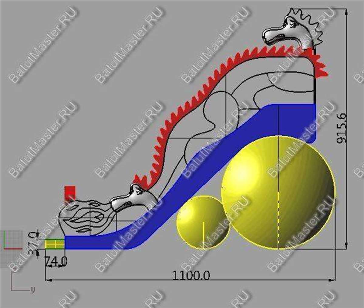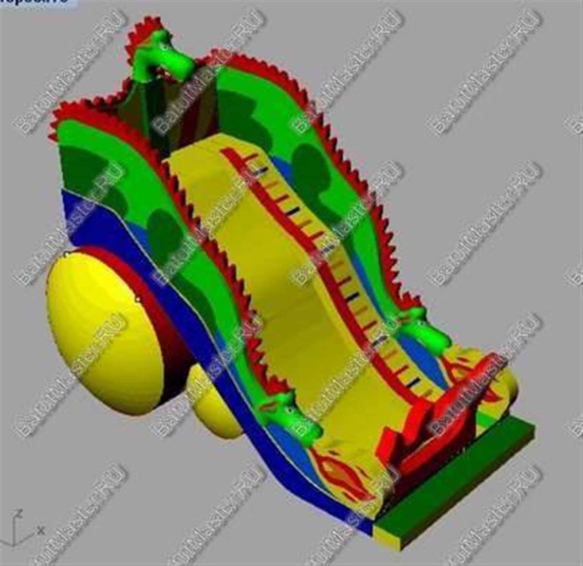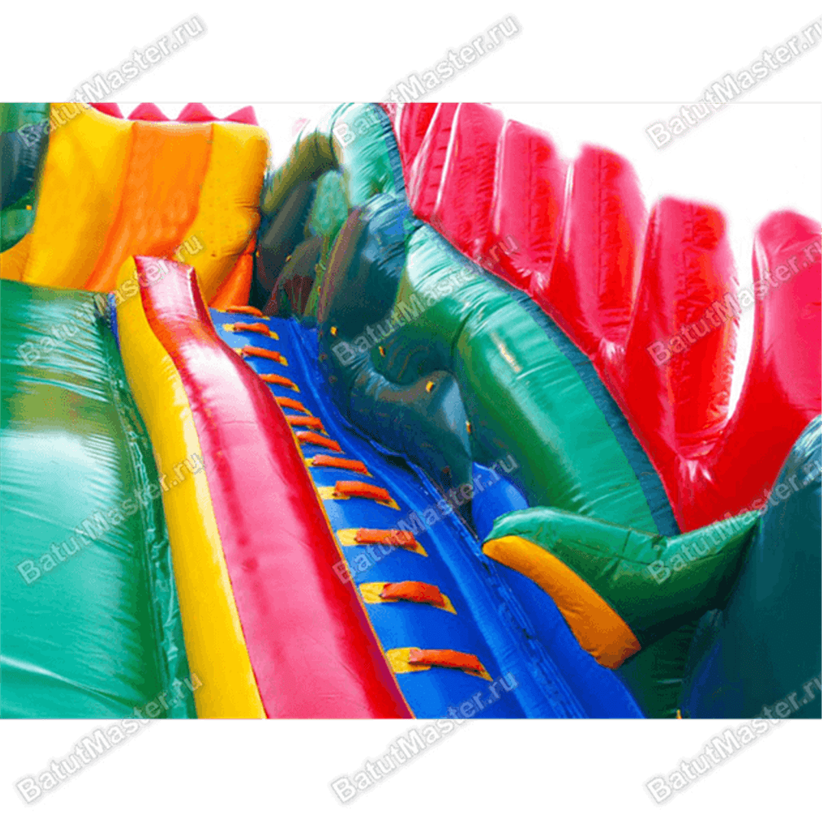 Начинается развлечение с небольшой прыгательной площадки, оборудованной с двух сторон яркими желто-красными надувными стенками в виде огненного пламени и голов дракона. Именно отсюда вверх начинают подниматься красные шиповидные гребни из ПВХ, создающие впечатление, что боковые стены – это настоящее туловище дракона, которое оберегает детей и создает атмосферу настоящей сказки. Верхняя часть коммерческого аттракциона (горка) разделена на 3 склиза: боковые полотна выполняют функцию лестниц, а центральный склиз – это широкая горка, по которой можно спуститься вниз дружной командой.